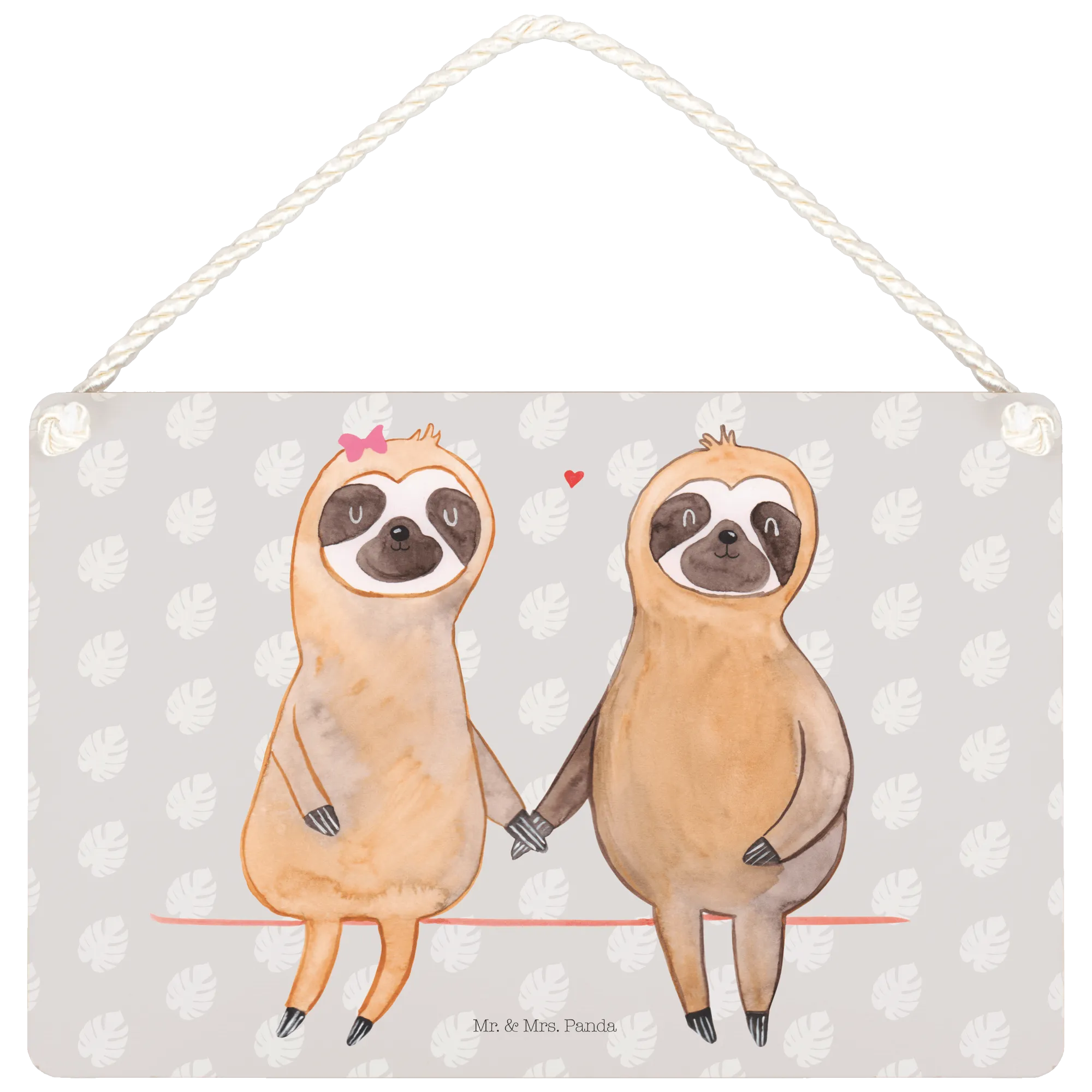 Ein Herz für Langsamkeit und Liebe: Das Deko Schild "Faultier Pärchen" aus der Faultier - Kollektion von Mr. & Mrs. Panda bringt süße Romantik und entspannte Gemütlichkeit in Dein Zuhause. Das handgezeichnete Aquarell eines verliebten Faultierpärchens zeigt zwei Tiere, die sich an den Händen halten und gemeinsam die Ruhe genießen. Der sanfte Grau-Pastell-Hintergrund passt perfekt zu Vintage, Shabby Chic und modernen Wohnstilen.