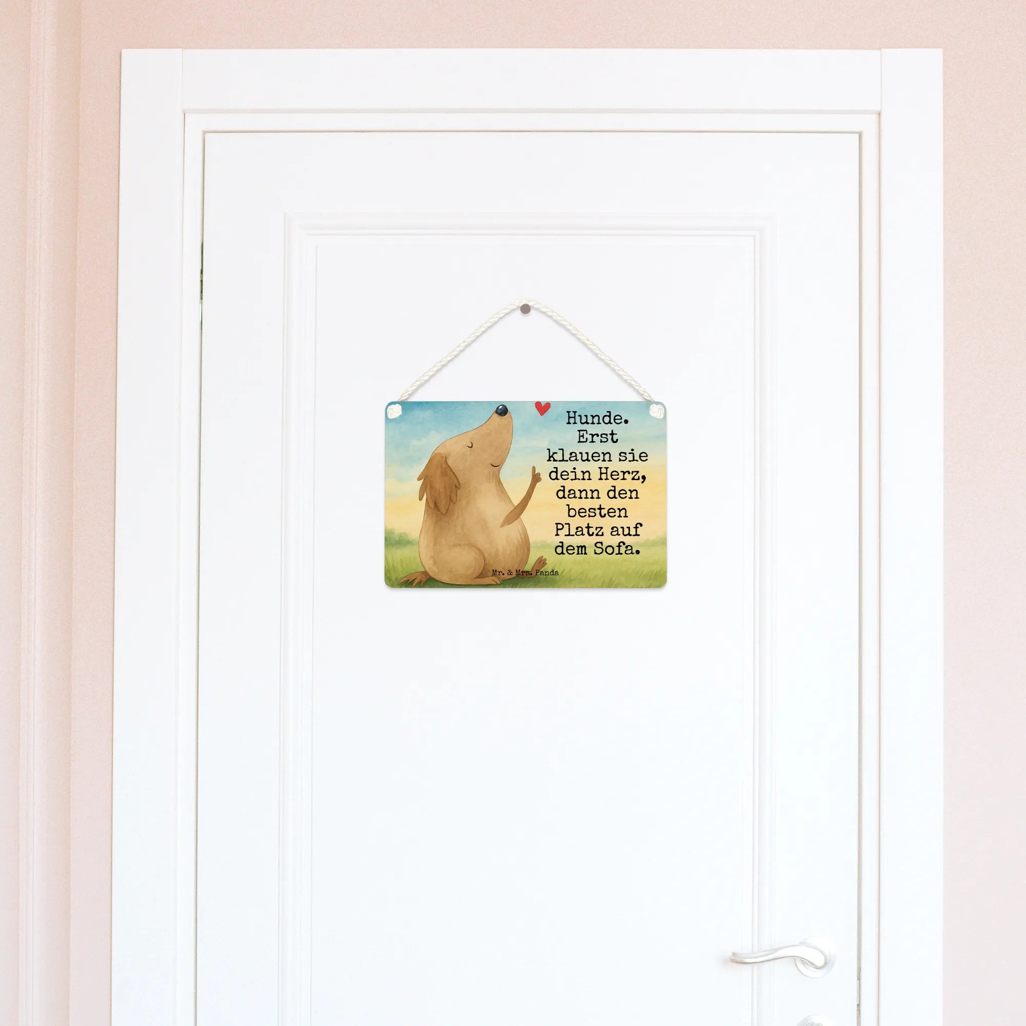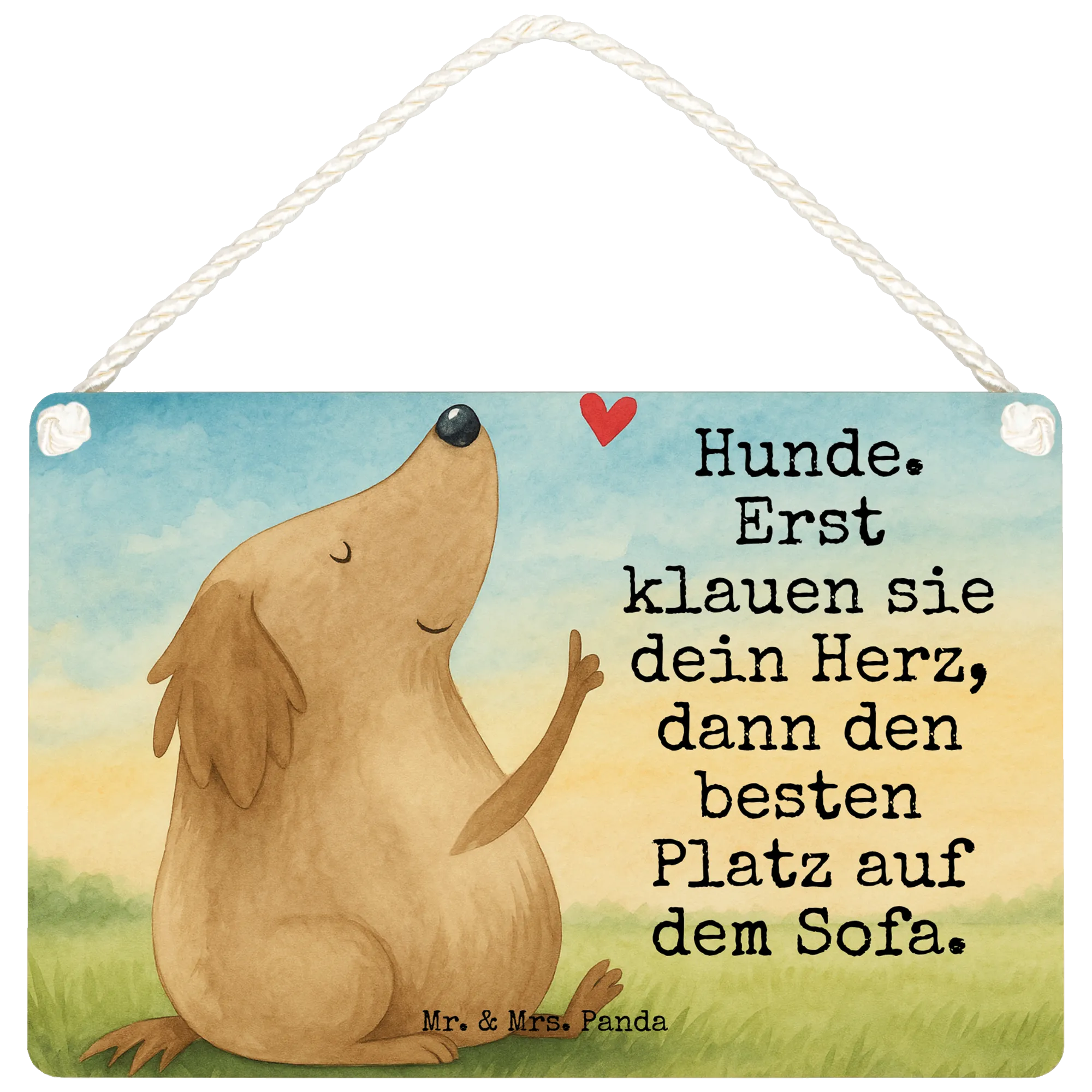 Mr. & Mrs. Panda presents: Unser liebevolles Deko Schild "Hund Liebe" aus der Hunde Kollektion – ein perfektes Geschenk für alle Hundebesitzer und Tierfreunde. Das Motiv zeigt einen fröhlichen Hund, der ein kleines Herz zeigt, kombiniert mit dem herzlichen Spruch „Hunde. Erst klauen sie dein Herz, dann den besten Platz auf dem Sofa.“ Dieses Schild bringt sofort Wärme und Humor in jeden Raum.