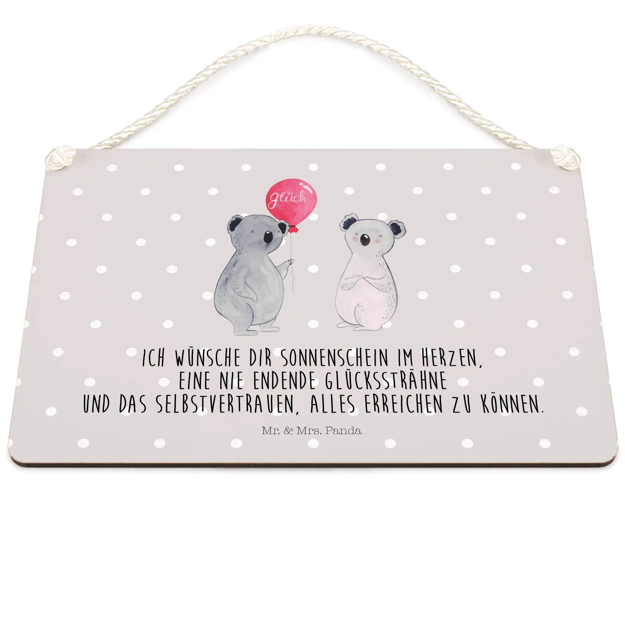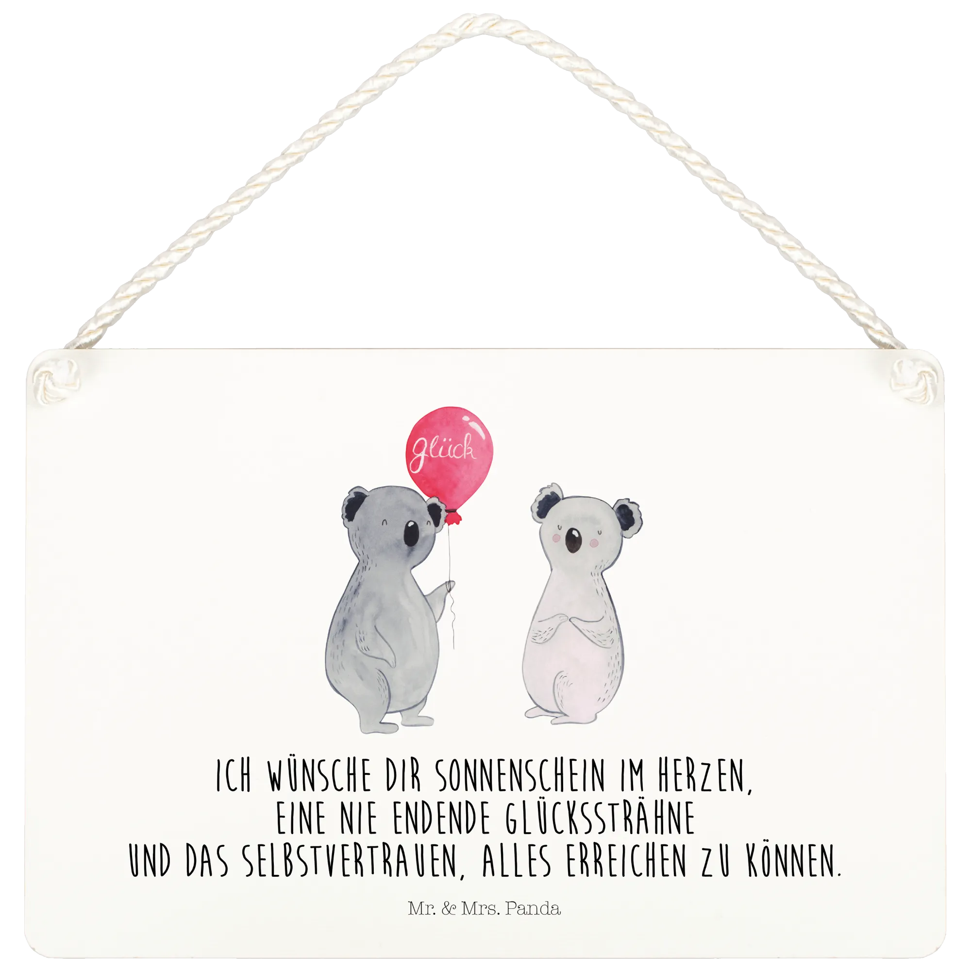 Entdecke das zauberhafte Deko Schild mit dem süßen Koala Motiv, perfekt für jeden Anlass! Dieses wunderschöne und edle Deko Schild von Mr. & Mrs. Panda zeigt zwei fröhliche Koalas, die mit einem bunten Luftballon feiern. Der Spruch 'Ich wünsche dir Sonnenschein im Herzen, eine nie endende Glückssträhne und das Selbstvertrauen, alles erreichen zu können' macht es zu einem ganz besonderen Geschenk, das Herzen erhellt und Glück verbreitet.