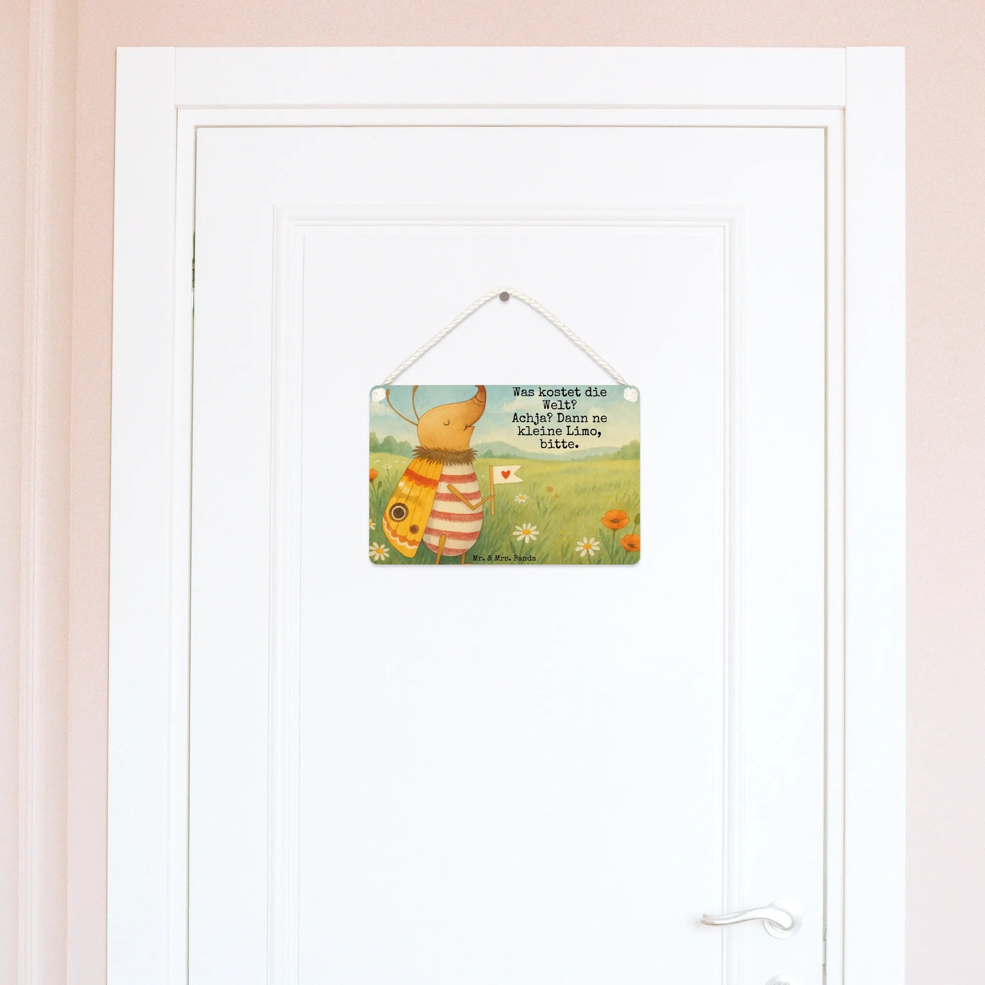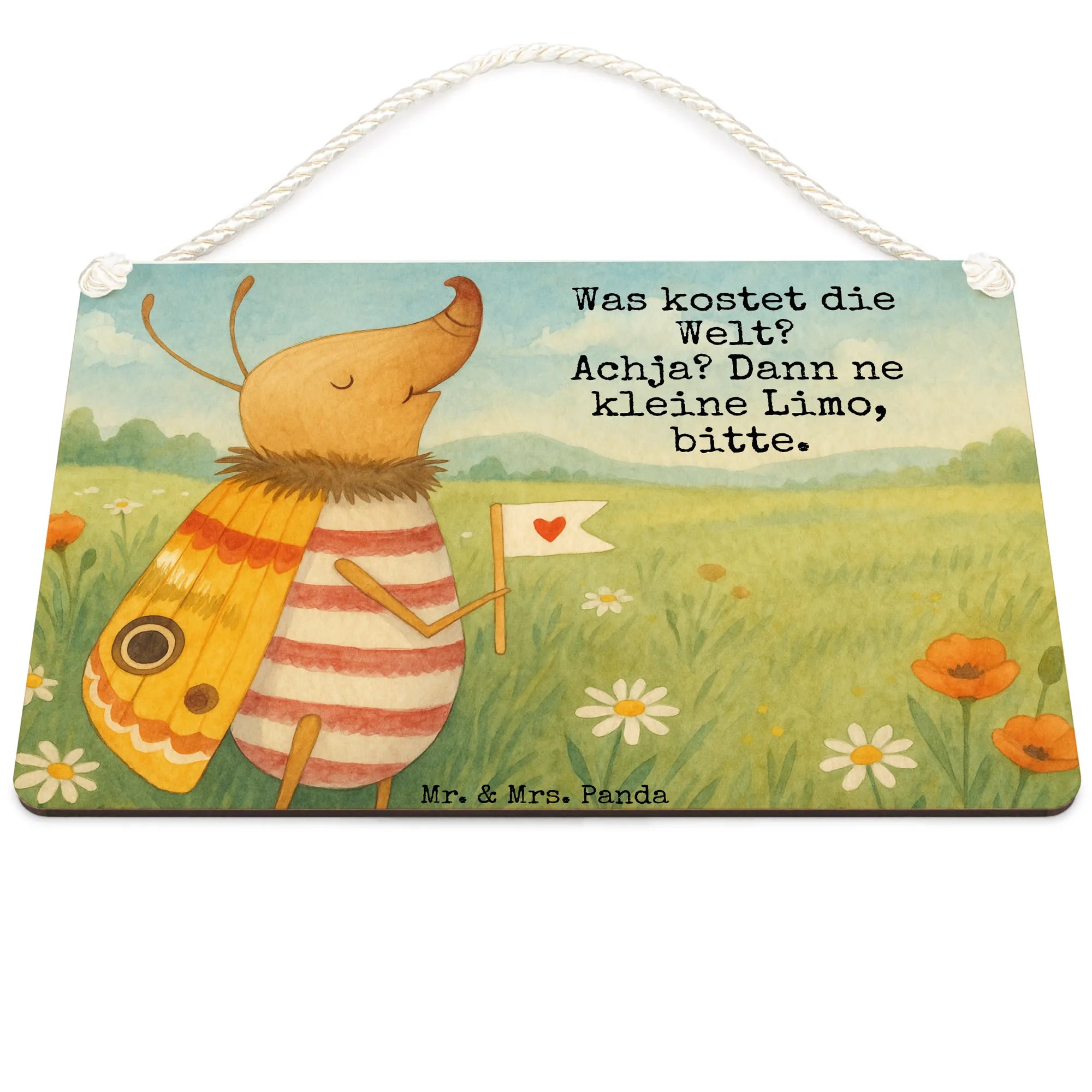 In einer Welt, in der alles möglich scheint, bringt uns ein winziger, vergnügter Nachtfalter zurück zur Einfachheit mit einem herzerwärmenden Motiv. Der Käfer, fröhlich ein Herz auf seiner Fahne tragend, vermittelt eine Botschaft von unbeschwerter Freude und Optimismus. 'Was kostet die Welt? Achja? Dann ne kleine Limo, bitte.' – dieser Spruch lässt uns schmunzeln und gibt uns die Erlaubnis, uns über die kleinen Dinge im Leben zu freuen. Es ist eine humorvolle Erinnerung daran, dass Glück nicht immer teuer oder schwer zu finden ist. Manchmal ist es so einfach wie eine kleine Erfrischung, eine Limo. Dieses Motiv ist perfekt, um jedem Raum eine verspielte und zugleich niedliche Note zu verleihen. Mr. & Mrs. Panda haben es wieder geschafft, alltägliche Weisheit mit einer Prise Spaß zu verbinden.