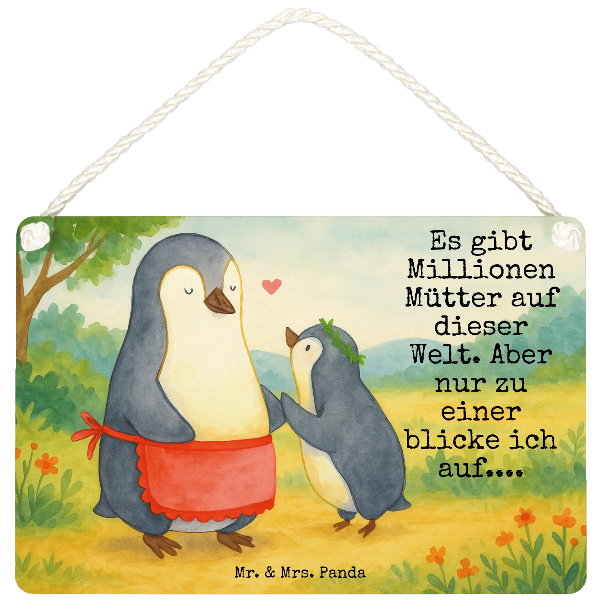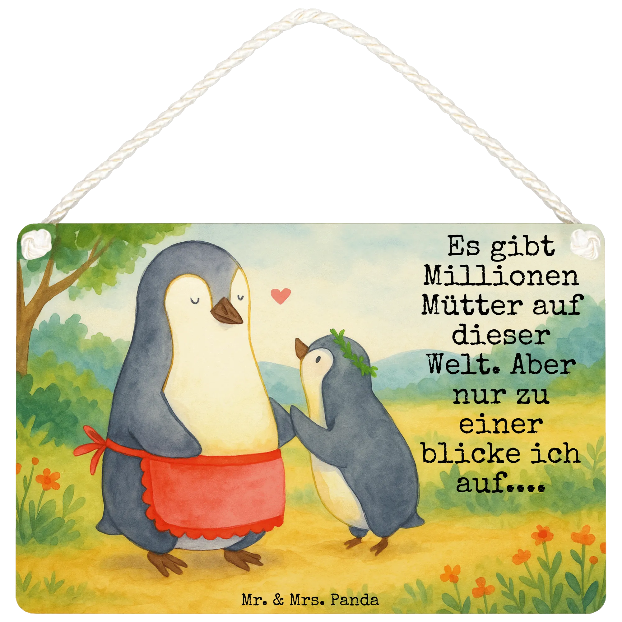 Willkommen in der lieblichen Welt von Mr. & Mrs. Panda, wo Liebe und Zuneigung in jedem Motiv sichtbar werden. In diesem bezaubernden Bild erfährst du die herzliche Beziehung zwischen einer Mutter-Pinguin mit ihrer kleinen Schar von einem Pinguin, der voller Bewunderung zu ihr aufblickt. Mit ihrer roten Schürze strahlt die Mama-Pinguin Wärme aus, während das kleine Herz, das zwischen ihnen schwebt, die enge Bindung versinnbildlicht. Das Motto "Es gibt Millionen Mütter auf dieser Welt. Aber nur zu einer blicke ich auf...." handelt von der einmaligen Beziehung, die wir zu unseren Müttern haben. Es ist das ideale Geschenk, um die Liebe und die Hingabe von Müttern zu zelebrieren, sei es an ihrem Geburtstag oder zum Muttertag.