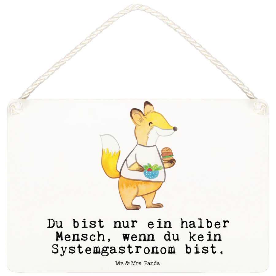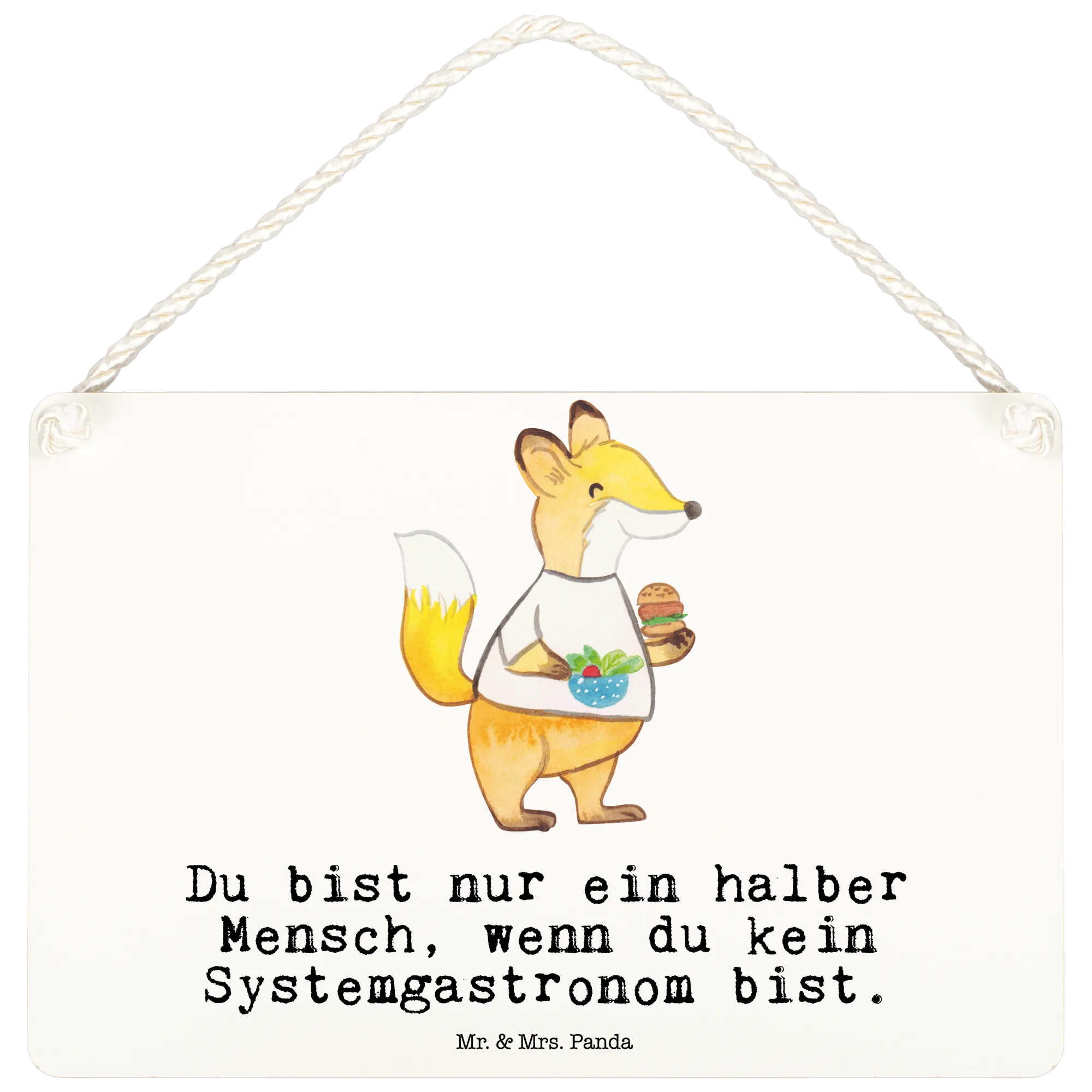 Das Deko Schild „Systemgastronom mit Herz“ von Mr. & Mrs. Panda ist das perfekte Geschenk für alle, die das Gastgewerbe mit Leidenschaft leben. Mit seinem liebevollen Design, das einen süßen Fuchs zeigt, der einen frisch zubereiteten Burger und einen Salat serviert, bringt dieses Schild Freude und Farbe in jede Küche oder Speisekammer.