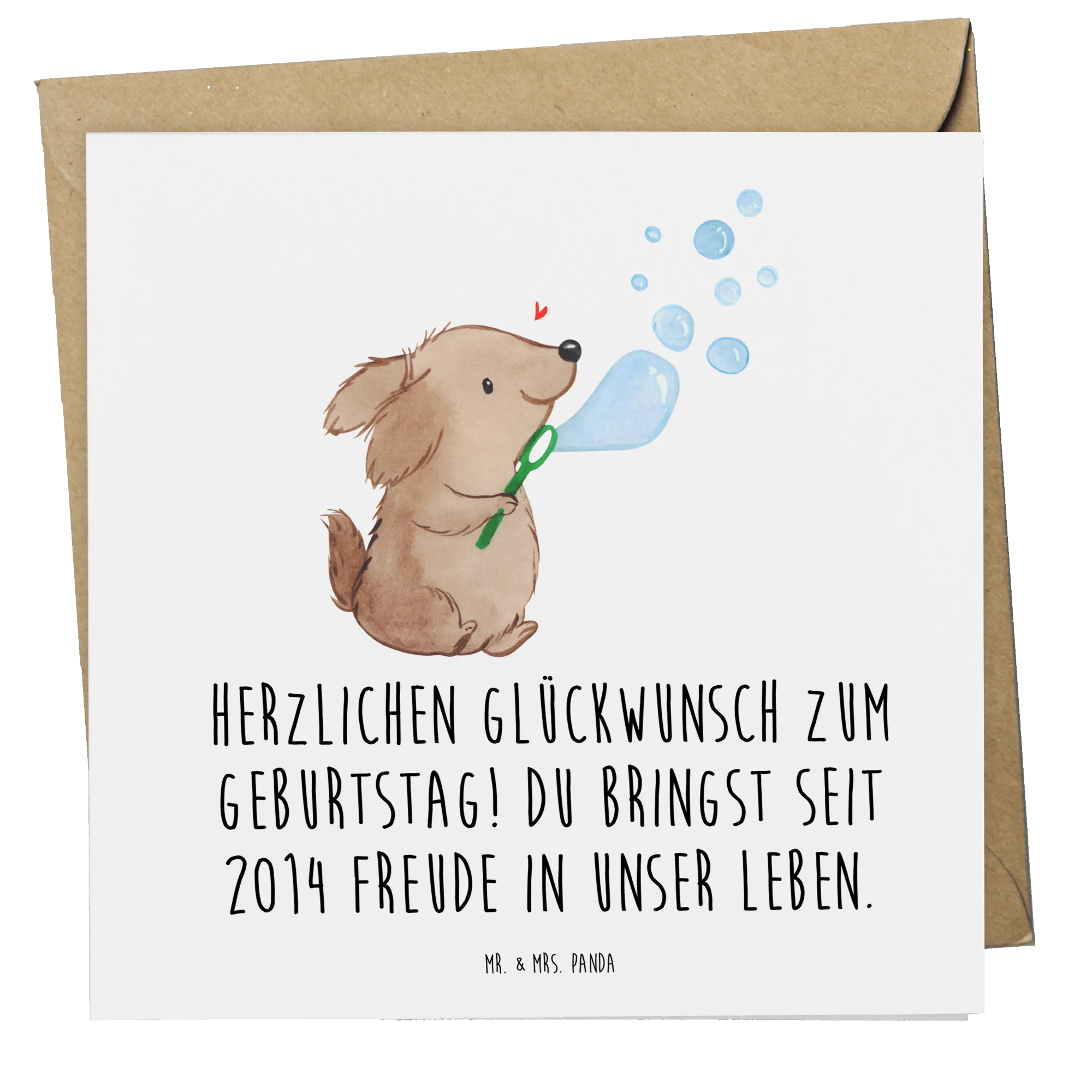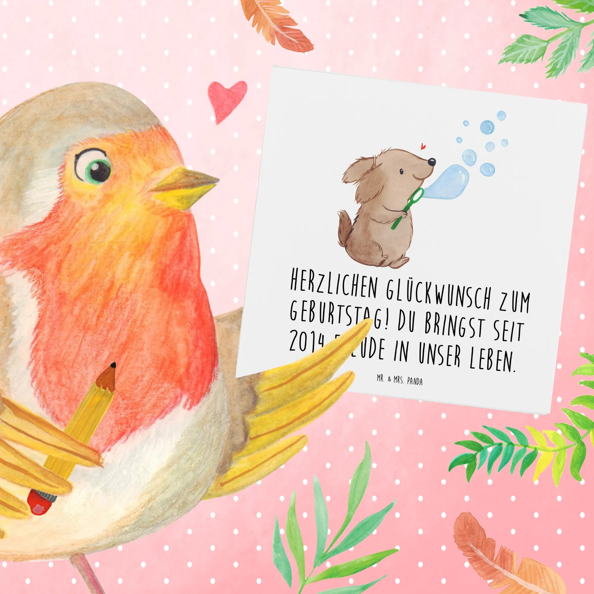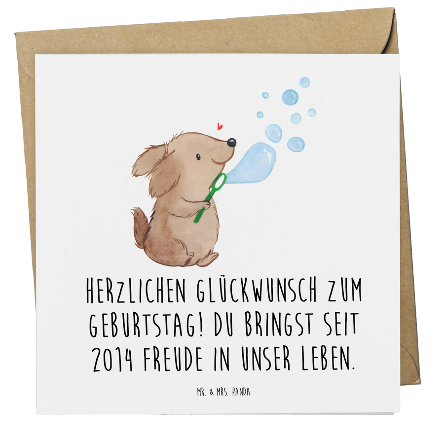 Mit den Maßen von 140 mm x 140 mm ist sie nicht nur handlich, sondern auch ein echter Blickfang! Die Karte ist mit dem Spruch "Herzlichen Glückwunsch zum Geburtstag! Du bringst seit 2014 Freude in unser Leben." versehen, der für ein Lächeln sorgt und zeigt, wie sehr Du die Person schätzt.