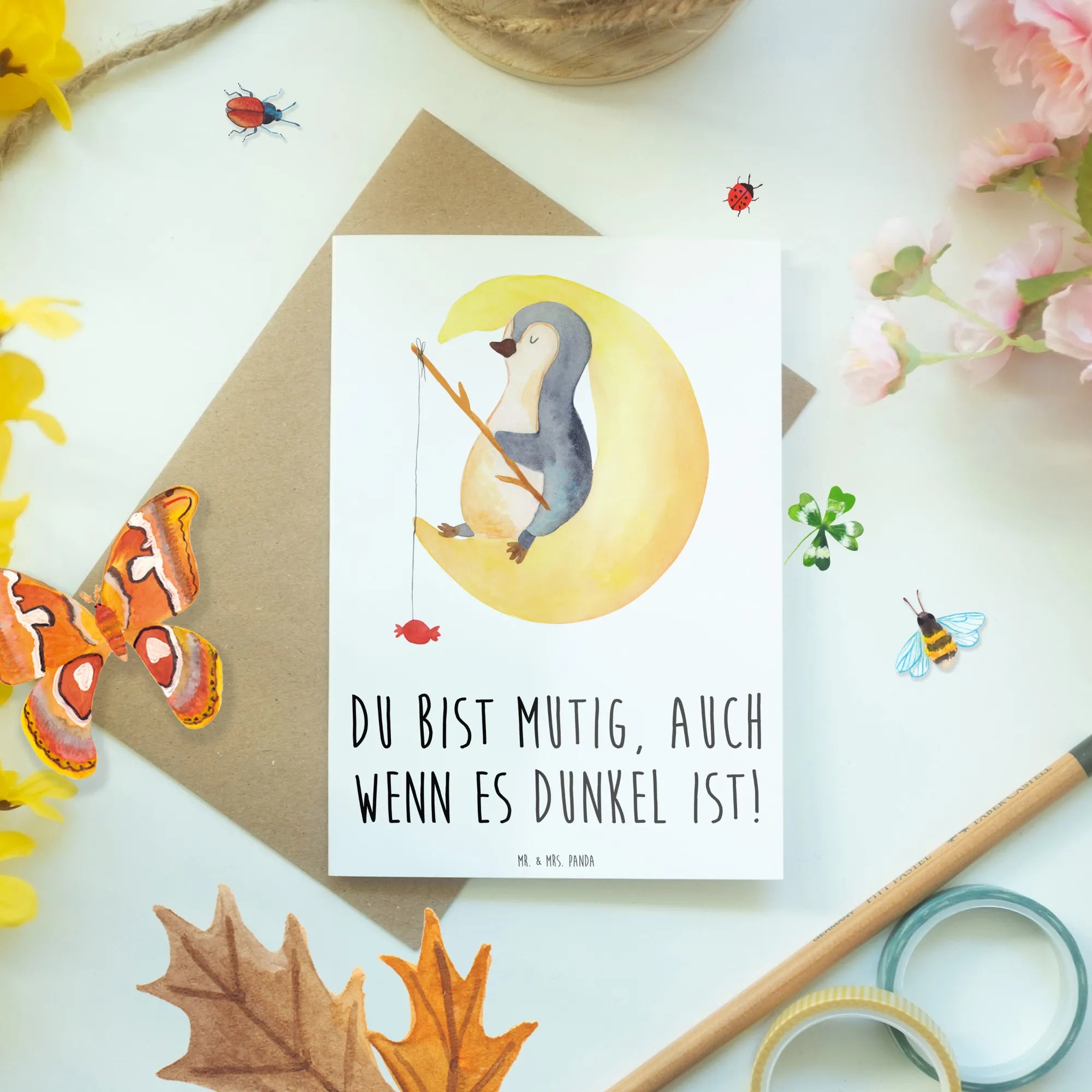 Du bist mutig, auch wenn es dunkel ist! Diese Grußkarte aus der Mutmacher-Kollektion von Mr. & Mrs. Panda ist eine zarte, aber kraftvolle Botschaft für alle, die ein bisschen Zuversicht brauchen. Ob für Kinder, Jugendliche oder Erwachsene – dieser Satz schenkt Trost und stärkt das Vertrauen in schwierigen Momenten.