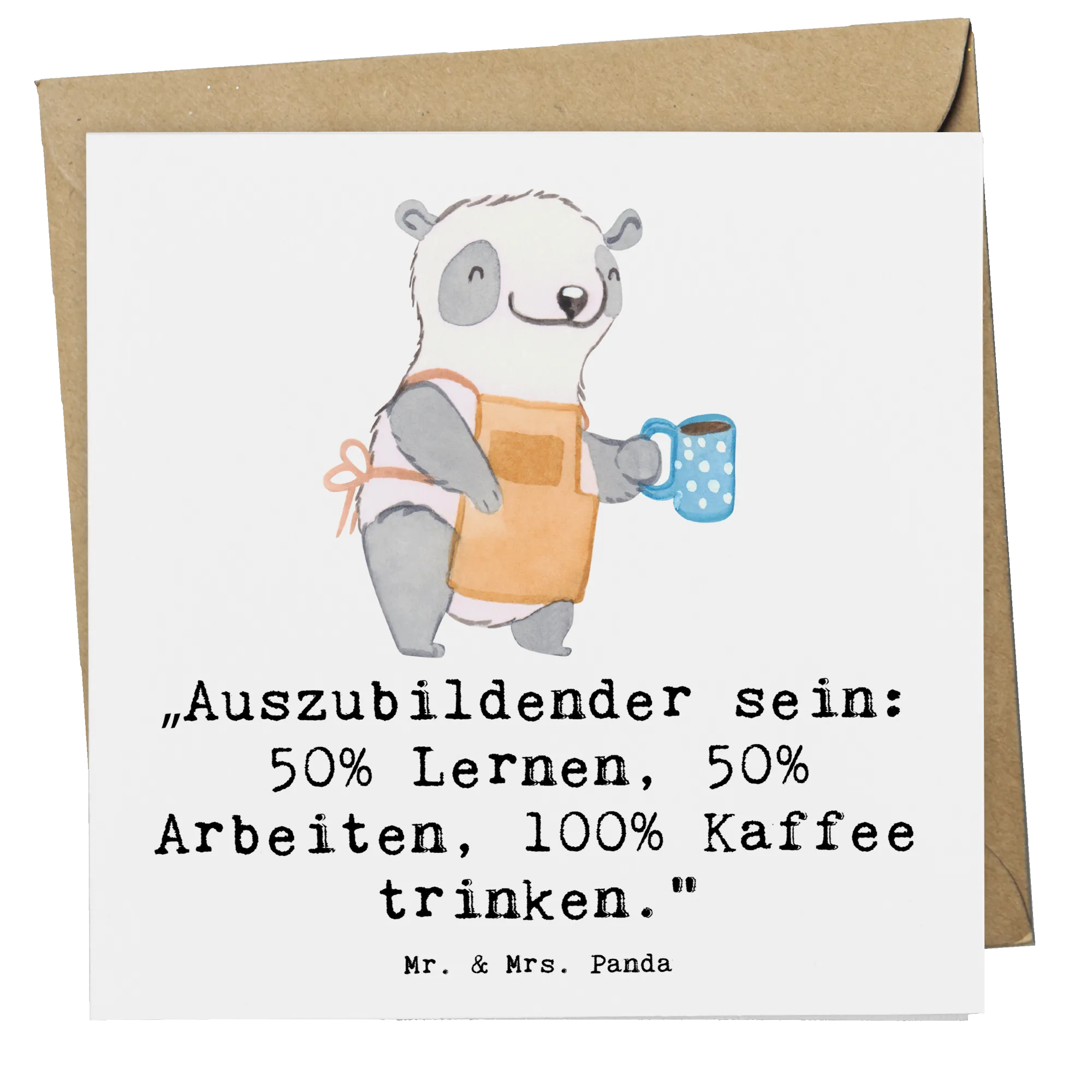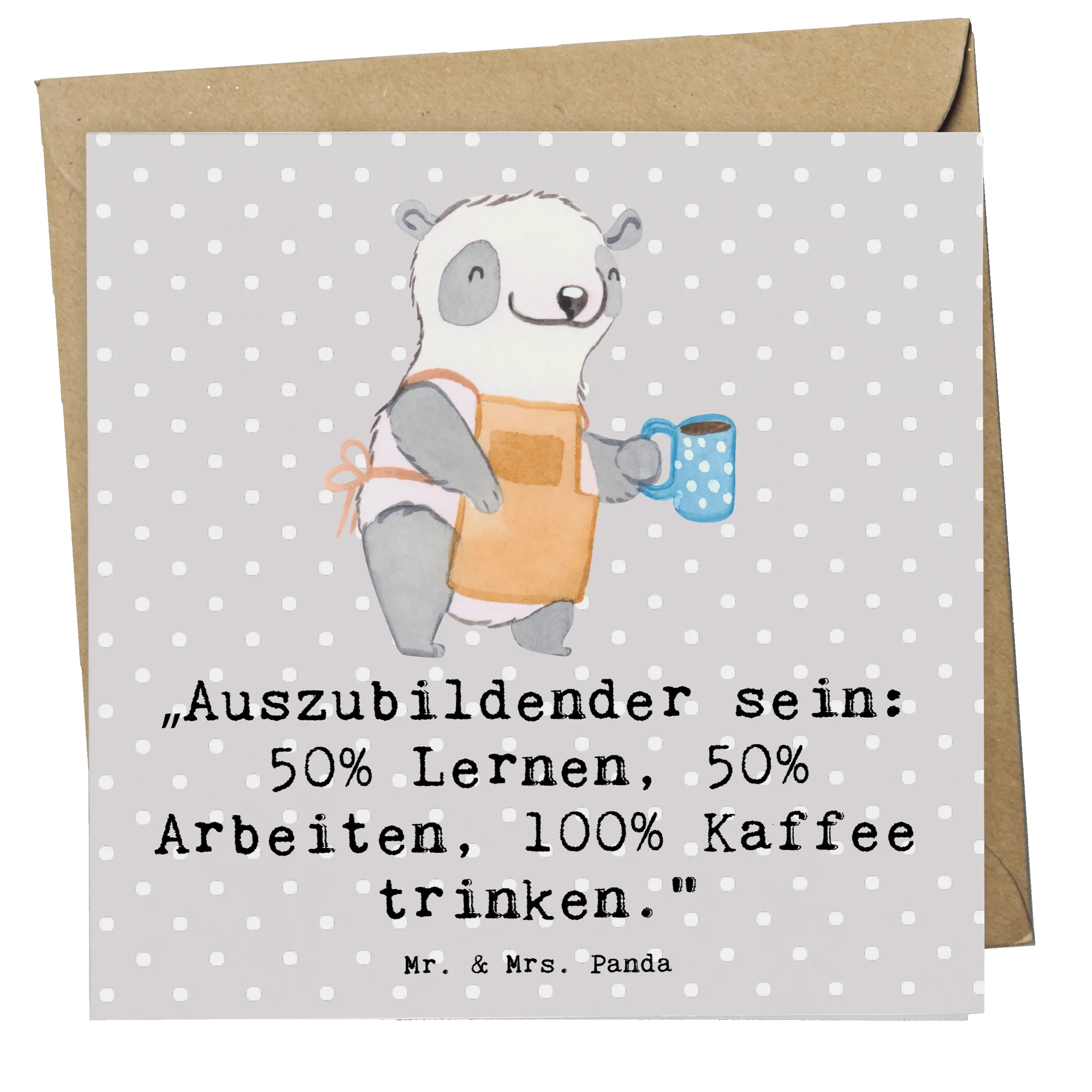 Die Deluxe Karte "Auszubildender" aus der besonderen Kollektion Berufe von Mr. & Mrs. Panda ist das perfekte Geschenk für jeden Auszubildenden, der seine Zeit im Beruf feiert. Mit dem humorvollen Slogan "Auszubildender sein: 50% Lernen, 50% Arbeiten, 100% Kaffee trinken." bringt diese hochwertige Klappkarte ein Lächeln auf jedes Gesicht.