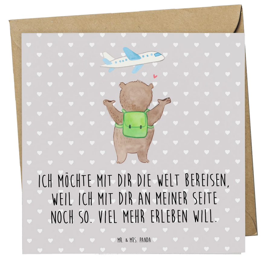 Mit dem niedlichen Motiv eines liebenswürdigen Bären, der seine Arme in die Höhe streckt und einem stilisierten Flugzeug, das über ihm schwebt, bietet diese Karte eine herzliche Botschaft: "Ich möchte mit dir die Welt bereisen, weil ich mit dir an meiner Seite noch so viel mehr erleben will." Diese Worte sind nicht nur eine Einladung zum Reisen, sondern auch ein Liebesbeweis der besonderen Art.