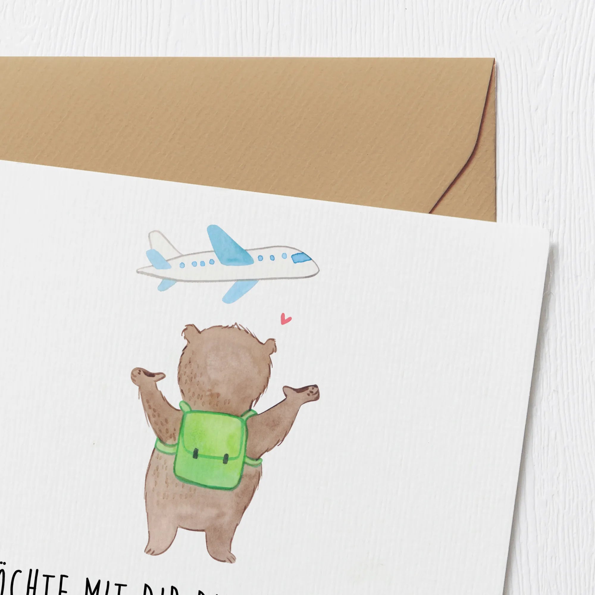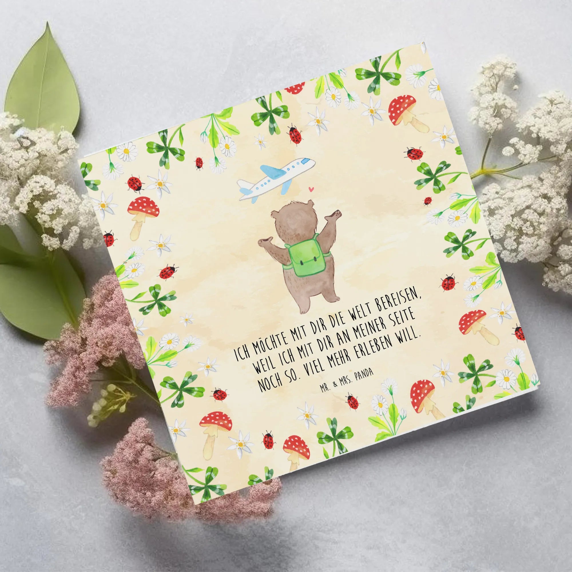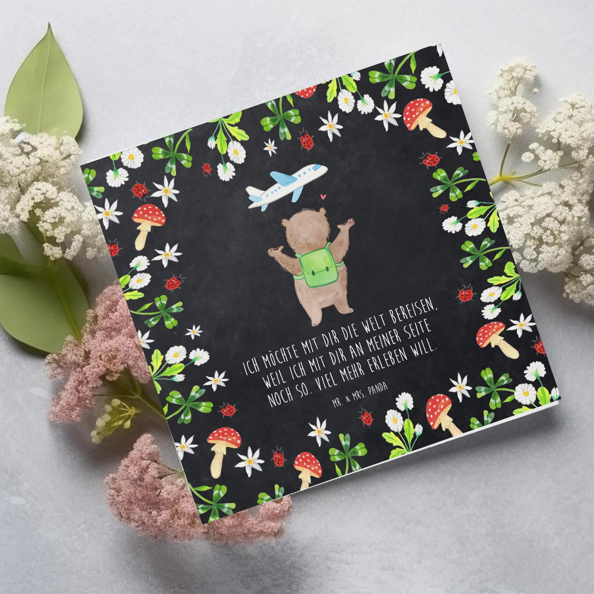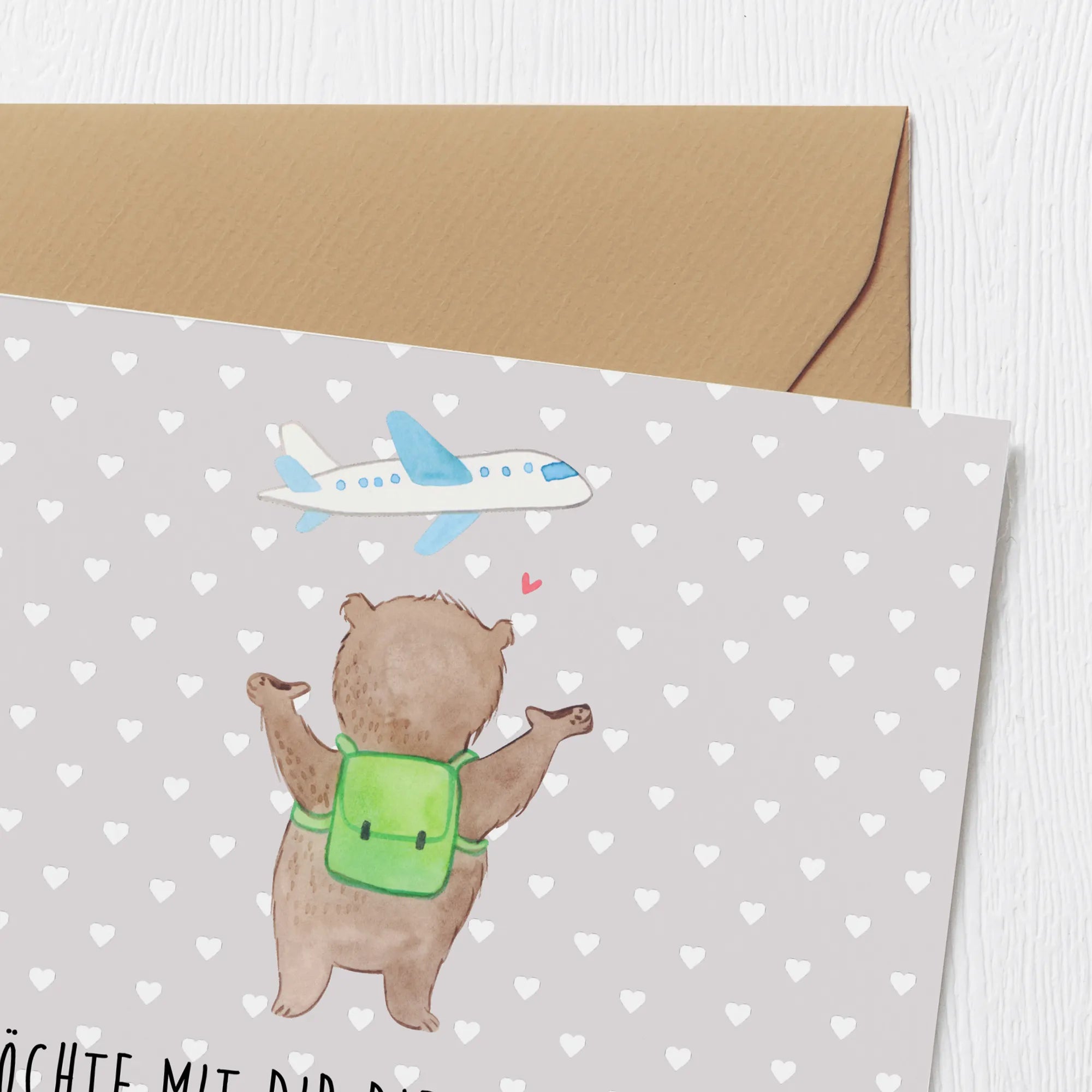 Schenke nicht nur eine Karte, sondern ein Gefühl von Heimat und Abenteuerlust zugleich. Mit dem Bär Flugzeug Motiv zeigst du, dass du bereit bist, die Koffer zu packen und das Leben in vollen Zügen mit deinem Partner zu genießen. Entdecke die Magie der handgezeichneten Illustrationen von Mr. & Mrs. Panda! 🎨✨