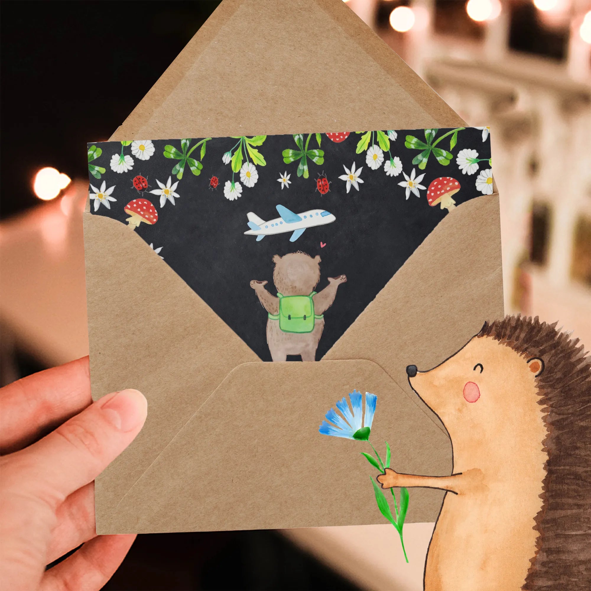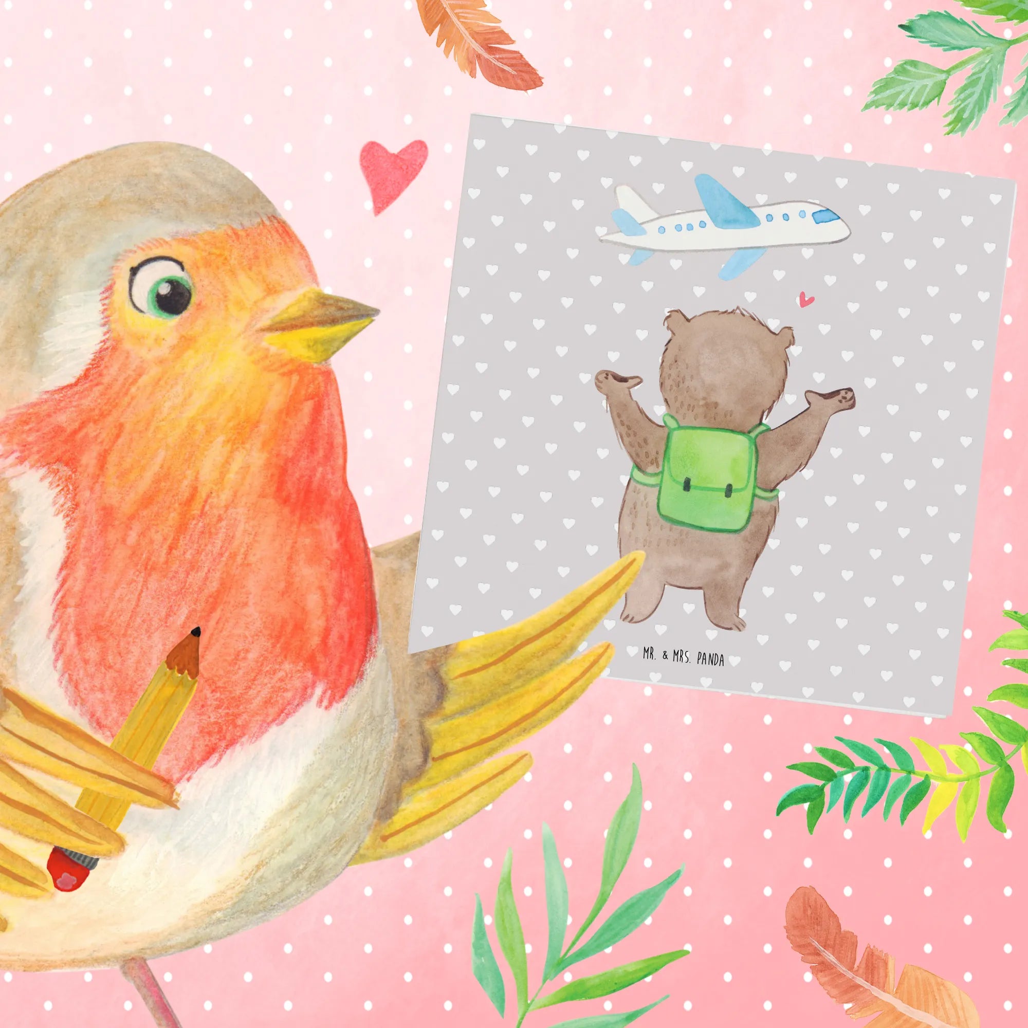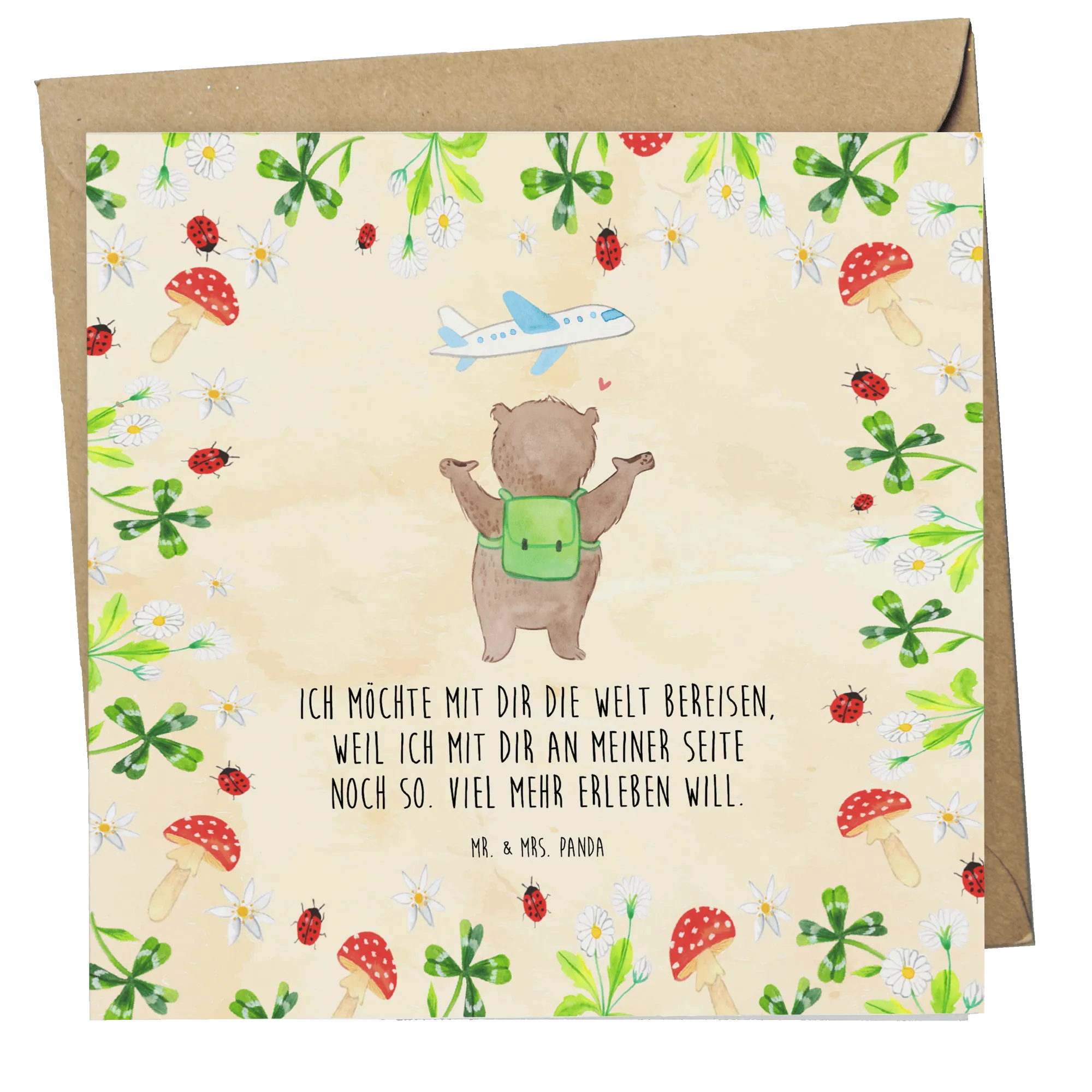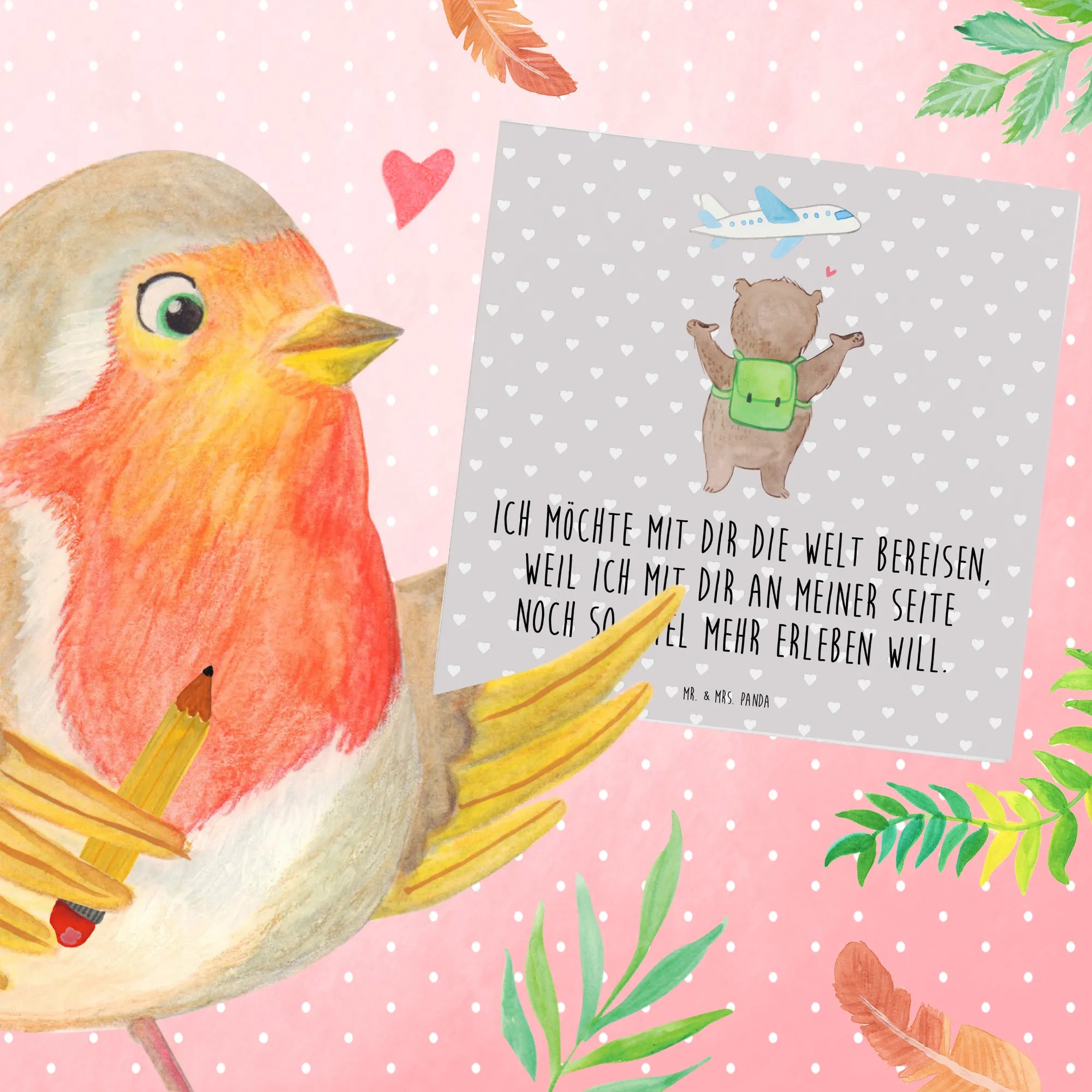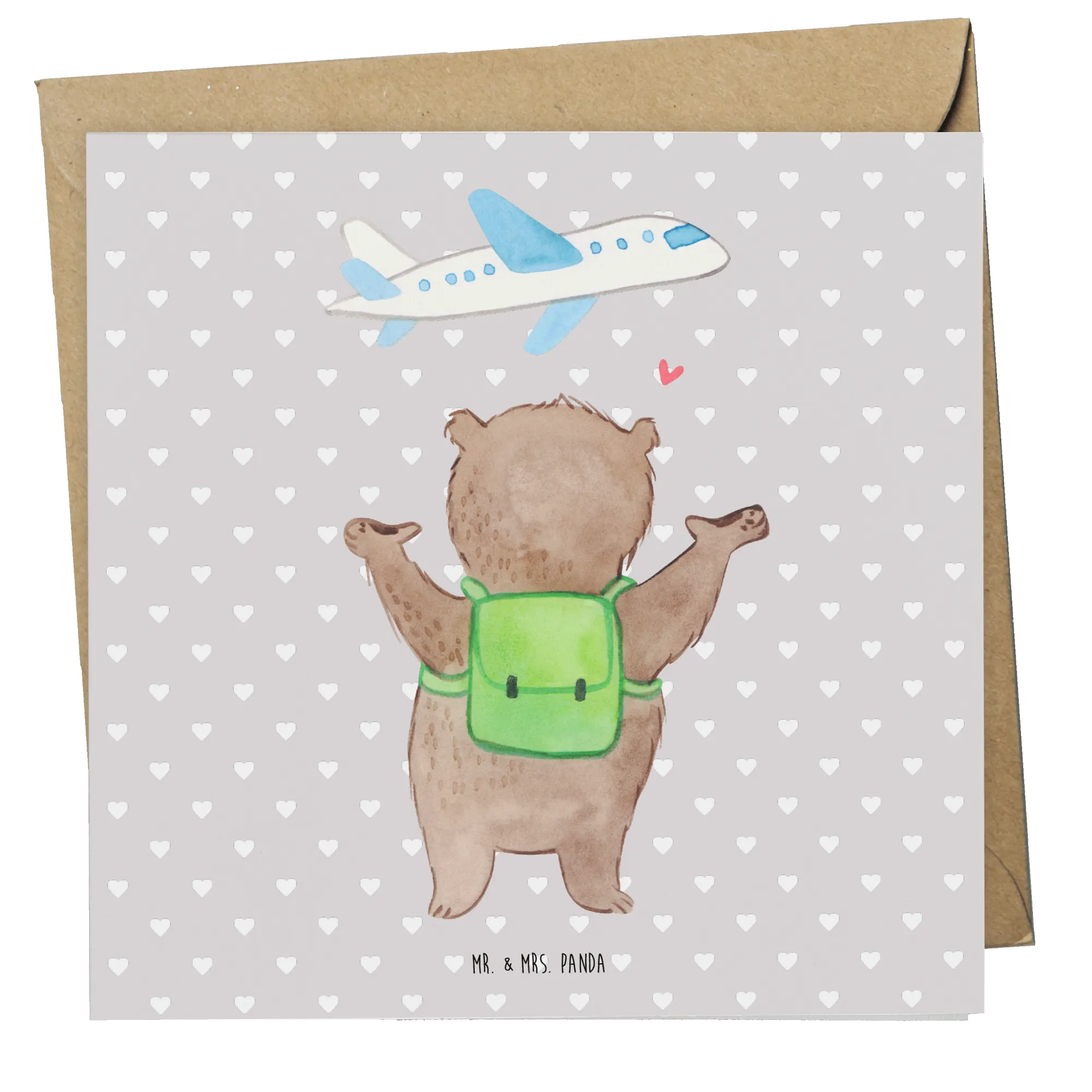 Schenke nicht nur eine Karte, sondern ein Gefühl von Heimat und Abenteuerlust zugleich. Mit dem Bär Flugzeug Motiv zeigst du, dass du bereit bist, die Koffer zu packen und das Leben in vollen Zügen mit deinem Partner zu genießen. Entdecke die Magie der handgezeichneten Illustrationen von Mr. & Mrs. Panda! 🎨✨
