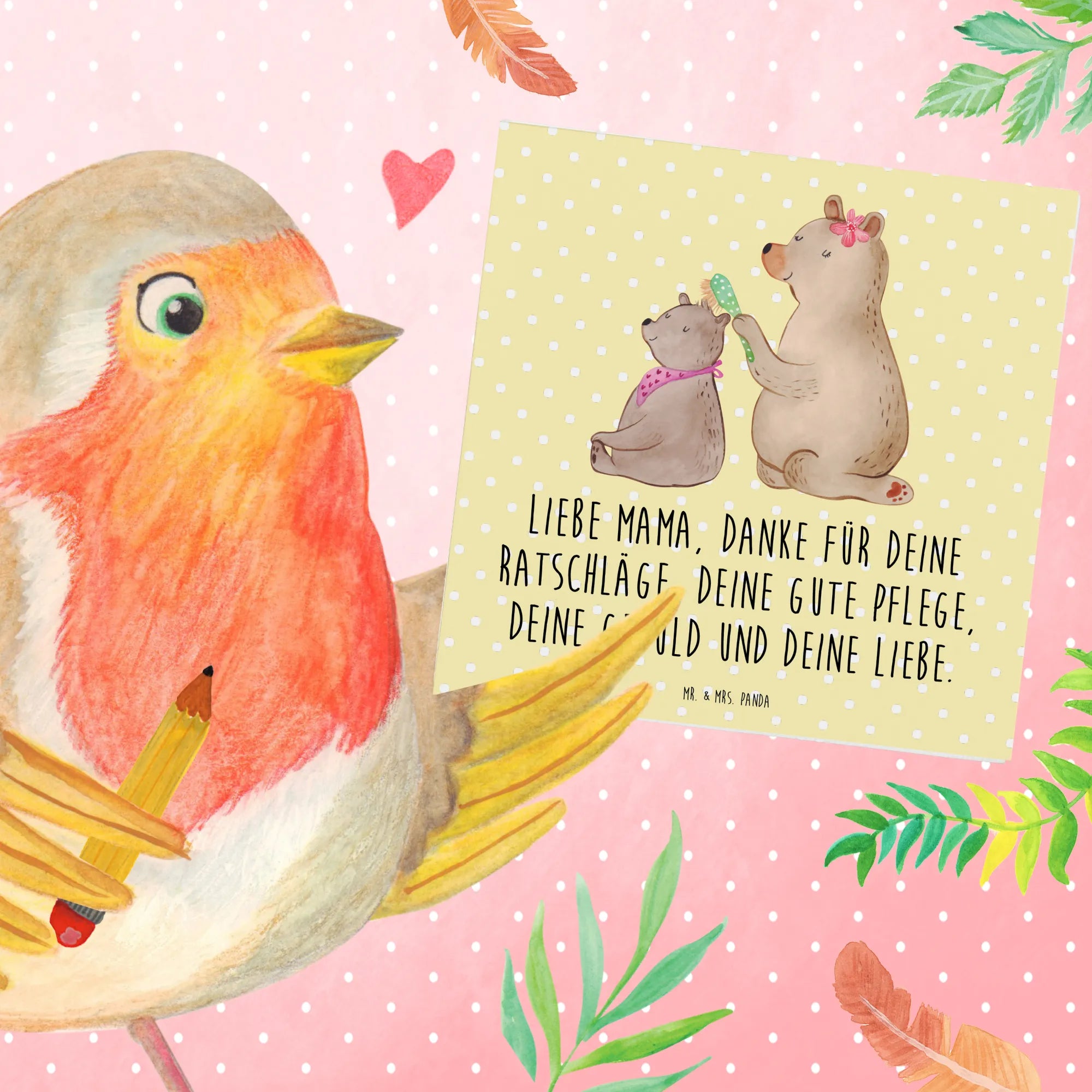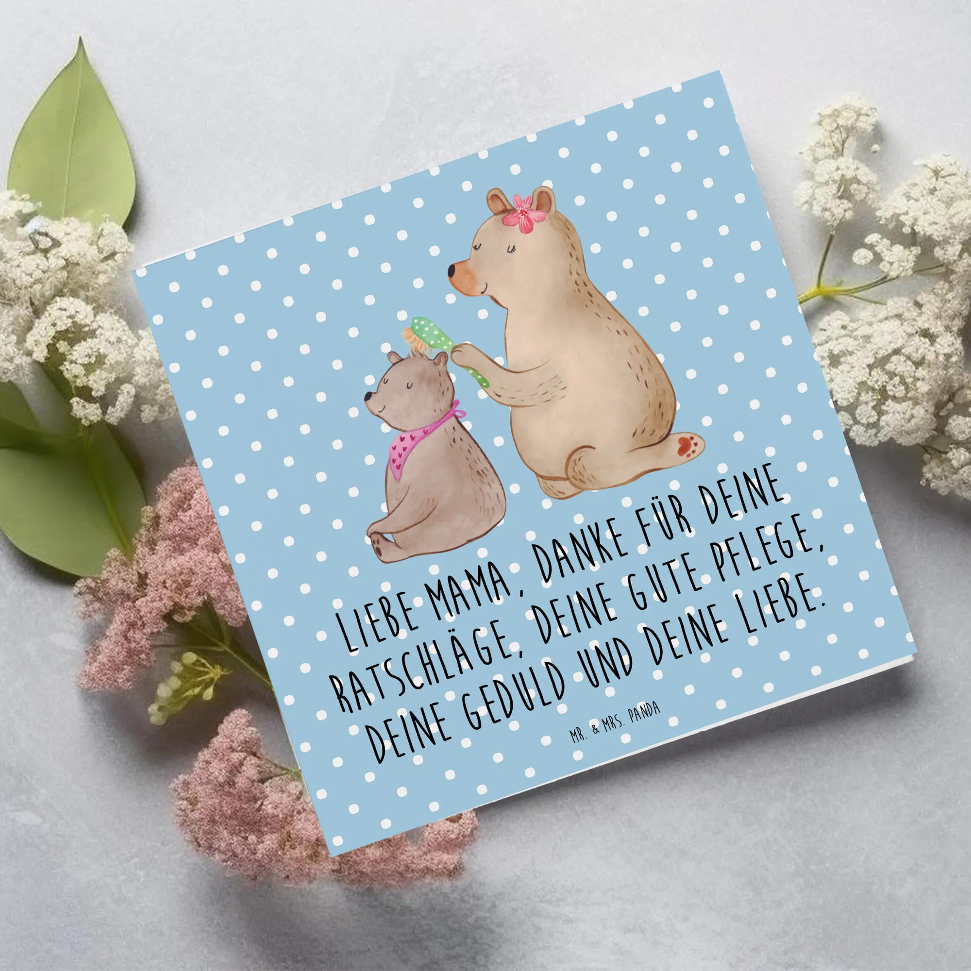 Unsere quadratische Deluxe Karte ist ein echtes Herzstück aus der Familien-Kollektion. Das zarte Aquarellmotiv zeigt einen großen Bären, der mit blumengeschmückter Haarspange das Fell eines kleinen Bären bürstet – ein Bild voller Wärme, Geborgenheit und Fürsorge. Auf der Vorderseite findest Du den liebevollen Spruch: "Liebe Mama, danke für deine Ratschläge, deine gute Pflege, deine Geduld und deine Liebe." 💕