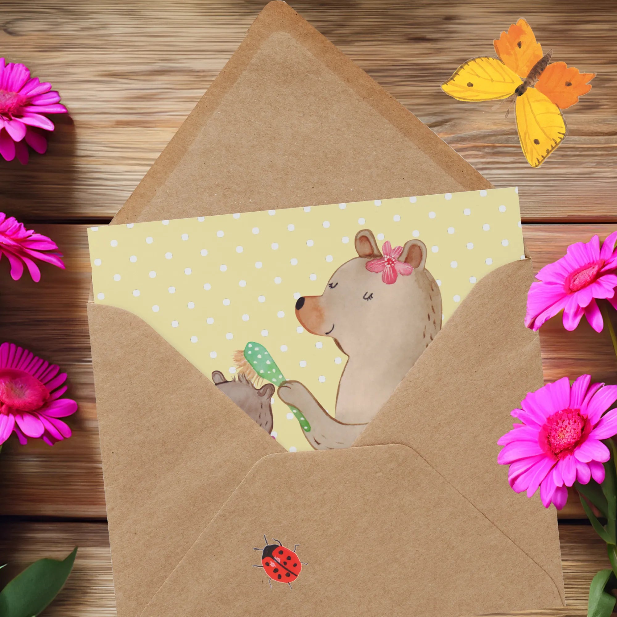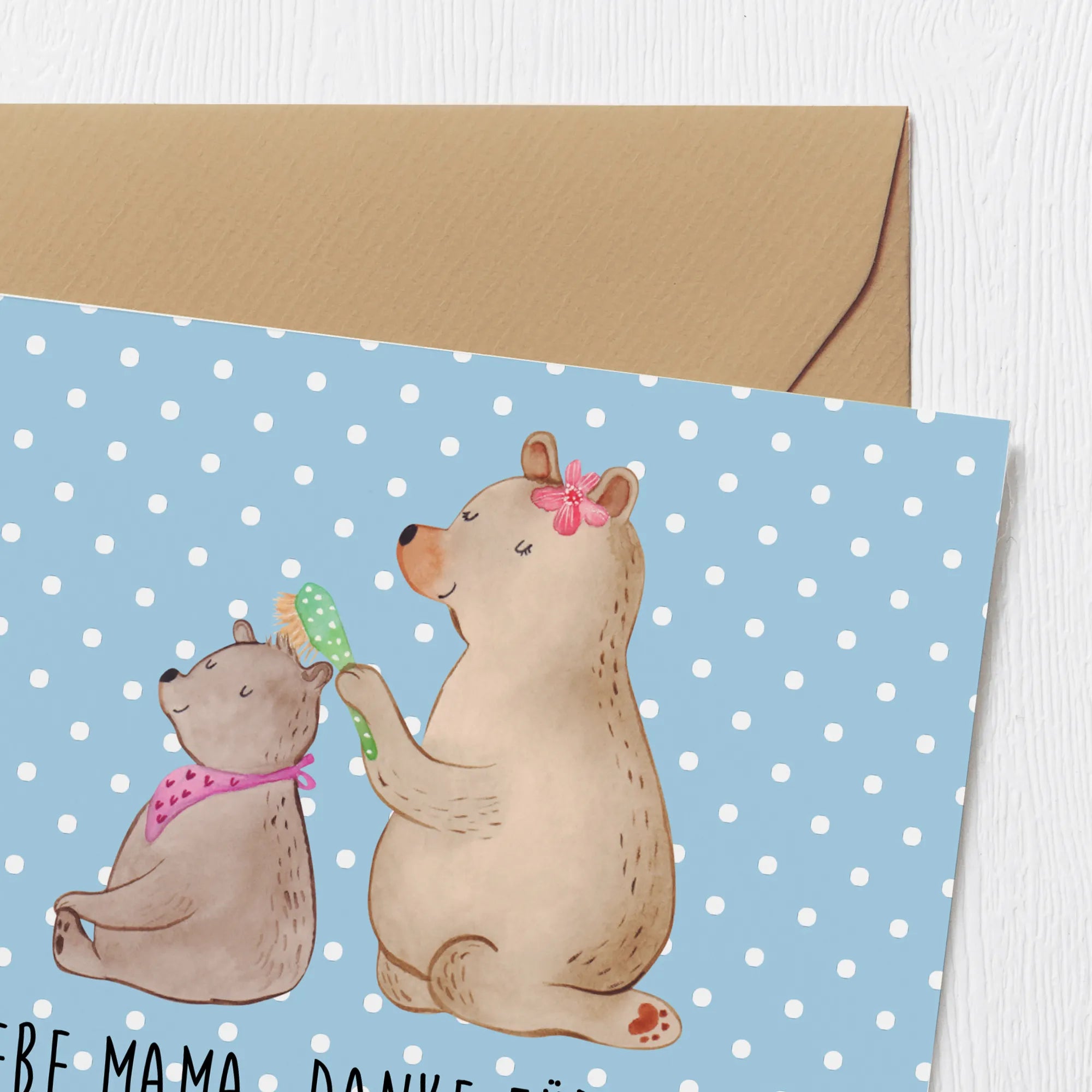 Das Motiv zeigt einen großen Bären, der mit liebevollem Gesichtsausdruck die Haare eines kleineren Bären mit einer gepunkteten Bürste bürstet. Der kleinere Bär trägt ein Tuch um den Hals und schließt entspannt die Augen. Diese Szene strahlt Wärme, Fürsorge und eine wundervolle familiäre Atmosphäreres aus. Die Karte ist ideal, um deiner Mutter zum Muttertag zu danken oder sie einfach nur zu erfreuen!
