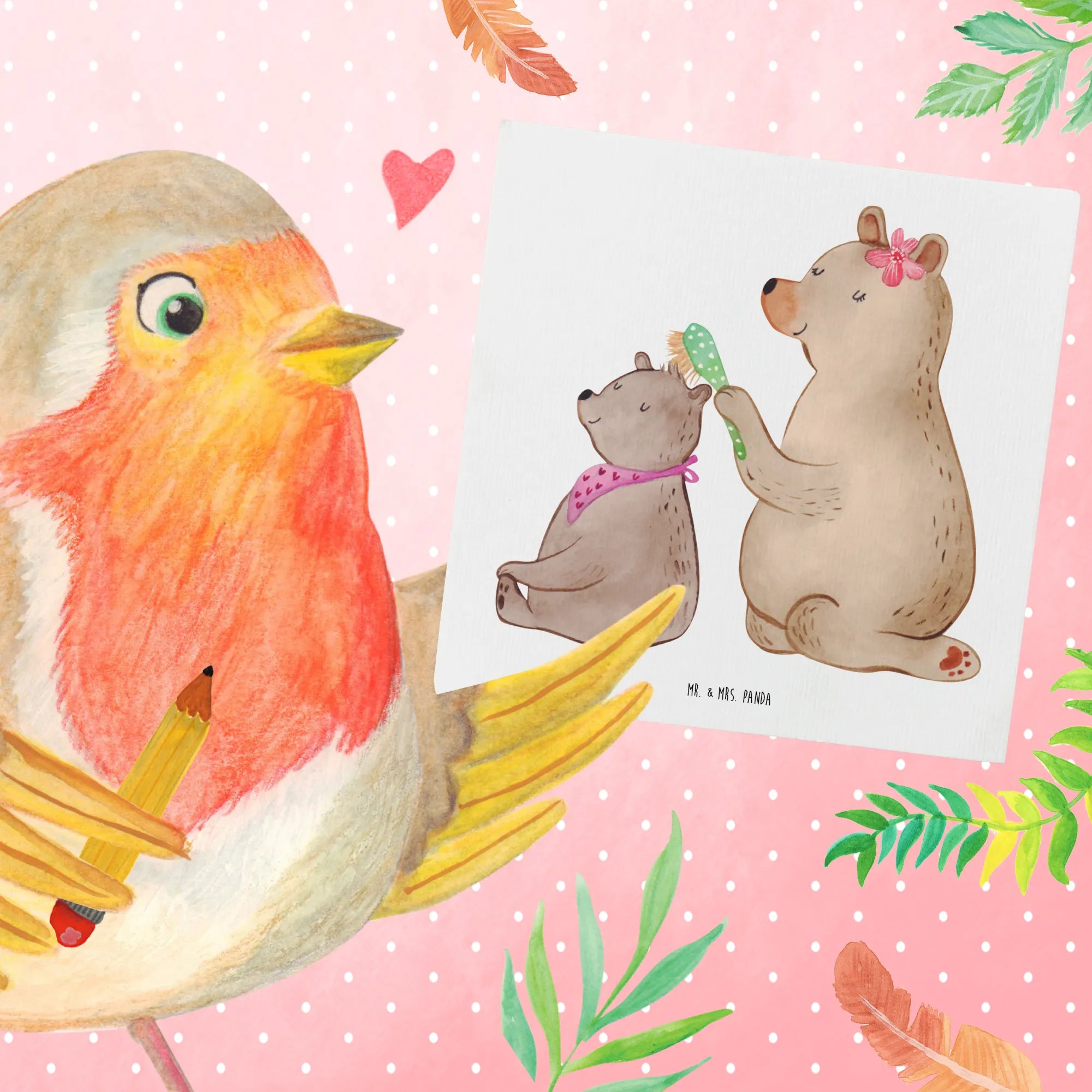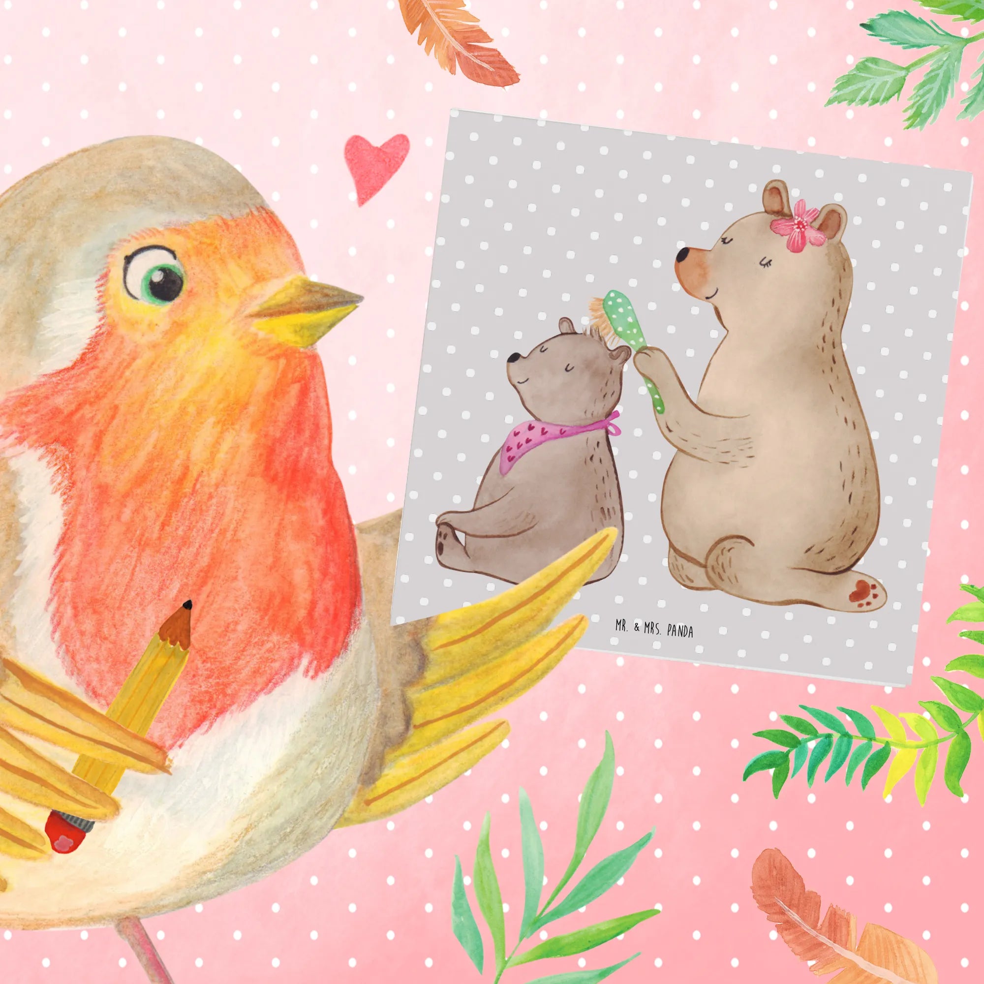Das Motiv zeigt einen großen Bären, der mit einem sanften Gesichtsausdruck das Haar eines kleinen Bären mit einer hübschen, gepunkteten Bürste pflegt. In dieser zärtlichen Szene spürt man sofort die familiäre Atmosphäre und die liebevolle Zuneigung zwischen Mutter und Kind – perfekt, um Deine Mama zum Lächeln zu bringen!