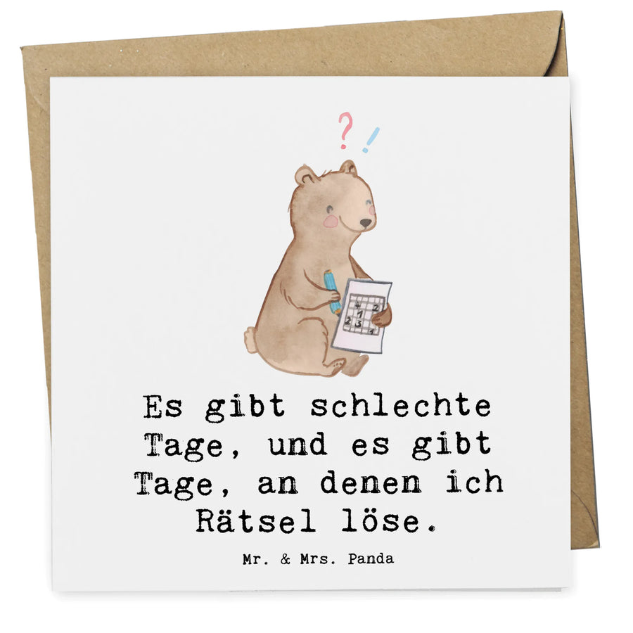Die Karte präsentiert ein bezauberndes Motiv: Ein süßer Bär, der auf dem Boden sitzt und mit einem Kreuzworträtsel beschäftigt ist. Es gibt Tage, an denen man einfach rätseln muss! Mit dem Spruch "Es gibt schlechte Tage, und es gibt Tage, an denen ich Rätsel löse." bringt die Karte nicht nur Freude, sondern auch Inspiration für all die Denksportler.