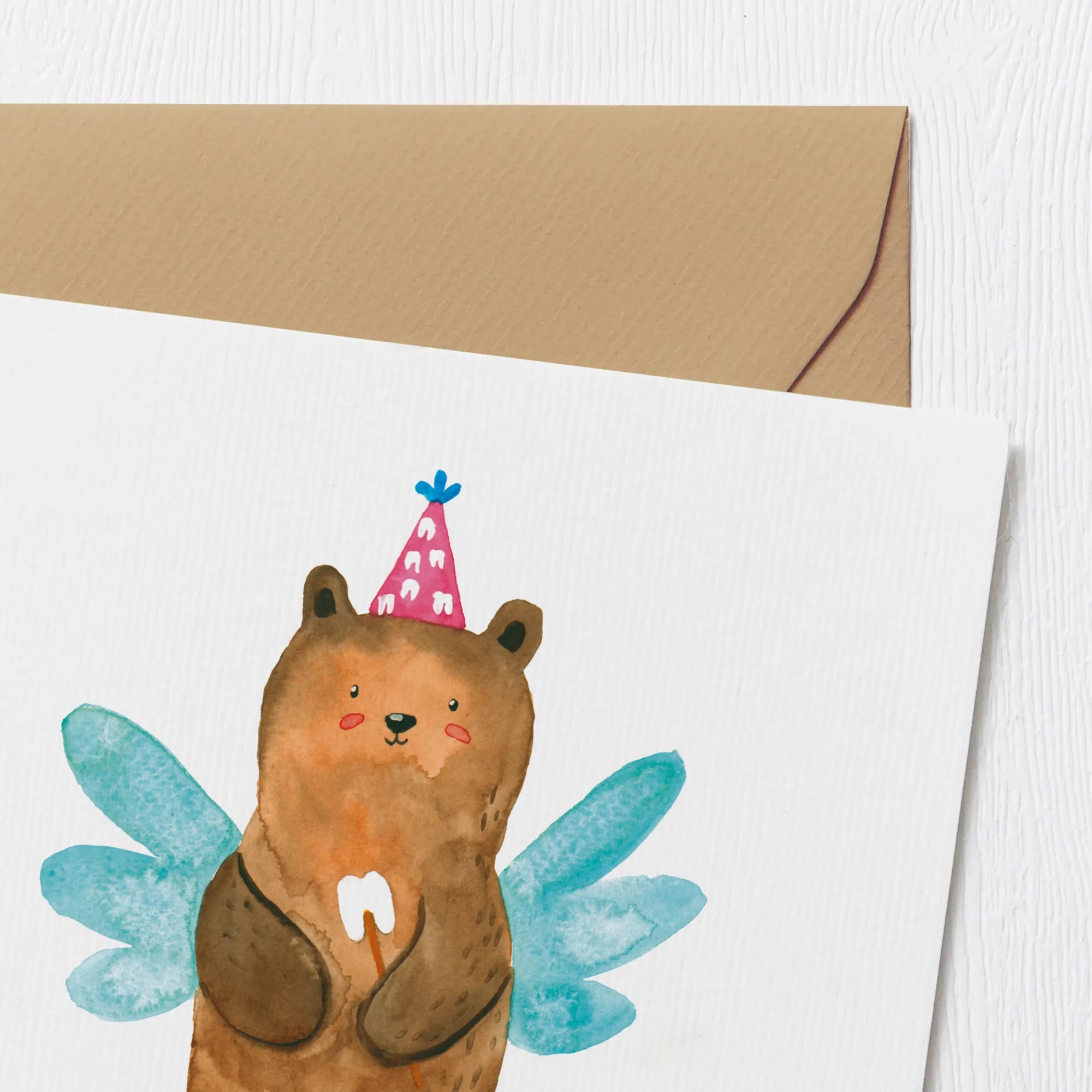 Die Karte wird mit einem edlen Umschlag geliefert, der das Geschenk noch weiter veredelt und die Vorfreude auf den Inhalt steigert. Die Zahnfee, die wir alle aus Kindheitserinnerungen kennen, wird durch den schnuckeligen Bären, der liebevoll von Mrs. Panda entworfen wurde, perfekt in Szene gesetzt. Diese einzigartige Karte ist nicht nur ein wunderbares Sammlerstück, sondern auch eine schöne Erinnerung an die magischen Momente der Kindheit.