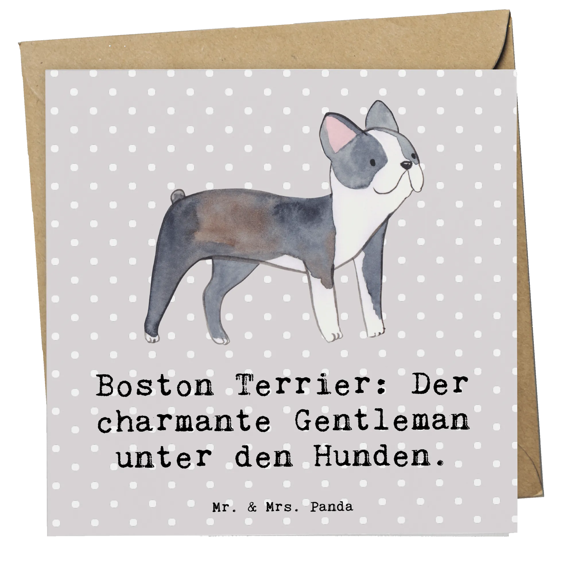 Die Deluxe Karte mit dem bezaubernden Boston Terrier aus der Hunderassen-Kollektion von Mr. & Mrs. Panda ist das perfekte Geschenk für Hundefreunde. Mit einem charmanten Spruch - "Boston Terrier: Der charmante Gentleman unter den Hunden" - bringt die Karte Freude und ein Lächeln auf die Gesichter der Beschenkten.