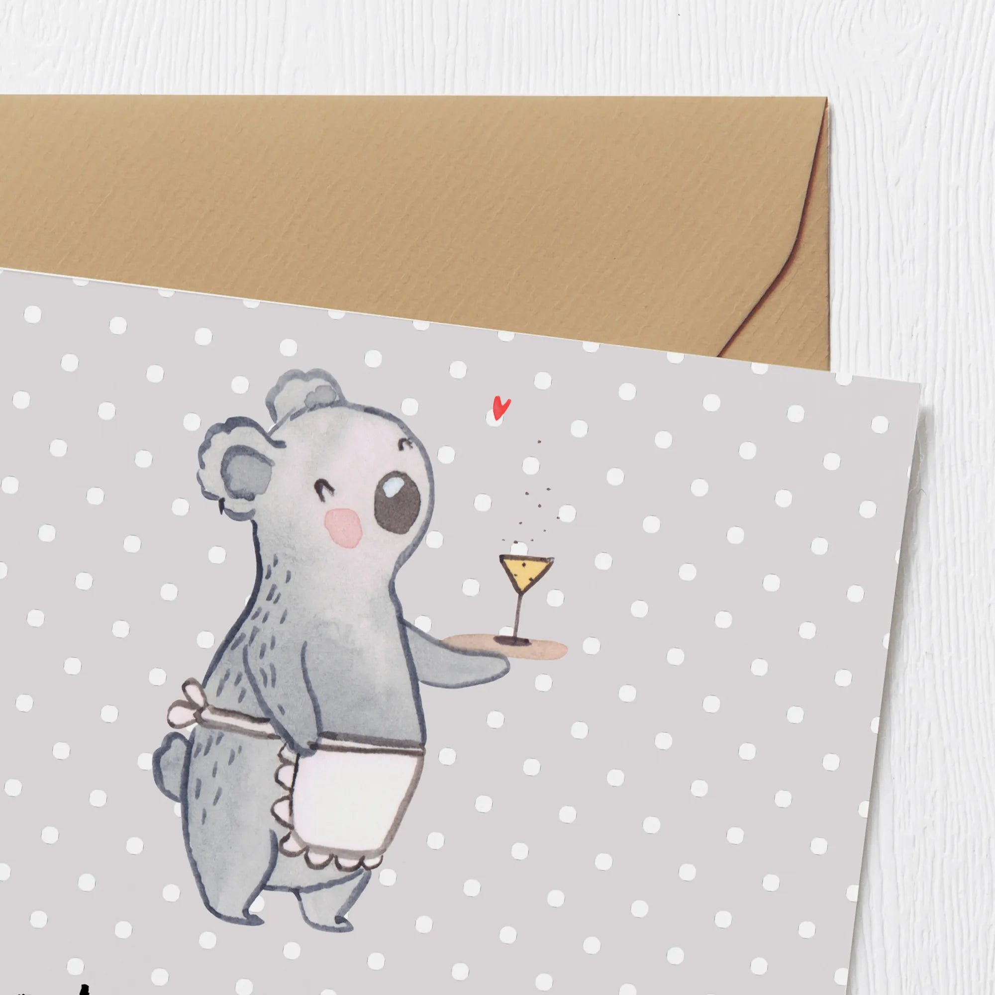 Das besondere Design zeigt eine charmante Gastwirtin, die ihre Gäste mit einem breiten Lächeln empfängt – genau das, was eine Gaststätte ausmacht! Das Motiv und der Spruch sind von Mrs. Panda mit viel Hingabe und Kreativität als Aquarell entworfen, sodass jede Karte ein kleines Kunstwerk ist.