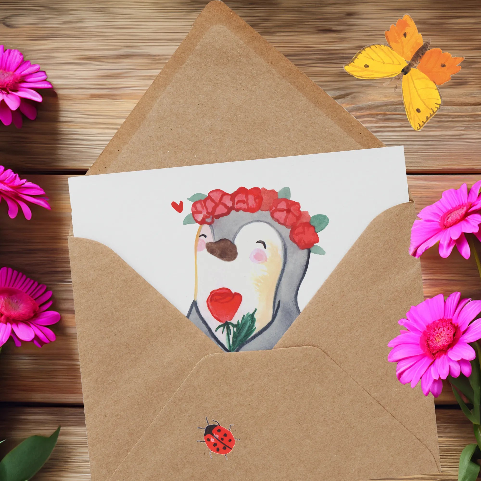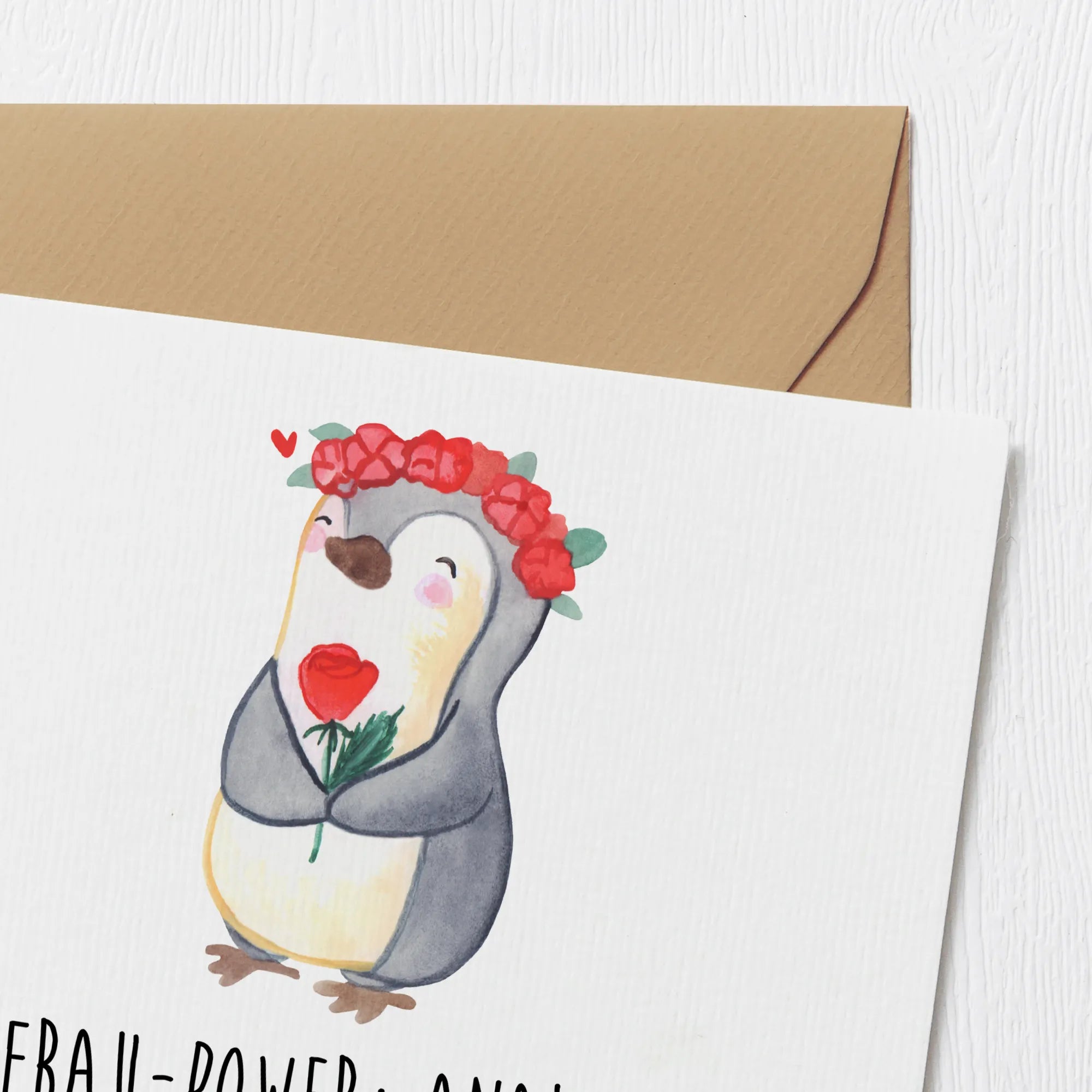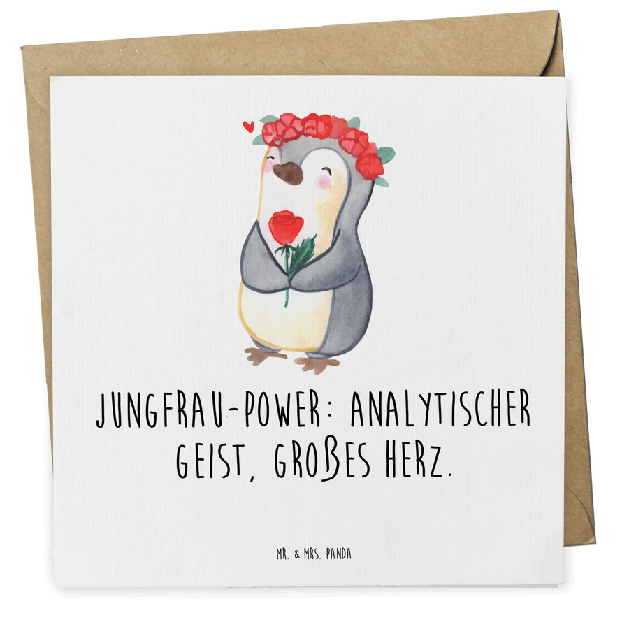 Auf der Vorderseite prangt ein liebevolles, handgezeichnetes Motiv einer Jungfrau, dargestellt durch einen süßen Pinguin mit einem floralen Kranz auf dem Kopf, der eine Blume in seinen Flossen hält. Der Spruch "Jungfrau-Power: Analytischer Geist, großes Herz" prägt die Karte und spiegelt die Eigenschaften der Jungfrau perfekt wider.