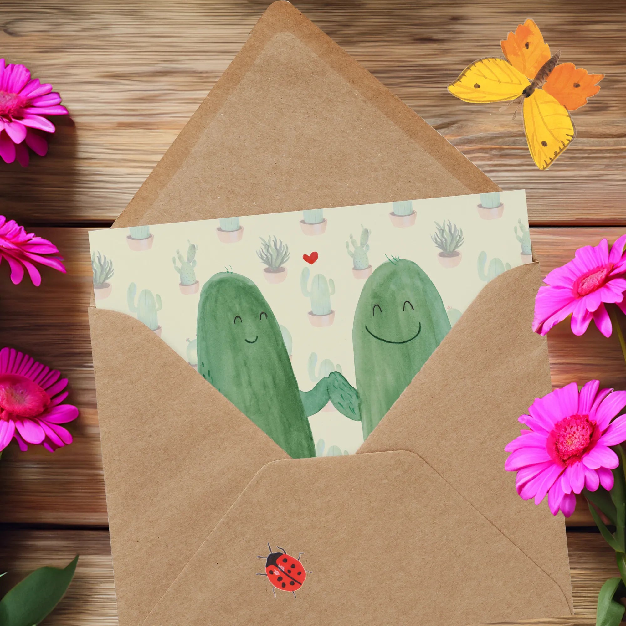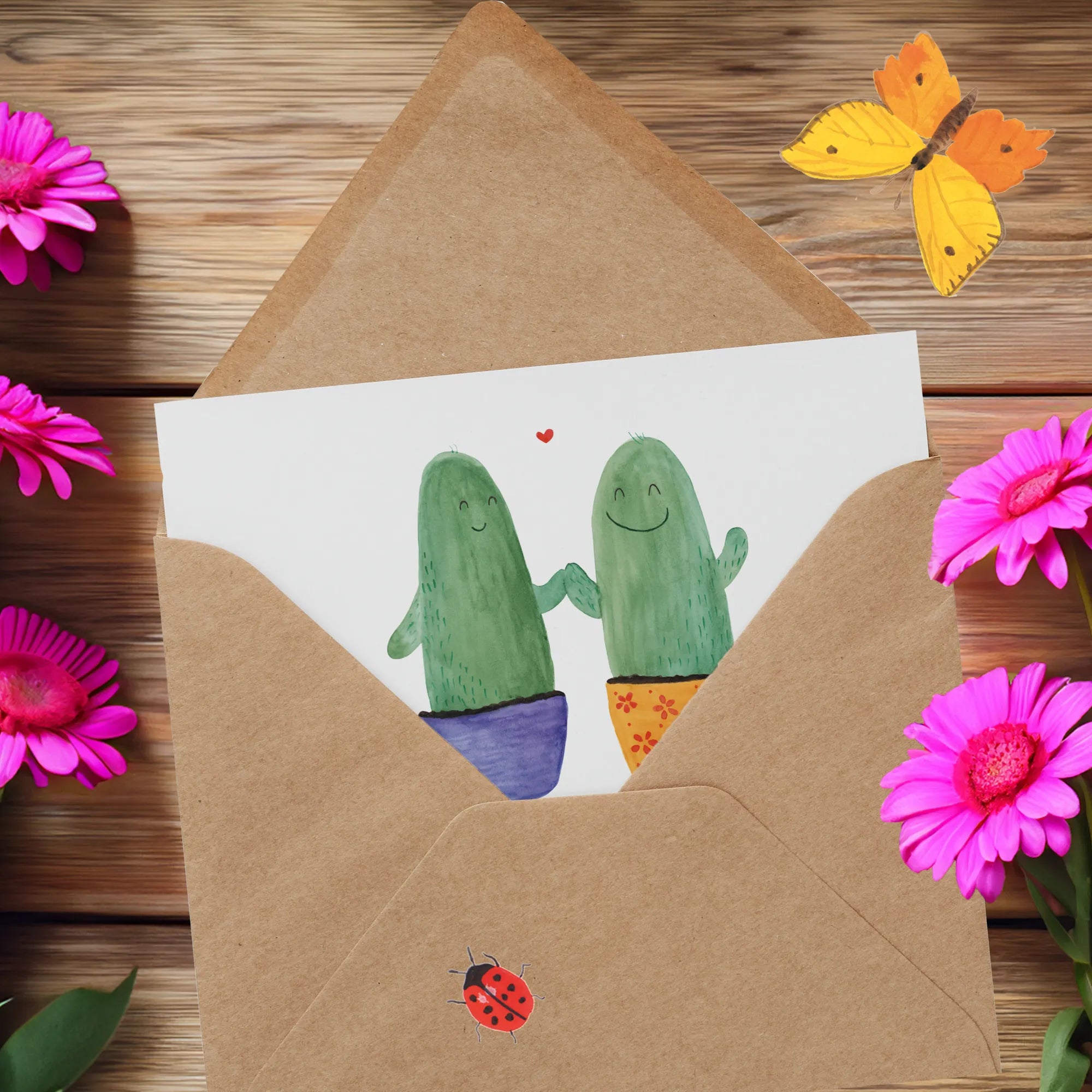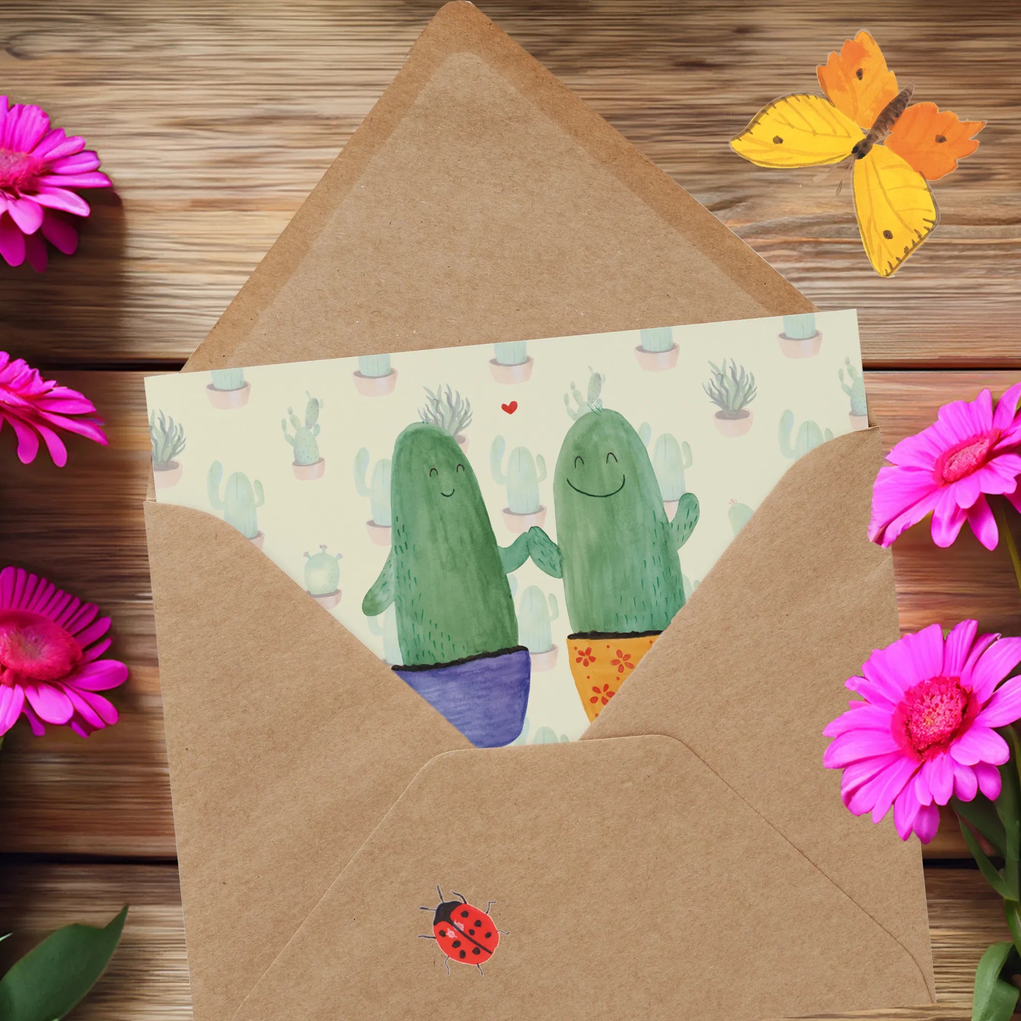 Mit einem Motiv, das zwei fröhliche Kakteen zeigt, die sich glücklich anblicken, verbreitet die Karte schon beim Anschauen gute Laune und ein Gefühl von Verbundenheit.