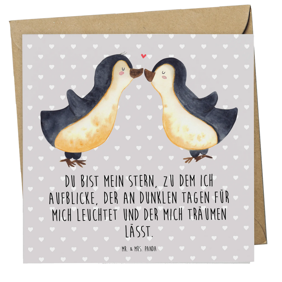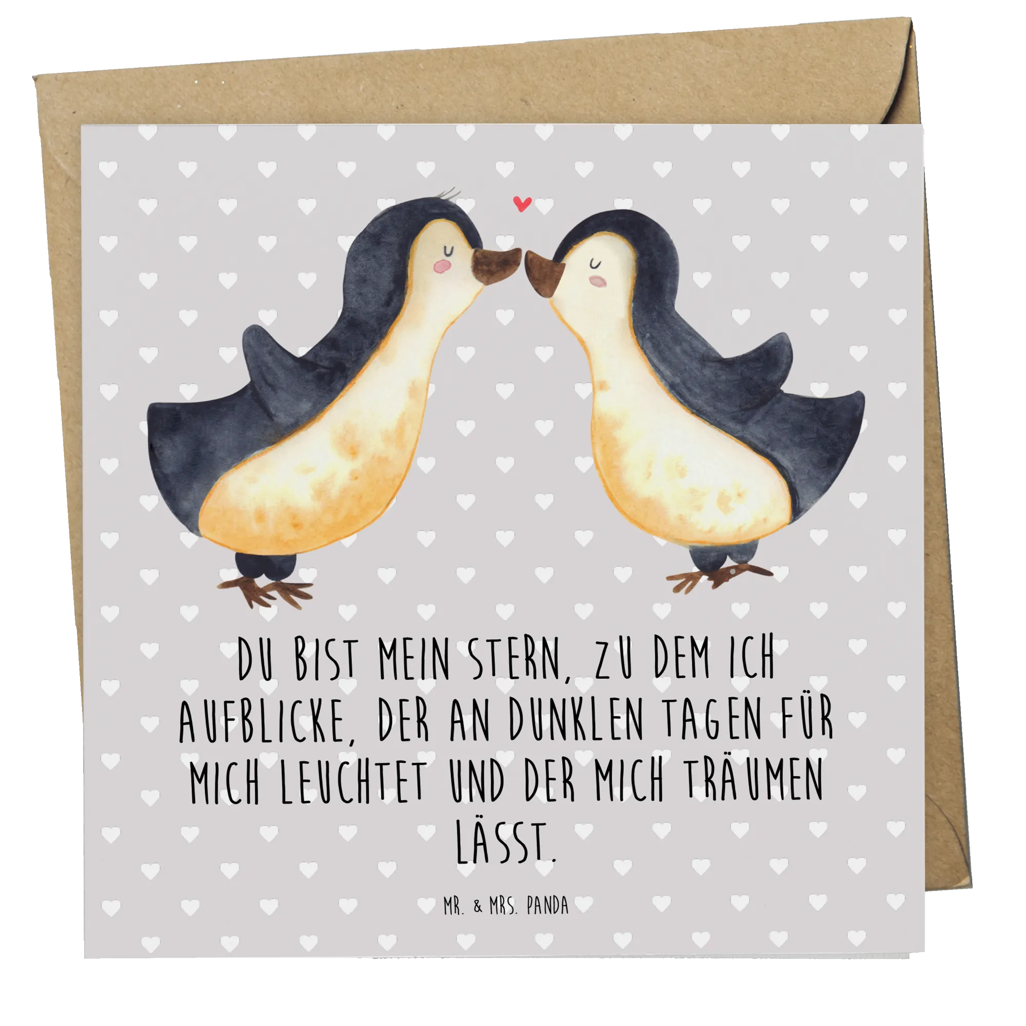 Das wunderschöne Motiv zeigt ein verliebtes Pinguinpaar, das sich sanft aneinander kuschelt. Über ihnen schwebt ein kleines Herz, das die Zuneigung und Verbundenheit symbolisiert. Mit dem lieben Spruch „Du bist mein Stern, zu dem ich aufblicke, der an dunklen Tagen für mich leuchtet und der mich träumen lässt“ wird die Karte zum idealen Ausdruck deiner Gefühle.