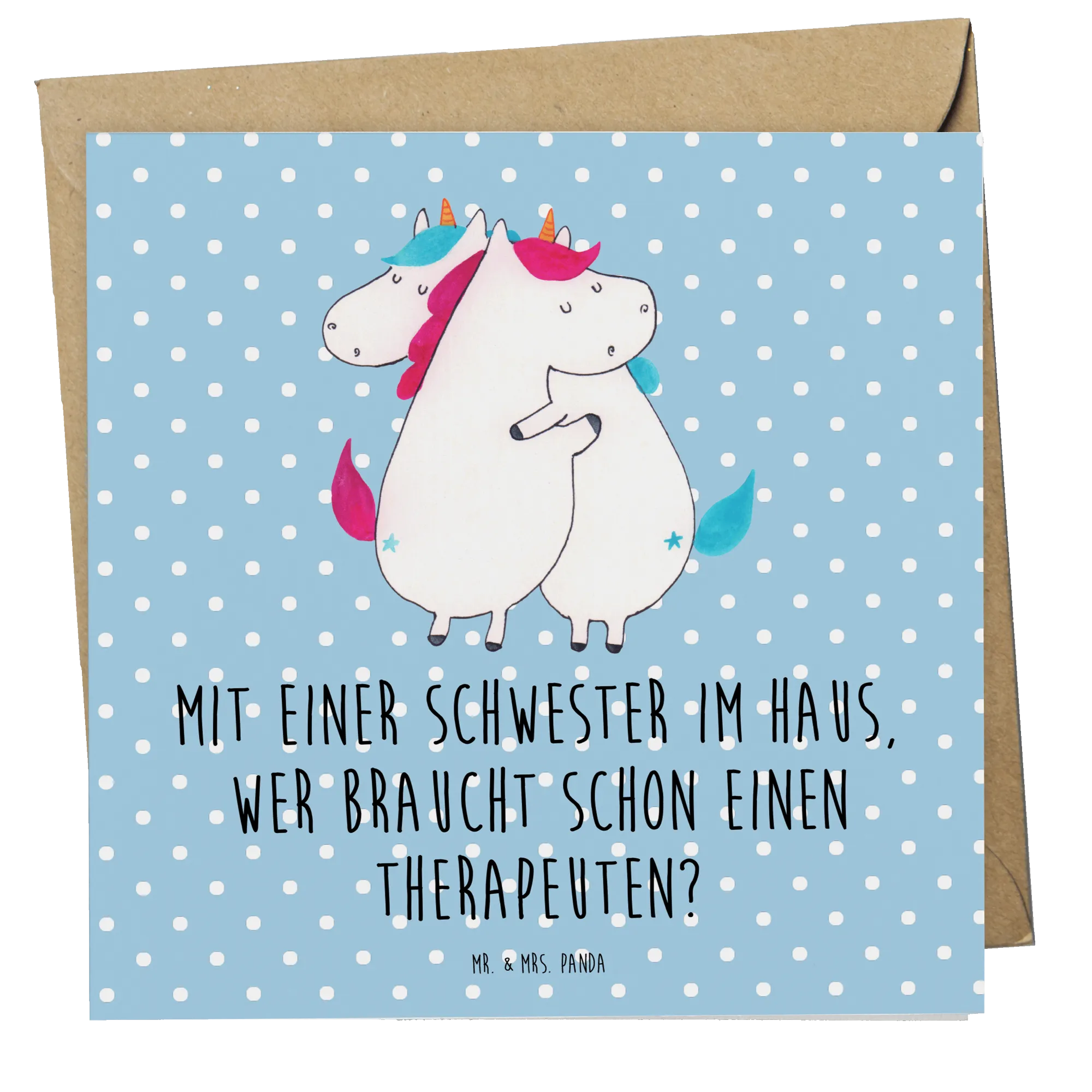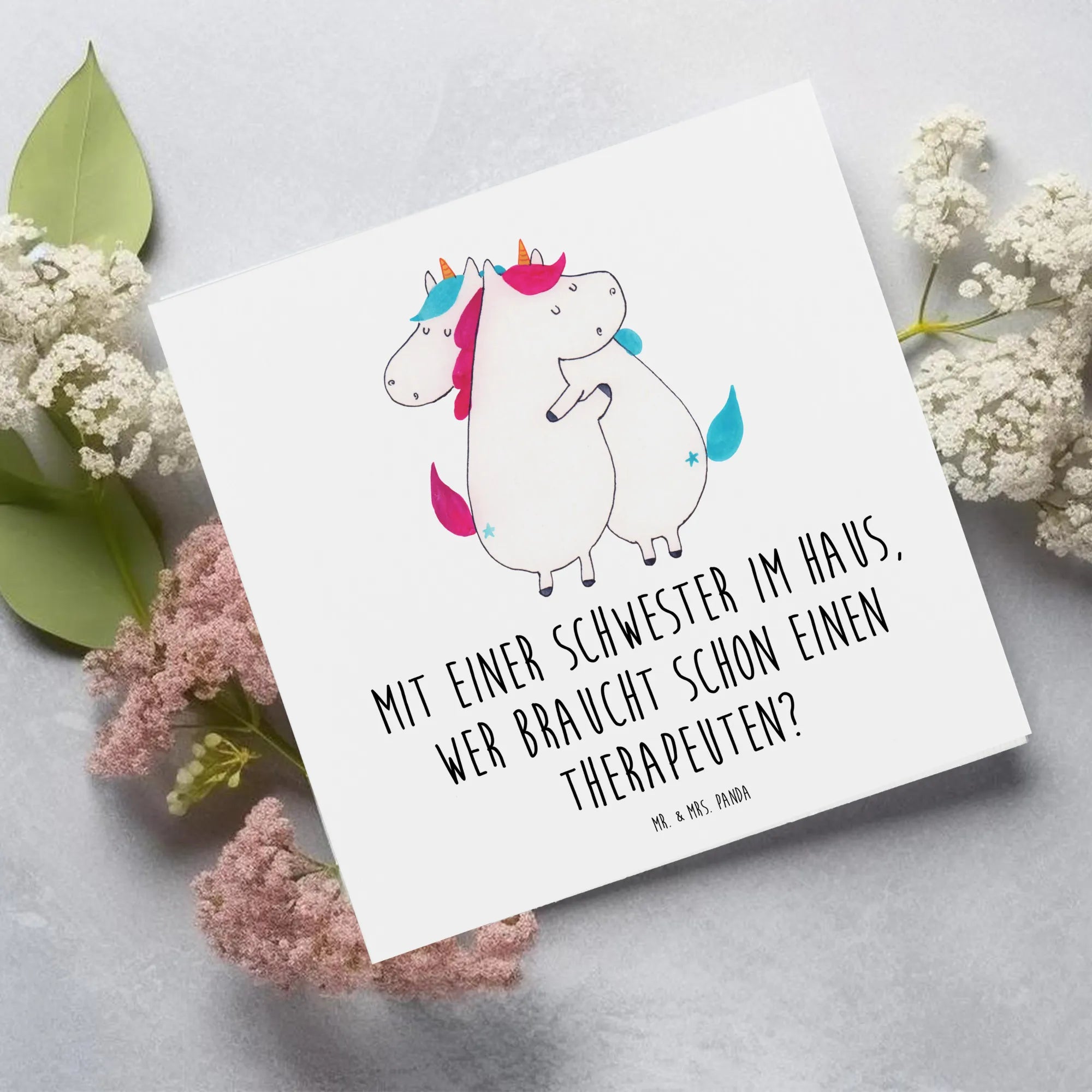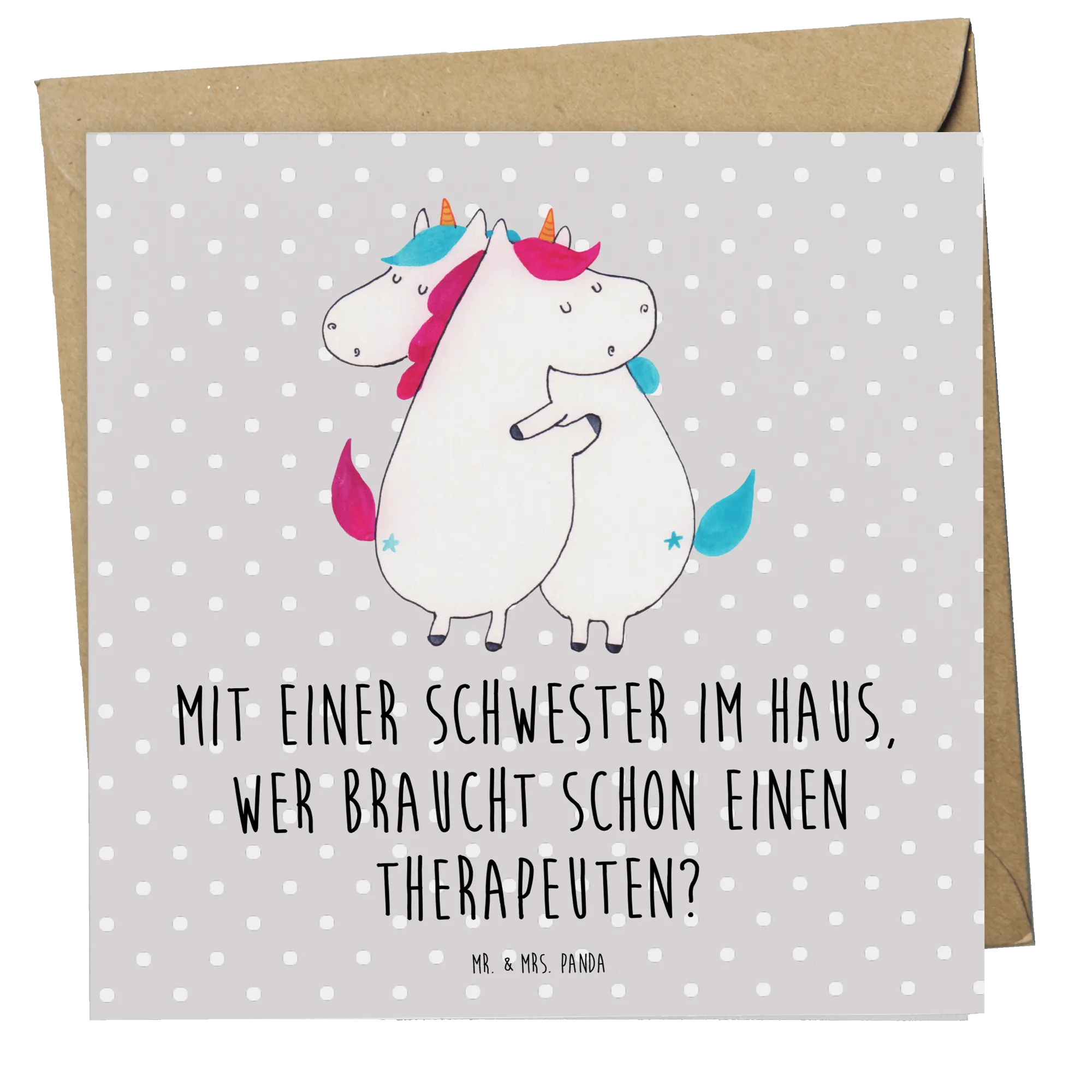 Die Deluxe Karte für Schwestern von Mr. & Mrs. Panda ist das perfekte Geschenk, um die einzigartige Beziehung zwischen Geschwistern zu feiern. Mit dem liebevollen Spruch "Mit einer Schwester im Haus, wer braucht schon einen Therapeuten?" vermittelt sie auf humorvolle Weise, wie wichtig und wertvoll Schwestern füreinander sind. Diese hochwertige Karte ist nicht nur eine Grußkarte, sondern ein zeitloses Familiengeschenk, das bei verschiedenen Anlässen verwendet werden kann - sei es zum Geburtstag, zur Hochzeit oder als Dankeschön für einen besonderen Moment.