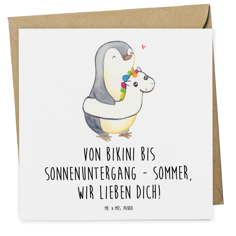 Die Deluxe Karte Sommer, Meer & Strand von Mr. & Mrs. Panda ist das ideale Geschenk für all jene, die sich an sonnige Tage am Strand und die Freude des Sommers erinnern möchten. Ob für einen Geburtstag, eine Hochzeit oder einfach nur als kleine Aufmerksamkeit für einen lieben Menschen – diese wunderschöne, hochwertige Karte ist für jede Gelegenheit perfekt geeignet. Der strahlend blaue Himmel, das sanfte Rauschen der Wellen und der warme Sand unter den Füßen kommen direkt in den Sinn, wenn Du die Karte in den Händen haltst. Die Karte ist aus edlem 300 Gramm Karton gefertigt und überzeugt durch ihre hochglänzend veredelte Vorderseite. Der fröhliche Slogan "Von Bikini bis Sonnenuntergang - Sommer, wir lieben dich!" sorgt zudem für ein Lächeln auf den Lippen des Empfängers.