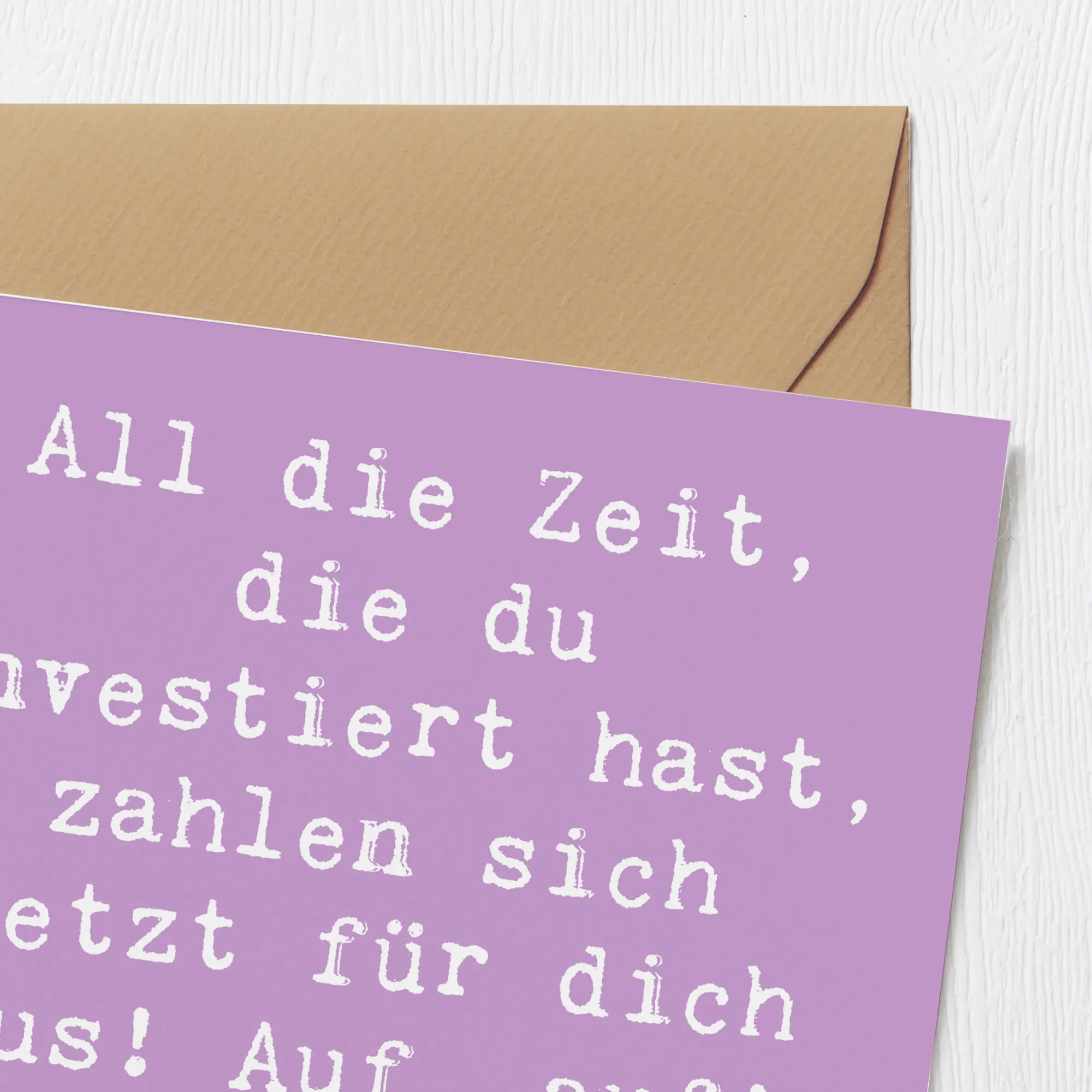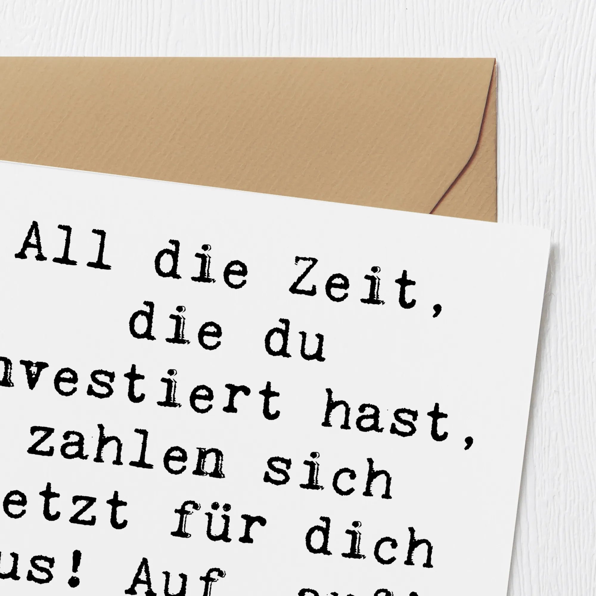 Der Slogan "All die Zeit, die du investiert hast, zahlen sich jetzt für dich aus! Auf, auf! Hol dir den Sieg!" wird jeden Motivierten inspirieren. Diese Karte ist ideal für Anlässe wie Geburtstage, Hochzeiten oder jede Art von Verabschiedung, wenn du jemandem eine Freude machen oder Trost spenden möchtest.