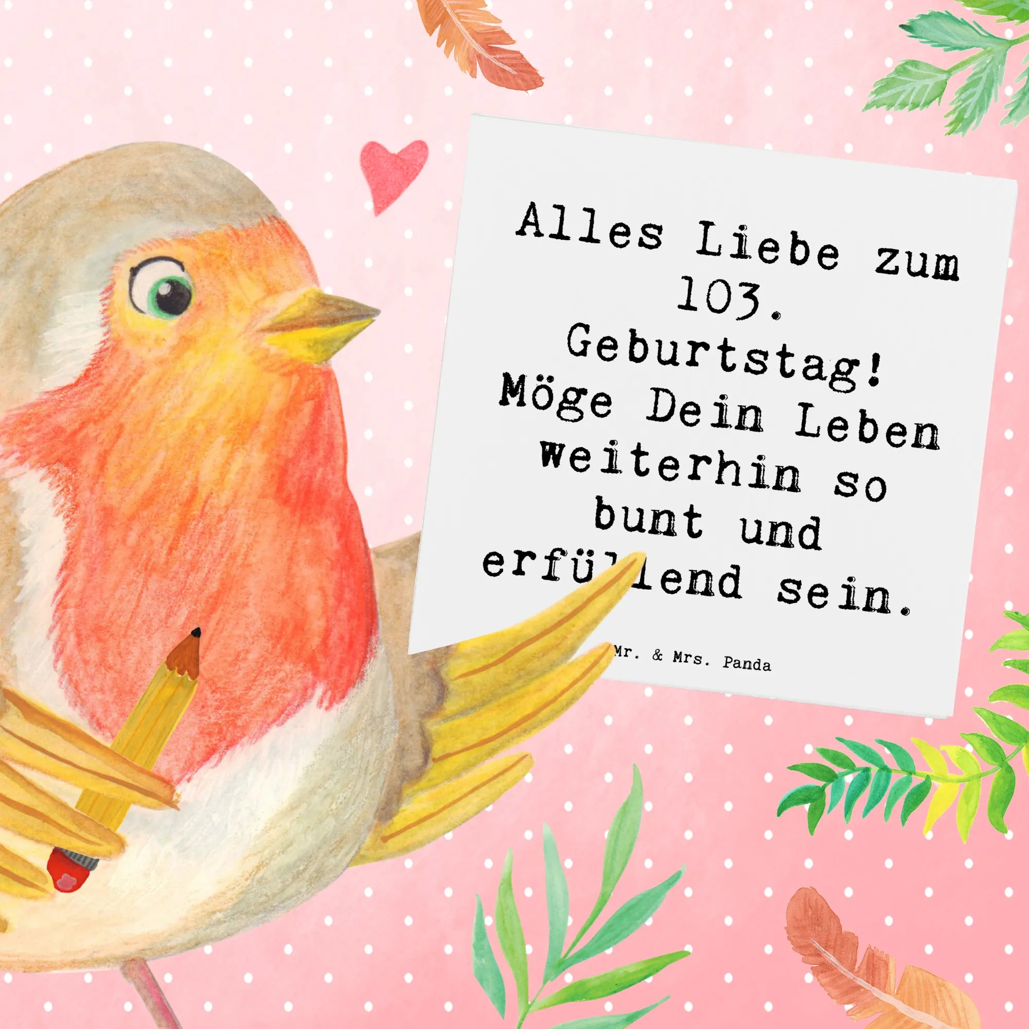 Die Deluxe Karte zum 103. Geburtstag ist nicht personalisierbar, aber das macht sie nicht weniger einzigartig! Sie wurde gezielt für diesen Ehrentag entworfen und bringt mit ihrem fröhlichen Design und dem liebevollen Spruch jeden Beschenkten zum Lächeln. Perfekt zum Geburtstag, für Glückwünsche und als herzliche Geste – mit der Karte von Mr. & Mrs. Panda schenkst Du Freude und Liebe in einer wunderschönen Verpackung. Mach den 103. Geburtstag zu einem unvergesslichen Erlebnis mit dieser besonderen Karte und zaubere ein Lächeln auf das Gesicht des Beschenkten!