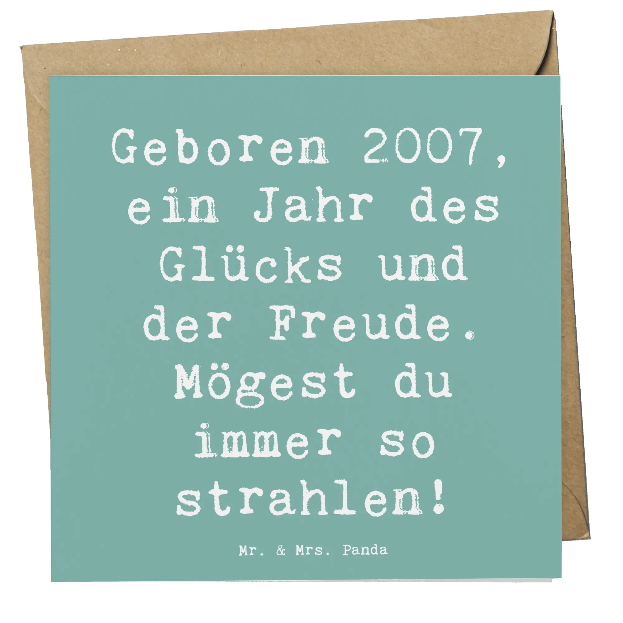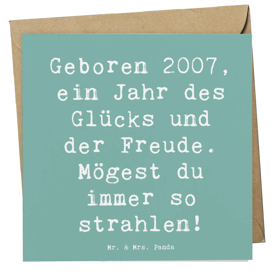 Die Deluxe Karte "Geboren 2007, ein Jahr des Glücks und der Freude. Mögest du immer so strahlen!" von Mr. & Mrs. Panda ist das perfekte Geschenk für all diejenigen, die 2007 das Licht der Welt erblickt haben. Sie ist nicht nur eine einfache Grußkarte, sondern ein liebevolles Jubiläum, das die besonderen Momente des Lebens feiert. Jede Karte kommt mit einem edlen Umschlag und ist aus hochwertigem 300 Gramm Papier gefertigt, was ihr eine stilvolle Optik verleiht. Die hochglänzend veredelte Vorderseite leuchtet förmlich und macht die Karte zu einem echten Hingucker. Verziert mit süßen, handgezeichneten Motiven, erzählt sie die Geschichte eines besonderen Geburtstagskindes, das im Jahr 2007 geboren wurde.