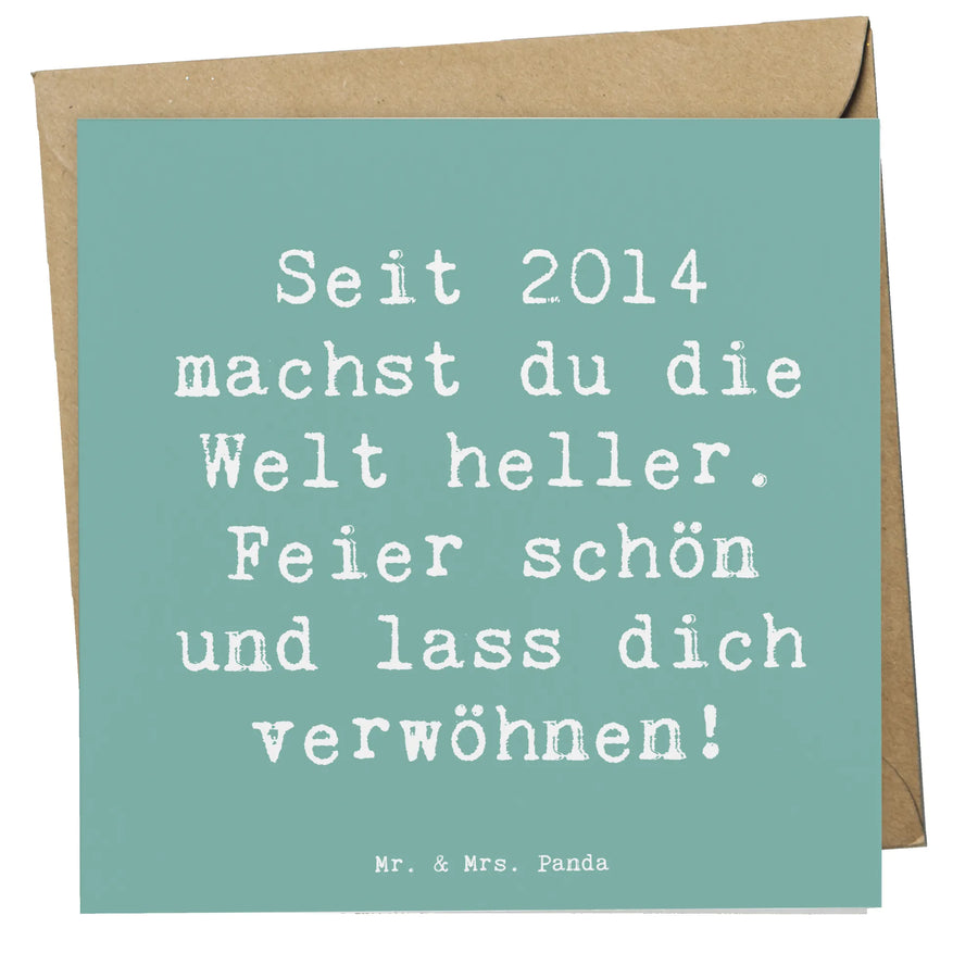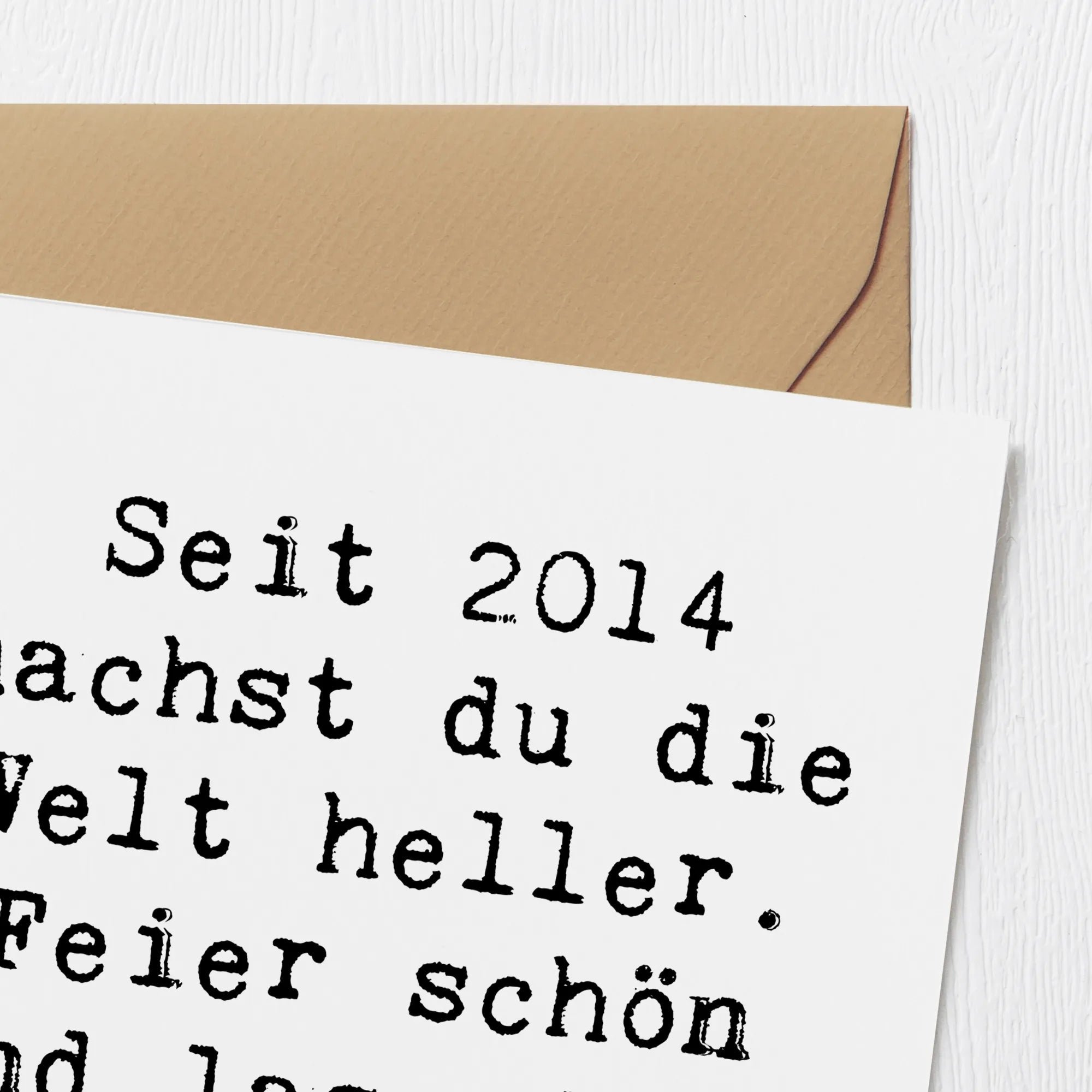 Jeder, der 2014 geboren wurde oder einen besonderen Menschen in diesem Jahr gefeiert hat, wird diese Karte lieben. Warum? Weil sie mit dem Slogan "Seit 2014 machst du die Welt heller. Feier schön und lass dich verwöhnen!" daherkommt – ein Spruch, der Herzen erwärmt und an die Freude des Lebens erinnert. Du kannst diese Karte für zahlreiche Anlässe nutzen, sei es für eine Geburtstagsfeier, eine Hochzeit oder einfach nur, um jemandem eine Freude zu machen.
