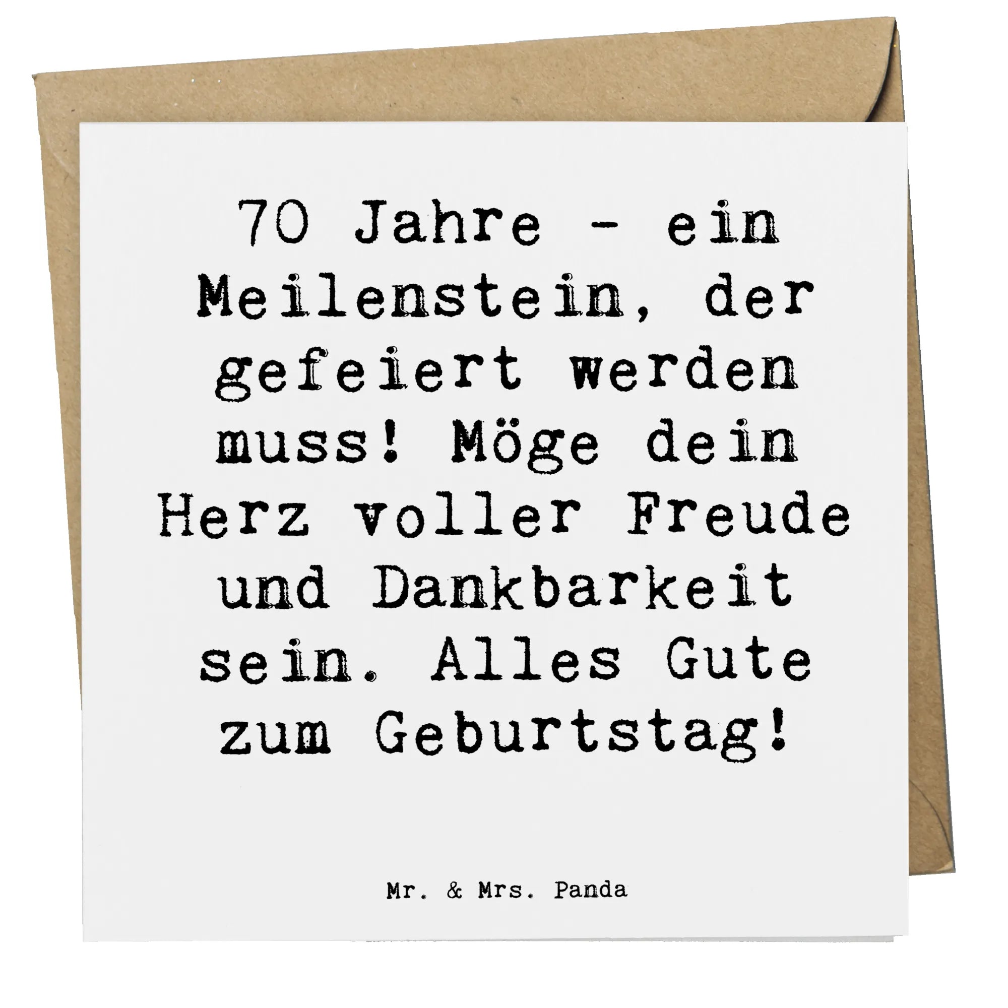 Mit dem bezaubernden Slogan '70 Jahre - ein Meilenstein, der gefeiert werden muss! Möge dein Herz voller Freude und Dankbarkeit sein. Alles Gute zum Geburtstag!' zauberst du garantiert ein Lächeln auf das Gesicht des Jubilars. Die Karte stammt aus unserer speziellen Kollektion 'Geburtstag Alter' und wurde von der kreativen Hand von Mrs. Panda handgezeichnet. Sie kombiniert niedliche Aquarell-Illustrationen mit einem sentimentalen Spruch, der perfekt für diesen besonderen Anlass ist. Egal, ob du die Karte für einen Freund, ein Familienmitglied oder einen Kollegen auswählst, sie wird immer gut ankommen!