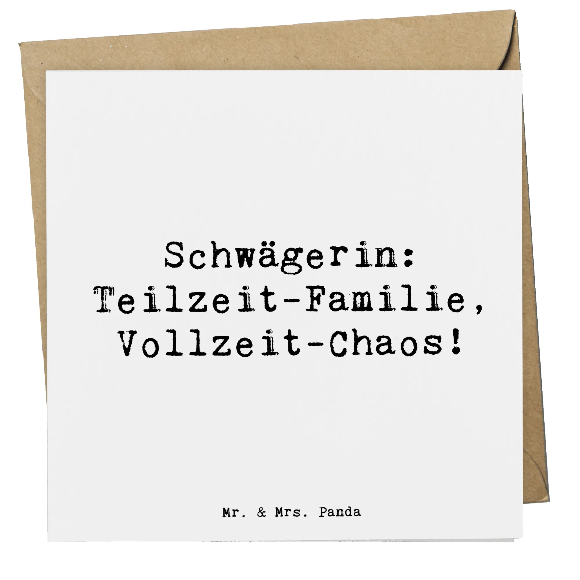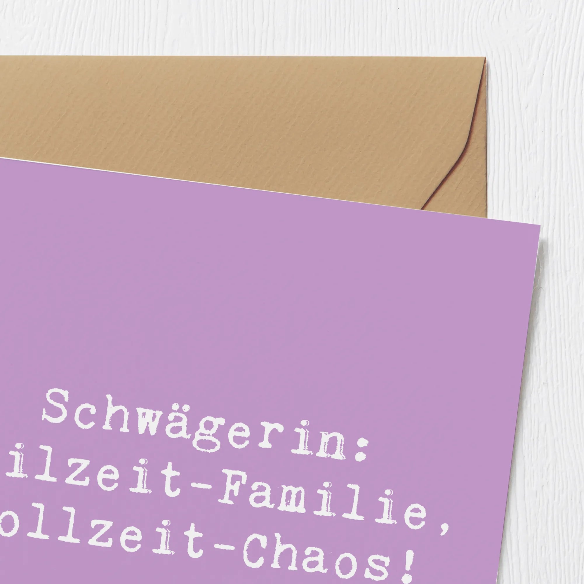 Die Karte ist aus hochwertigem 300 Gramm Karton gefertigt und hat eine edle, hochglänzende Vorderseite, die das liebevoll gestaltete Motiv perfekt zur Geltung bringt. Mit dem witzigen Spruch 'Schwägerin: Teilzeit-Familie, Vollzeit-Chaos!' wird ein Lächeln auf ihr Gesicht gezaubert.