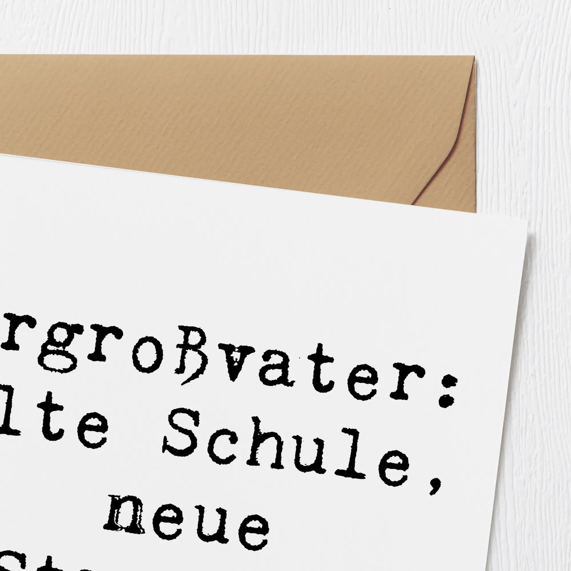 Die Karte misst 140 mm x 140 mm und besteht aus edlem 300 Gramm Karton, der nicht nur robust, sondern auch besonders edel ist. Sie verfügt über eine hochglänzend veredelte Vorderseite und Rückseite, während die Innenseite matt gehalten ist, sodass Du sie leicht beschriften kannst. Du findest auf der Vorderseite den charmanten Spruch "Urgroßvater: Alte Schule, neue Streiche!", der ein Lächeln auf die Gesichter Deiner Liebsten zaubert.