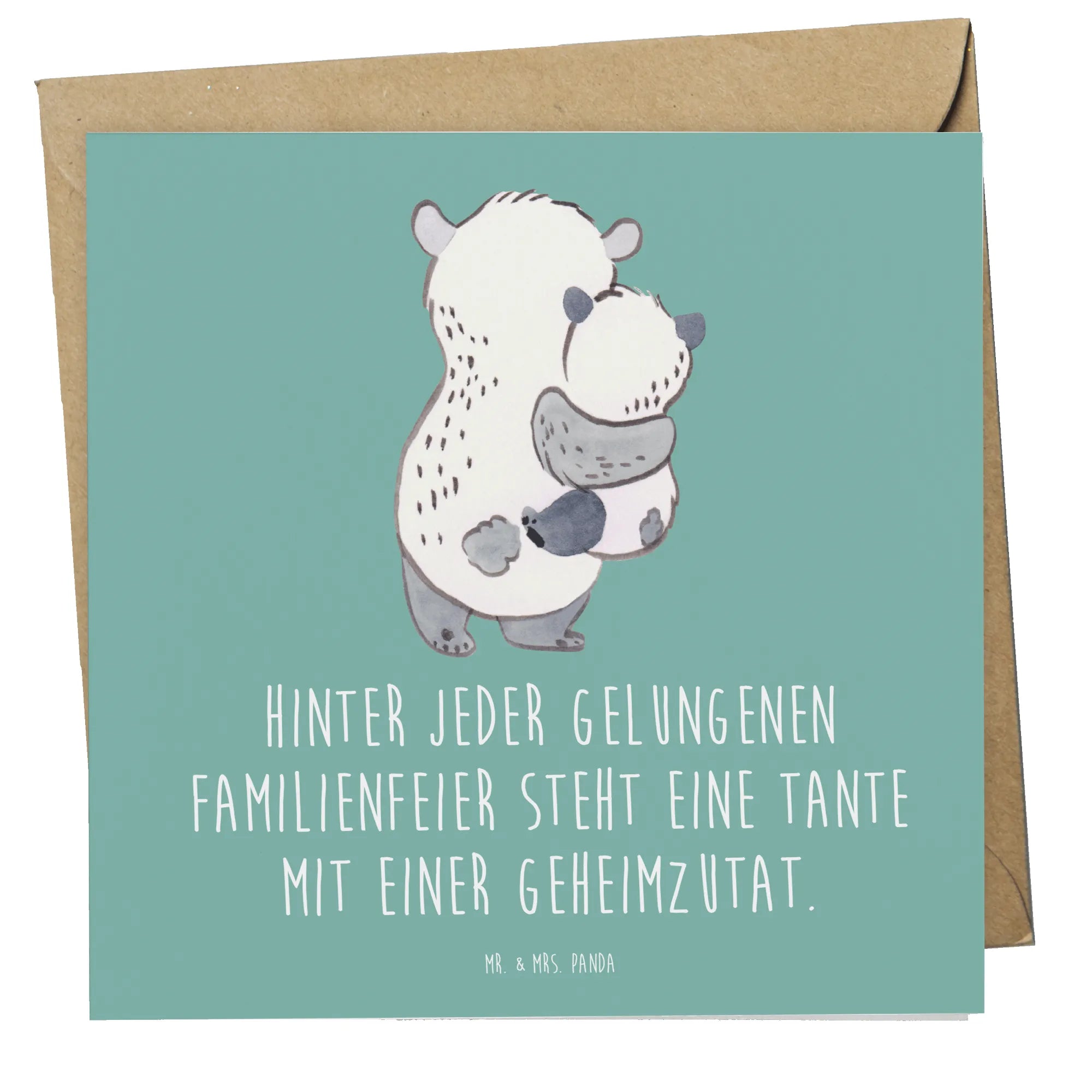 Die Deluxe Karte mit dem liebevollen Motiv "Tante" aus der Kollektion "Familie & Verwandte" von Mr. & Mrs. Panda ist das perfekte Geschenk für jeden Anlass. Ob Geburtstag, Hochzeit oder einfach so, diese wunderschöne und besonders hochwertige quadratische Karte ist ideal, um besondere Grüße oder Glückwünsche an deine Tante zu senden. Mit einem liebevoll gestalteten Spruch auf der Vorderseite, der lauten soll: 'Hinter jeder gelungenen Familienfeier steht eine Tante mit einer Geheimzutat.' wird jeder Anlass zu etwas Besonderem.
