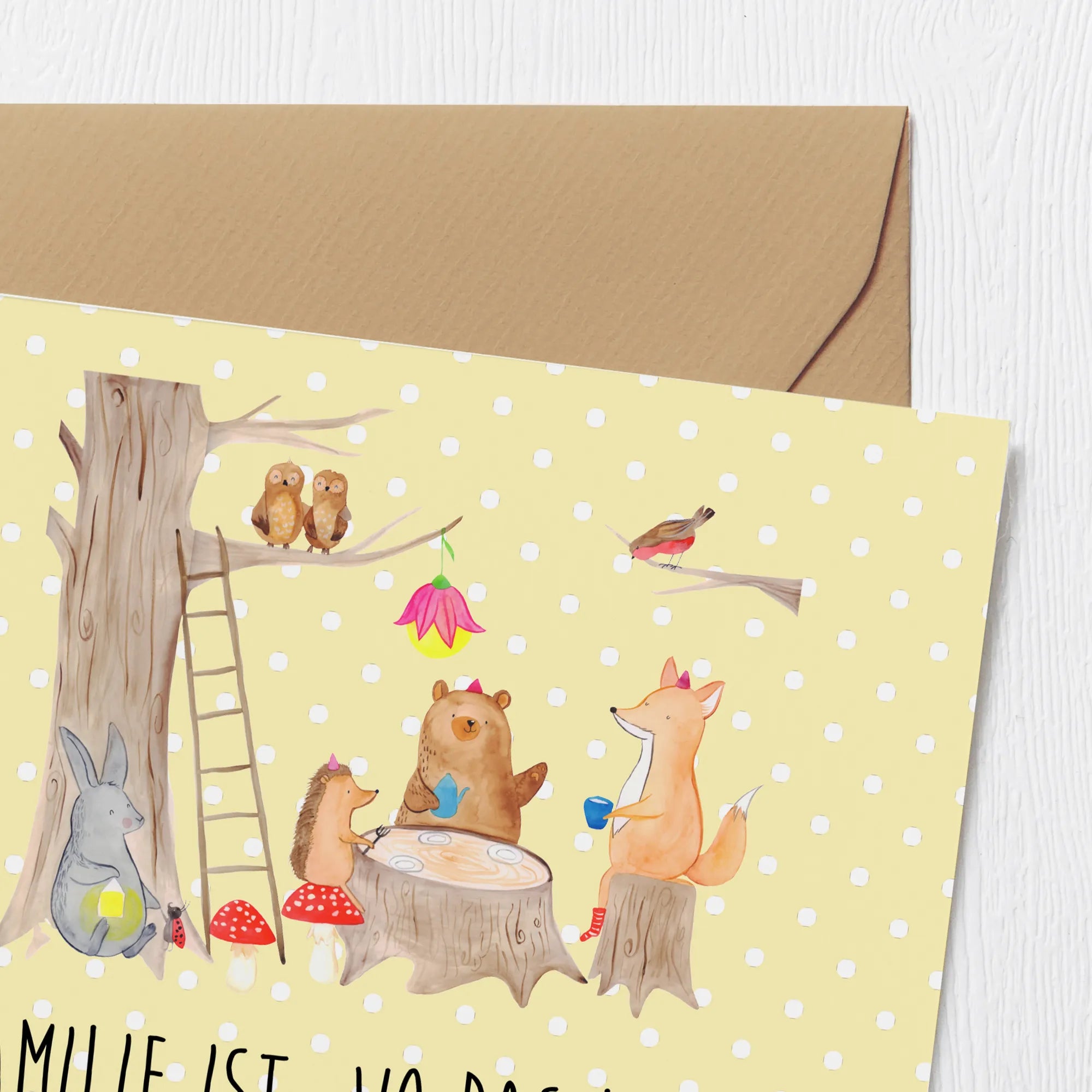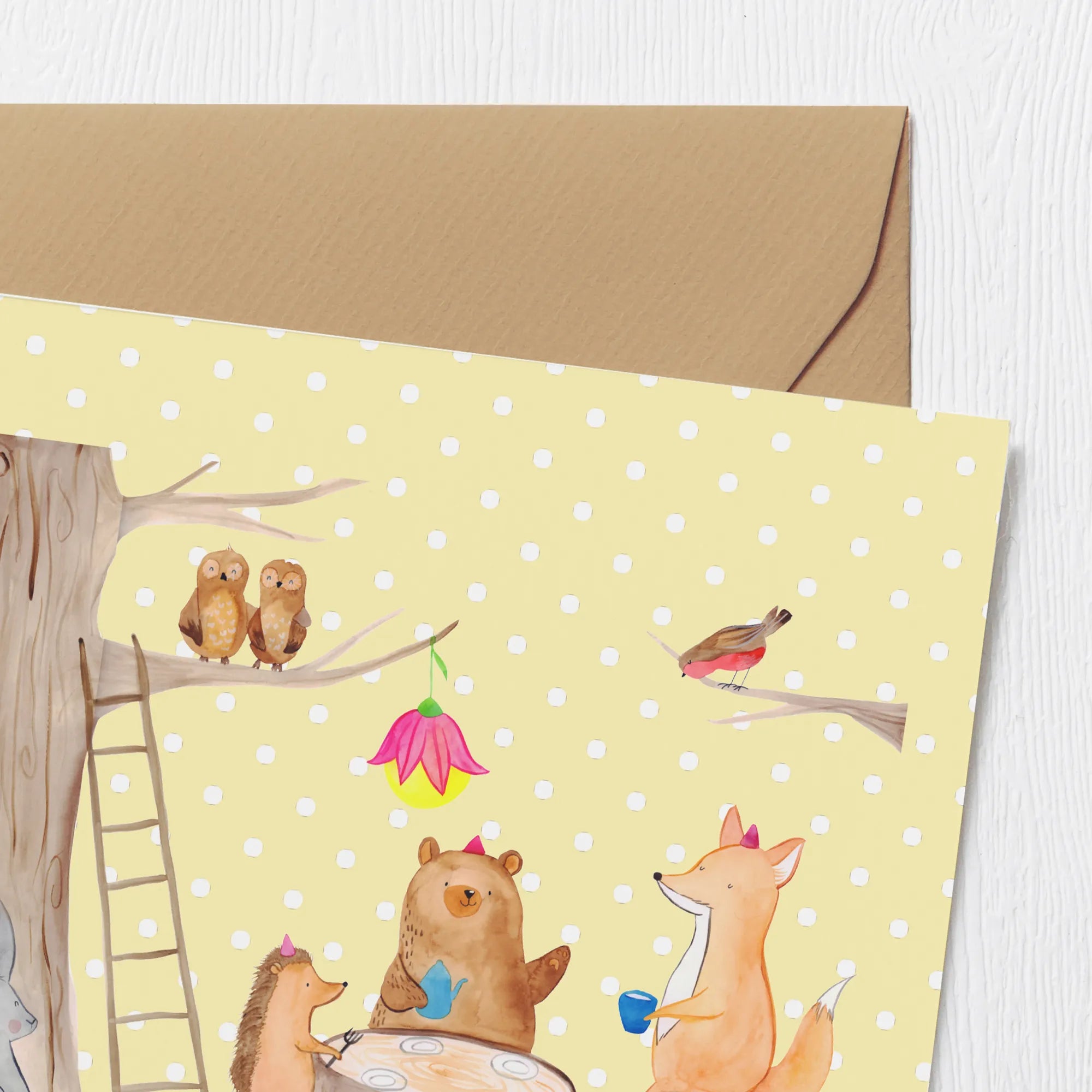 Grußkarte Waldtiere Picknick - mit Spruch - Gelb Pastell