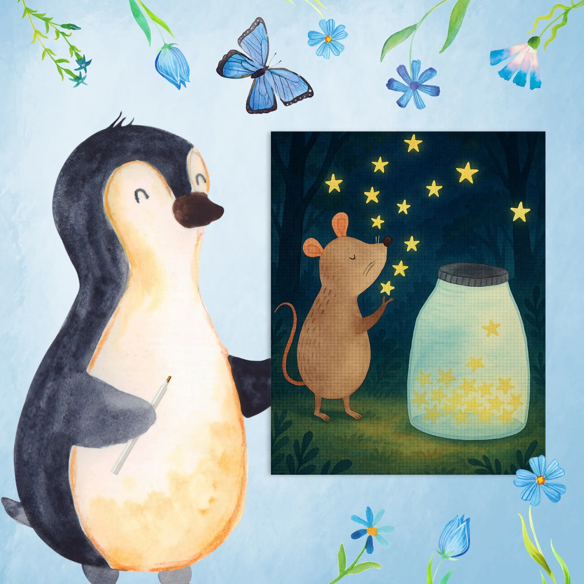 Stell dir eine kleine, süße Maus vor, die vor einem glänzenden Glas voller funkelnder Sterne sitzt. Diese Maus hat große, leuchtende Augen, und ihr Lächeln strahlt pure Freude aus. Sie lässt die Sterne sanft in die Luft steigen, ein Zeichen für all die Wünsche und Träume, die in der Luft liegen. Ob zur Taufe, zur Geburt des ersten Kindes oder zum Kindergeburtstag – diese Maus symbolisiert die Hoffnung und die unendlichen Möglichkeiten, die das Leben bietet. Sie steht für die kleinen Dinge im Leben, die uns immer wieder zum Träumen anregen. Wenn du ein schönes Taufgeschenk suchst oder einem besonderen Kind etwas ganz Persönliches schenken möchtest, dann ist dieses Motiv genau das richtige. Es ist eine Einladung, die Herzen der Kleinen mit Liebe und Wärme zu füllen. Lass die Maus auch dich inspirieren, deine Wünsche zu fliegen zu lassen und die Sterne zu erreichen.