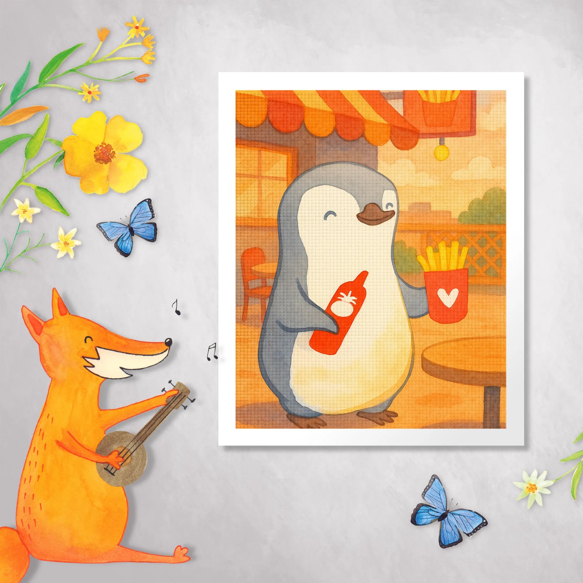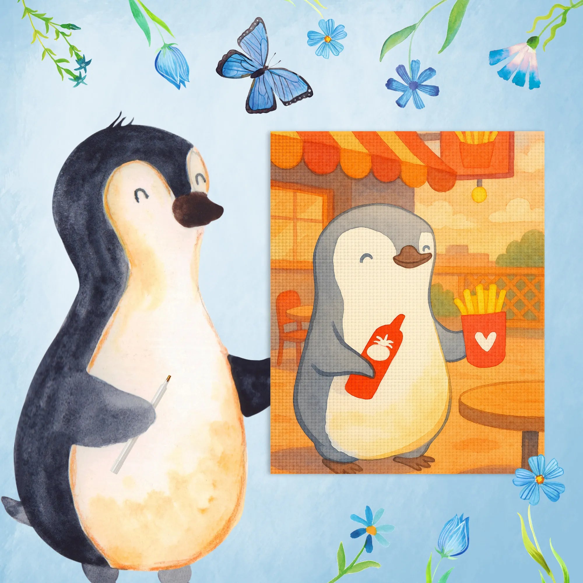 Dieser lächelnde Pinguin hält mit seinen Flügeln eine Portion Pommes Frites bereit, verziert mit einer Flasche Ketchup in der anderen Hand. Ein solches Motiv ist nicht nur niedlich, sondern auch ein wunderbarer Ausdruck von Zuneigung. Egal ob zum Hochzeitstag oder einfach, um jemandem einen schönen Tag zu bereiten, dieser Pinguin bringt mit seiner positiven Ausstrahlung und den sanften Farben zweifellos Freude in jeden Haushalt. Manchmal sind es die kleinen Dinge im Leben, die die größte Bedeutung haben, und eine Portion Pommes mit einer lieben Botschaft ist genau das! Verwöhne deine Freundin mit diesem hübschen Geschenk, das perfekt für jeden speziellen Moment ist. Lass den Pinguin für dich sprechen und zeige, dass wahre Liebe auch durch die kleinen Freuden des Lebens kommt, wie sie mit einer Portion Pommes verbunden sind.
