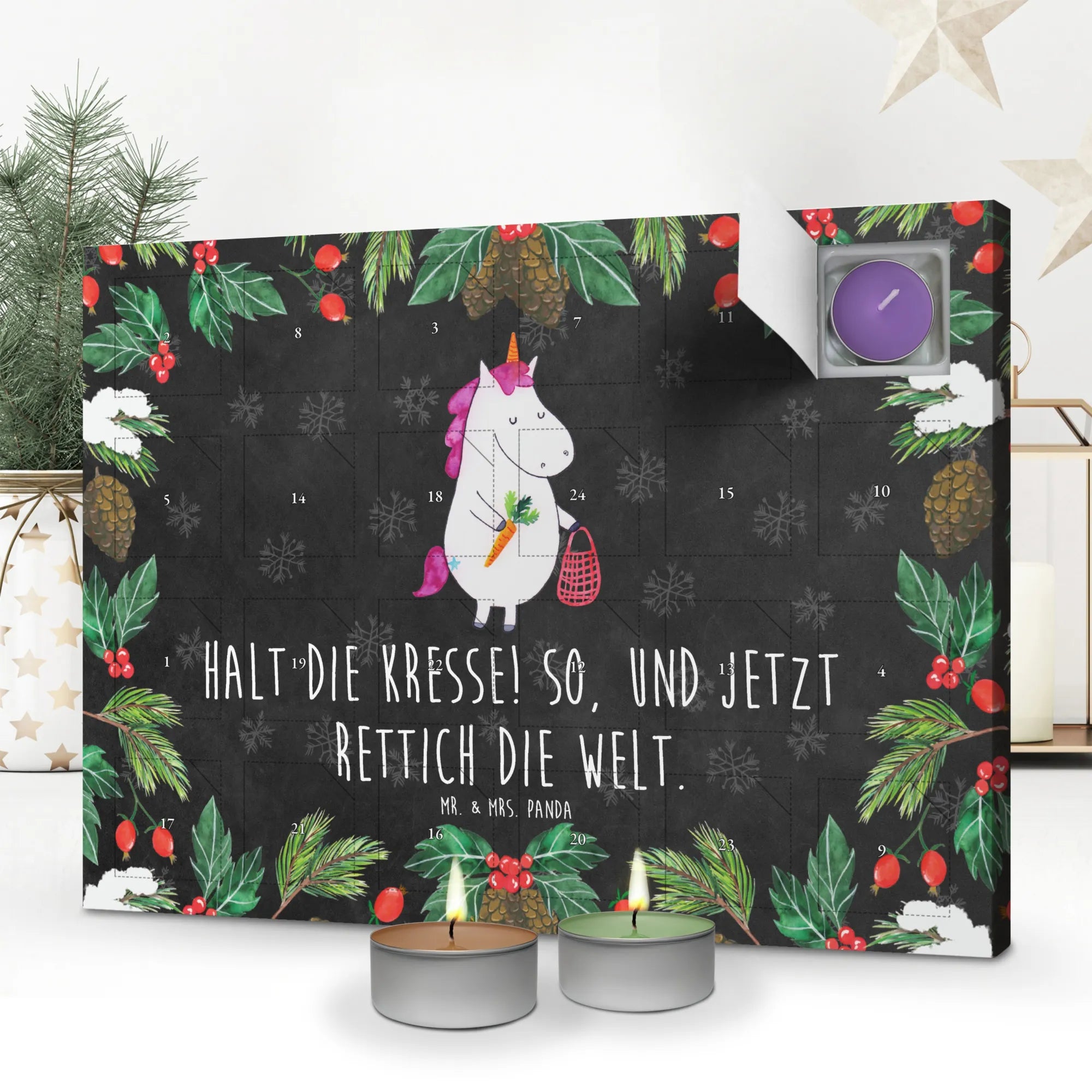 Der Duftkerzen Adventskalender "Einhorn Gemüse" von Mr. & Mrs. Panda ist der perfekte Begleiter für die Vorweihnachtszeit. Mit liebevollen Motiven und originellen Sprüchen zaubert er jeden Tag ein Lächeln auf dein Gesicht. Auf dem Kalender prangt ein niedliches Einhorn, das frisches Gemüse vom Wochenmarkt mitgebracht hat, und voller Freude ruft es: "Halt die Kresse! So, und jetzt Rettich die Welt." Ein schöner Spruch, der die besinnliche Zeit perfekt umschreibt!