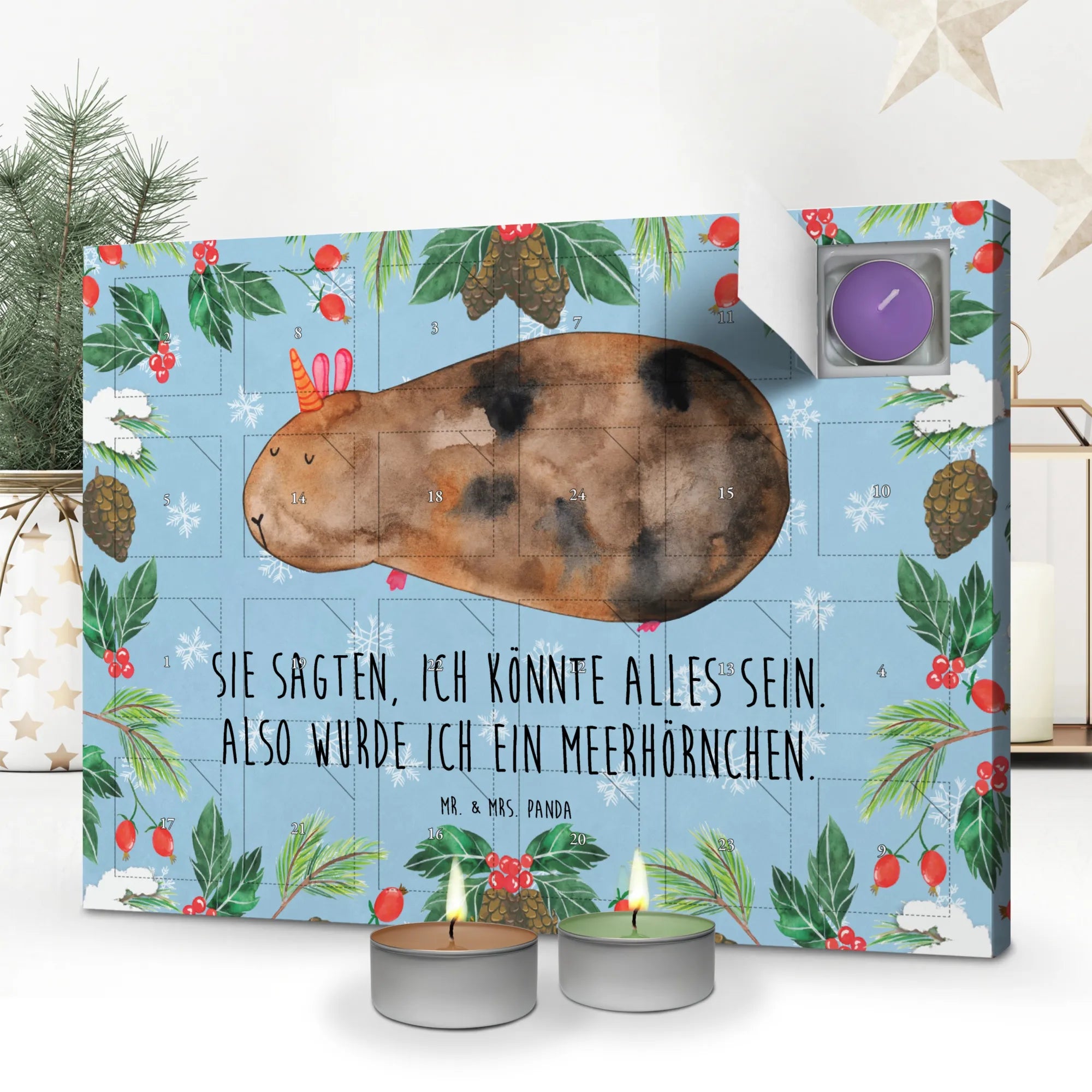 Du suchst nach dem perfekten Geschenk für eine ganz besondere Person in der Adventszeit? Dann ist der wundervolle Duftkerzen Adventskalender mit dem süßen Meerhörnchen-Motiv aus der Einhorn-Kollektion von Mr. & Mrs. Panda genau das Richtige! Dieser Adventskalender bringt nicht nur vorweihnachtliche Freude, sondern auch zauberhafte Düfte in dein Zuhause. Täglich erwartet dich ein neuer, weihnachtlicher Duft – ob Vanille, Lavendel, Grüner Tee, Apfel-Zimt, Granatapfel oder Oud Wood – hier ist für jeden etwas dabei!