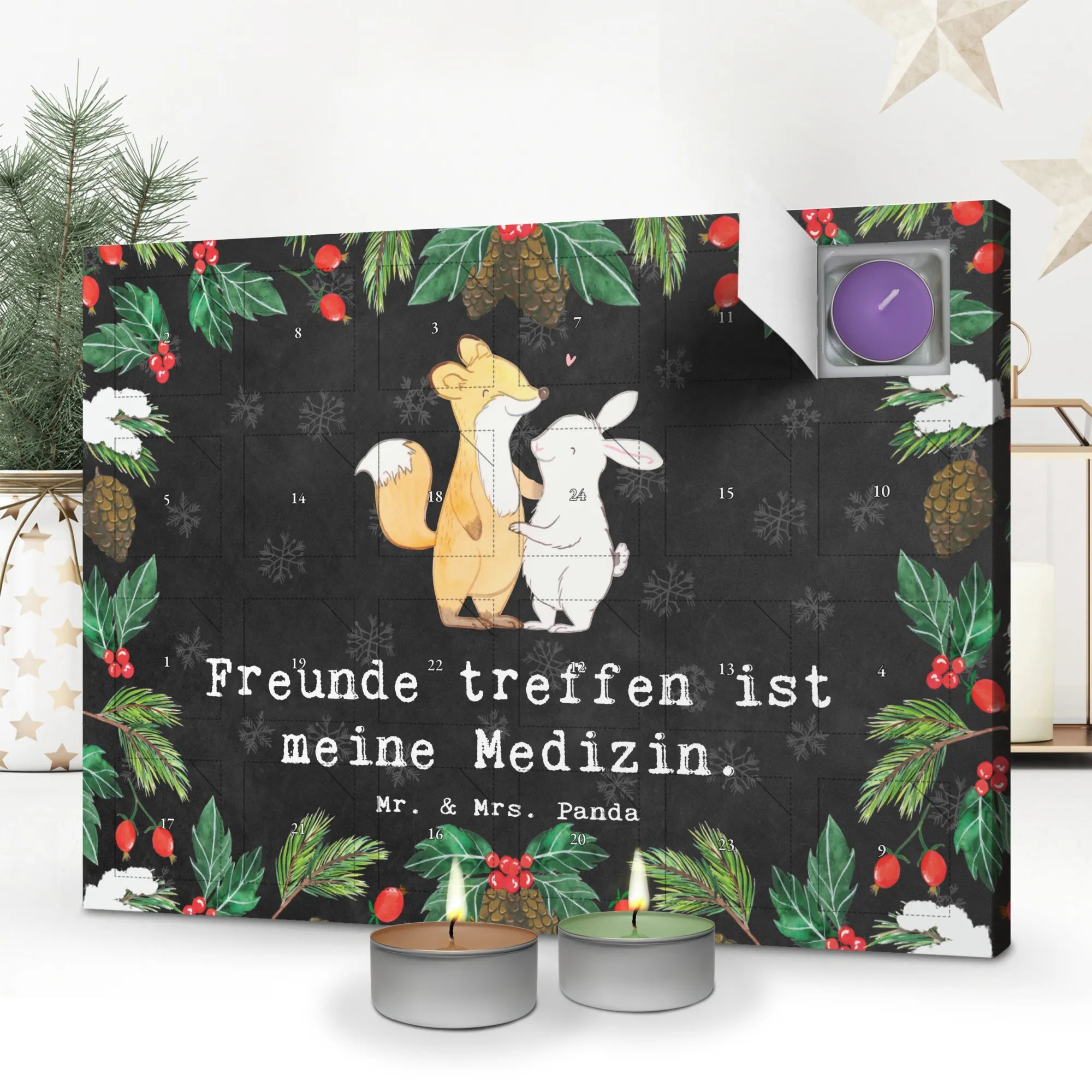 Der Duftkerzen Adventskalender „Fuchs Hase Freunde treffen Medizin“ von Mr. & Mrs. Panda ist das perfekte Geschenk für alle, die die Vorweihnachtszeit lieben und gerne ihre Freunde um sich haben. Mit einem einzigartigen, handgezeichneten Motiv von einem süßen Fuchs und einem niedlichen Hasen, die sich umarmen und glücklich miteinander sind, bringt dieser Adventskalender ein Lächeln auf jedes Gesicht. Der Spruch 'Freunde treffen ist meine Medizin' drückt wunderbar aus, wie wichtig Freundschaft ist und wie sie unsere Seele nährt.
