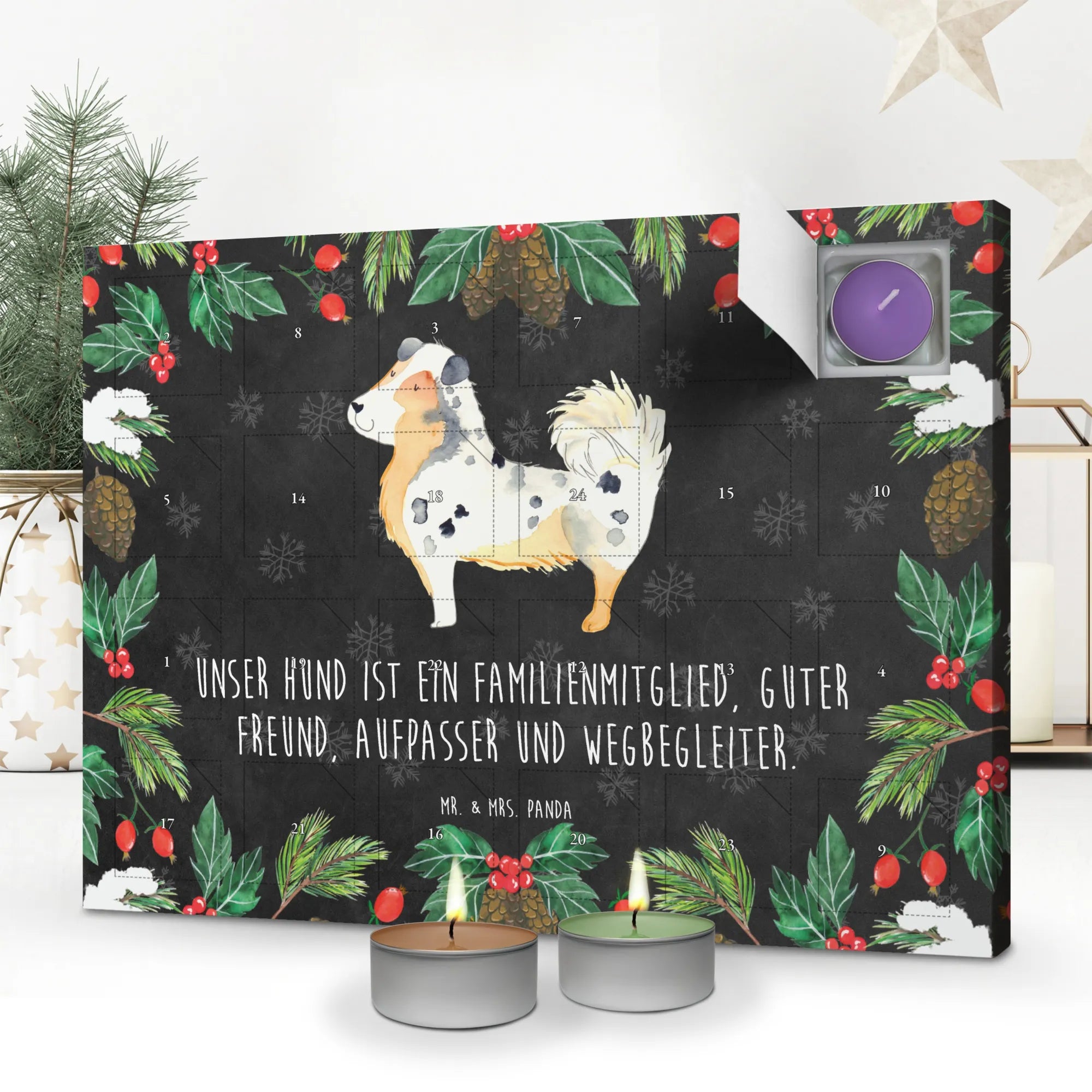 Der Duftkerzen Adventskalender mit dem liebevollen Motiv des Australian Shepherd von Mr. & Mrs. Panda ist das perfekte Geschenk für alle Hundeliebhaber und Familien, die ihre Vorfreude auf Weihnachten mit einer besonderen Note verbinden möchten. Mit dem Slogan „Unser Hund ist ein Familienmitglied, guter Freund, Aufpasser und Wegbegleiter“ bringt dieser Adventskalender die unendliche Liebe und Treue unserer vierbeinigen Freunde wunderbar zum Ausdruck.