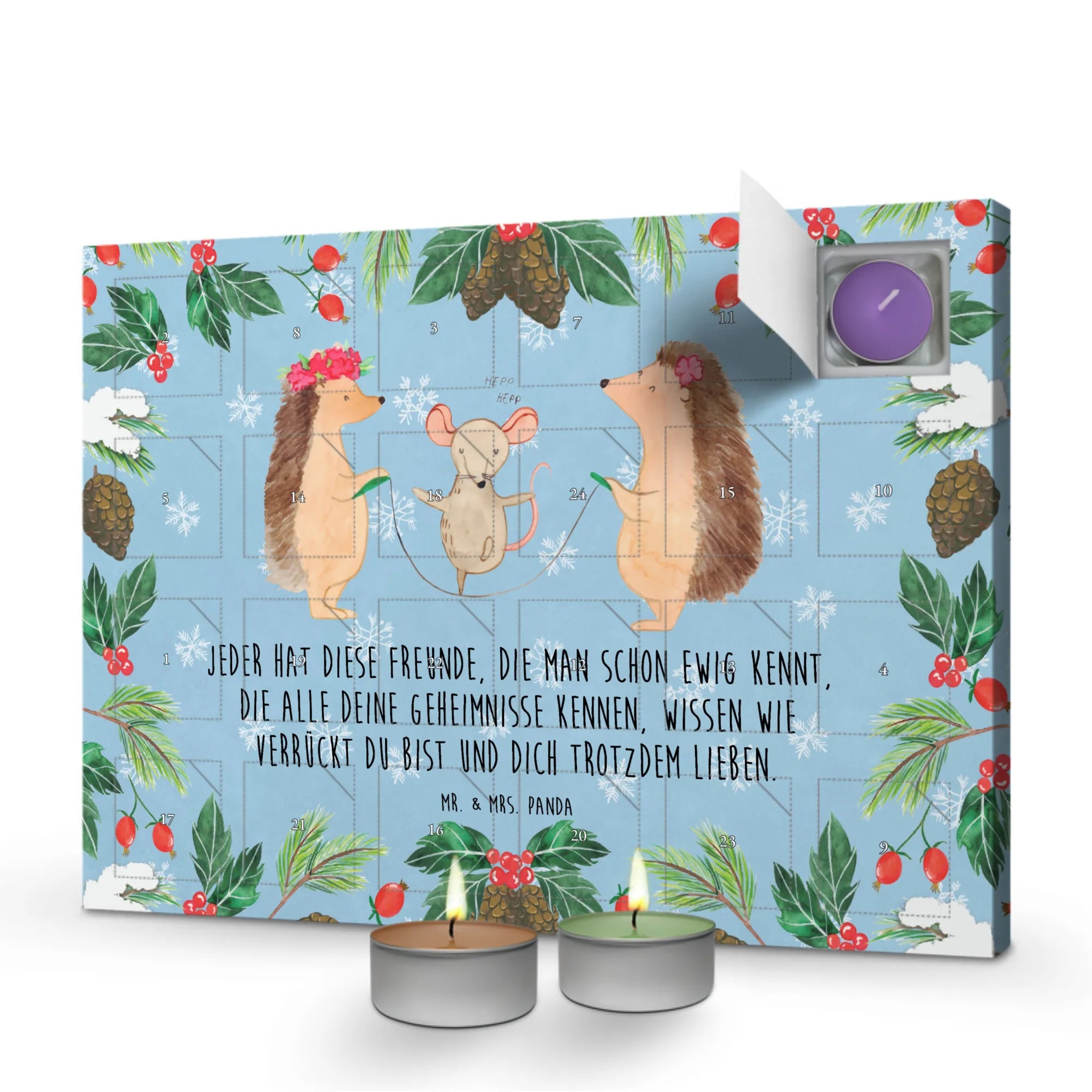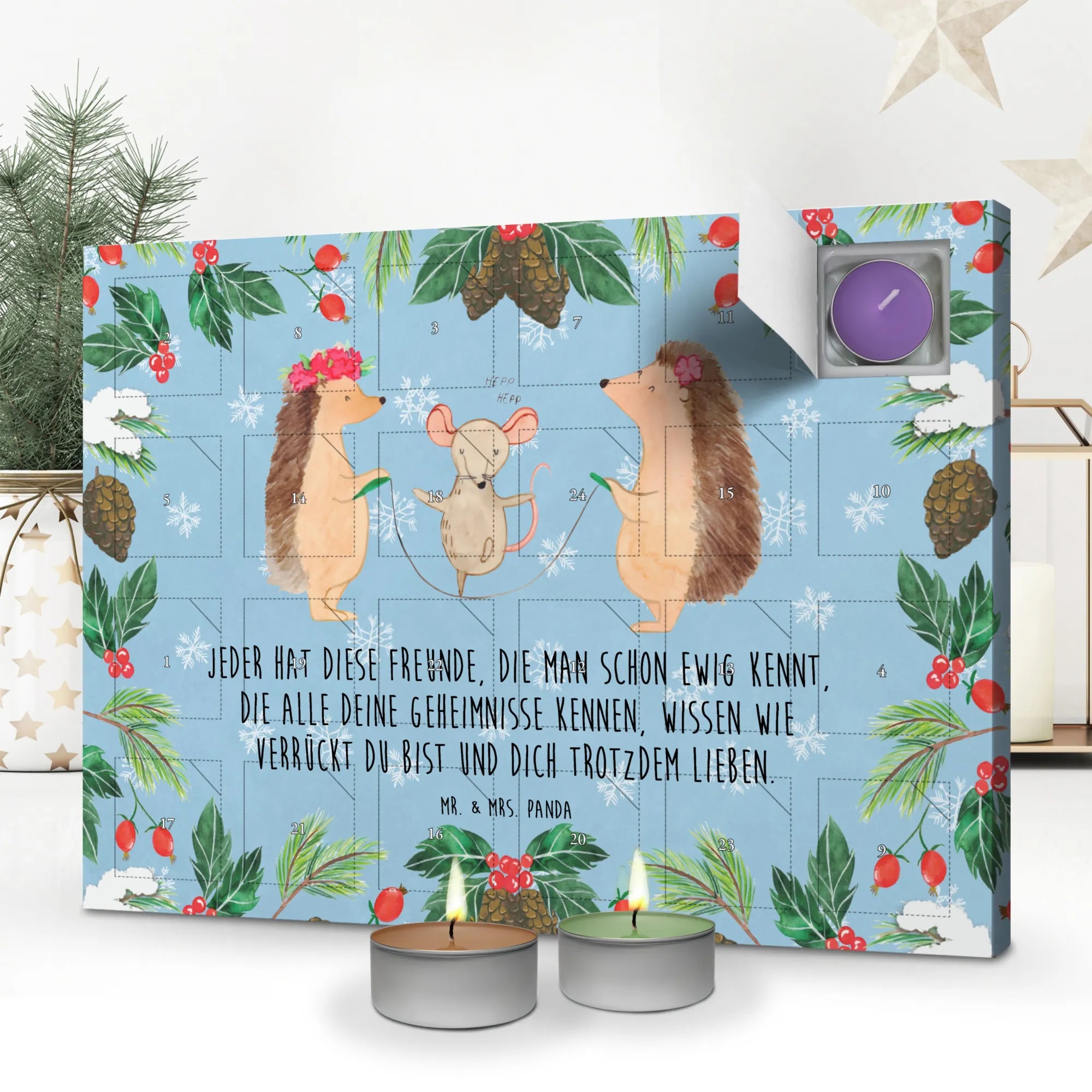 Mit seinem niedlichen Motiv der Seilhüpfenden Igel und der fröhlichen Maus bringt dieser Kalender Freude und gute Laune in jedes Zuhause. Die Zeichnung von Mrs. Panda ist nicht nur liebevoll, sondern auch eine schöne Erinnerung daran, dass das Leben mit Freunden noch viel mehr Spaß macht. Ob für das Kinderzimmer oder das Wohnzimmer, dieser Adventskalender ist ein wahrer Hingucker!