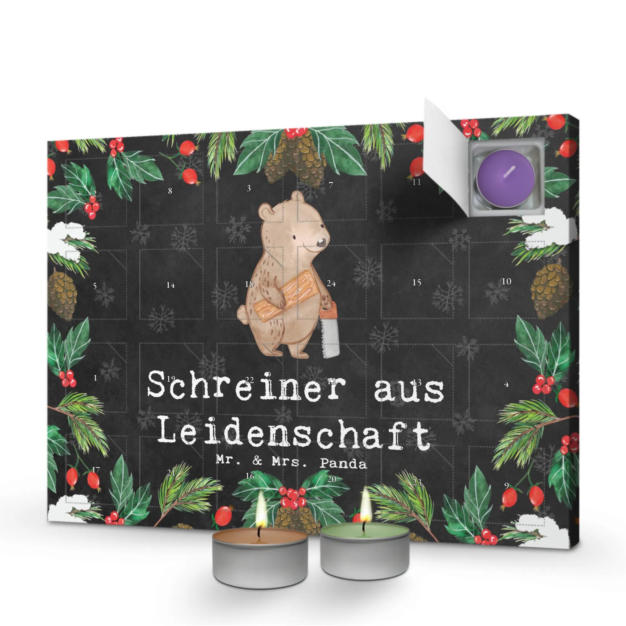Der Duftkerzen Adventskalender 'Schreiner aus Leidenschaft' von Mr. & Mrs. Panda ist das ideale Geschenk für alle, die in der Holzverarbeitung oder im Schreinerhandwerk tätig sind. Mit seinen liebevoll handgezeichneten Motiven, die einen süßen Bären zeigen, der in der einen Hand eine Säge und in der anderen ein Holzbrett hält, bringt dieser Kalender Freude und eine persönliche Note in die Vorweihnachtszeit.