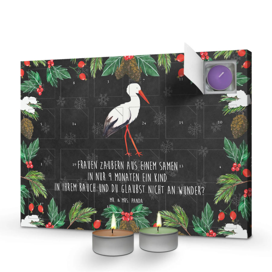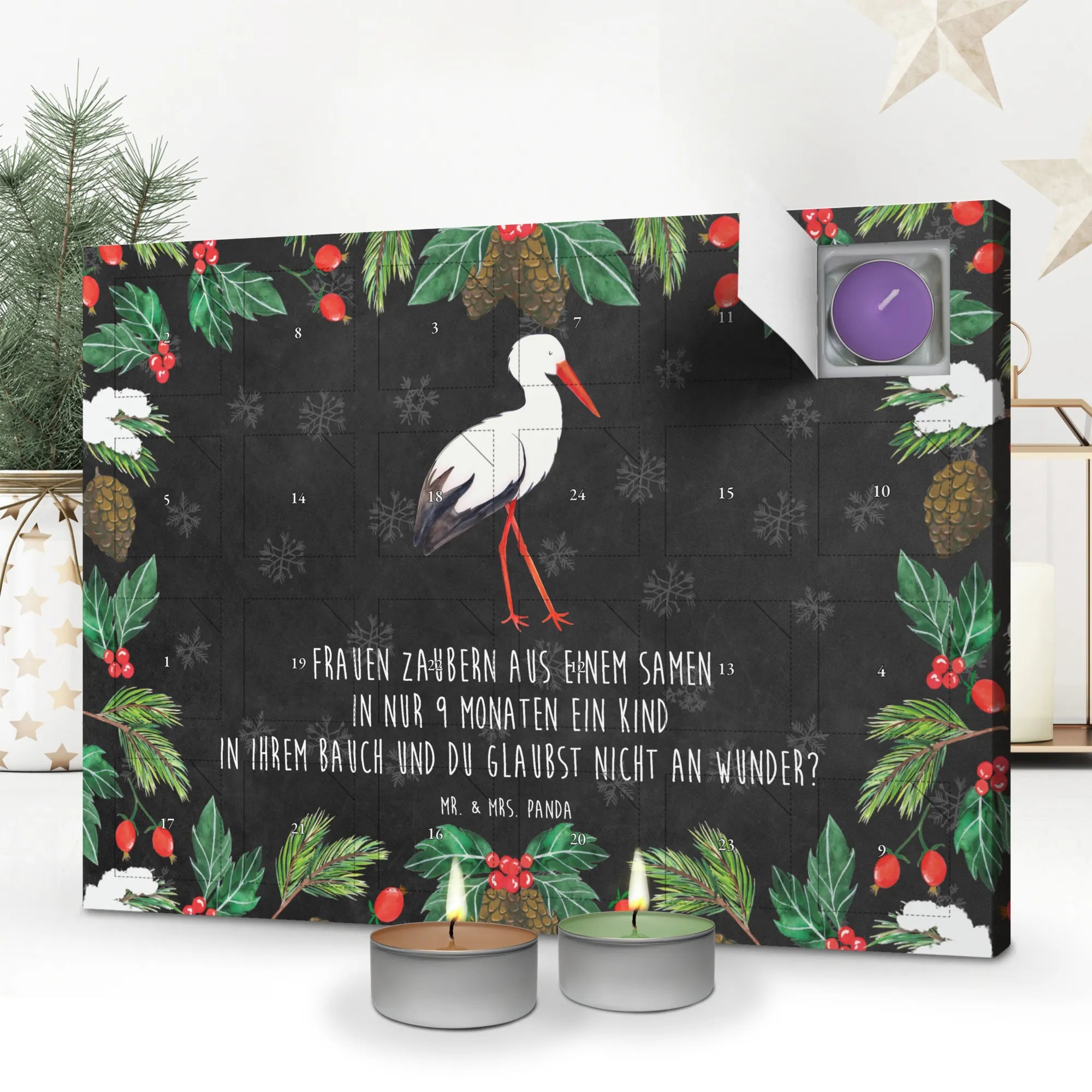 Verschenke Vorfreude, Wärme und Duft: Unser Duftkerzen Adventskalender mit dem niedlichen Storch-Motiv ist das ideale Geschenk für Schwangere, werdende Mütter und frischgebackene Mamas. Die liebevoll von Mrs. Panda handgezeichnete Illustration zeigt einen Storch mit Baby im Tuch und den humorvollen Spruch: