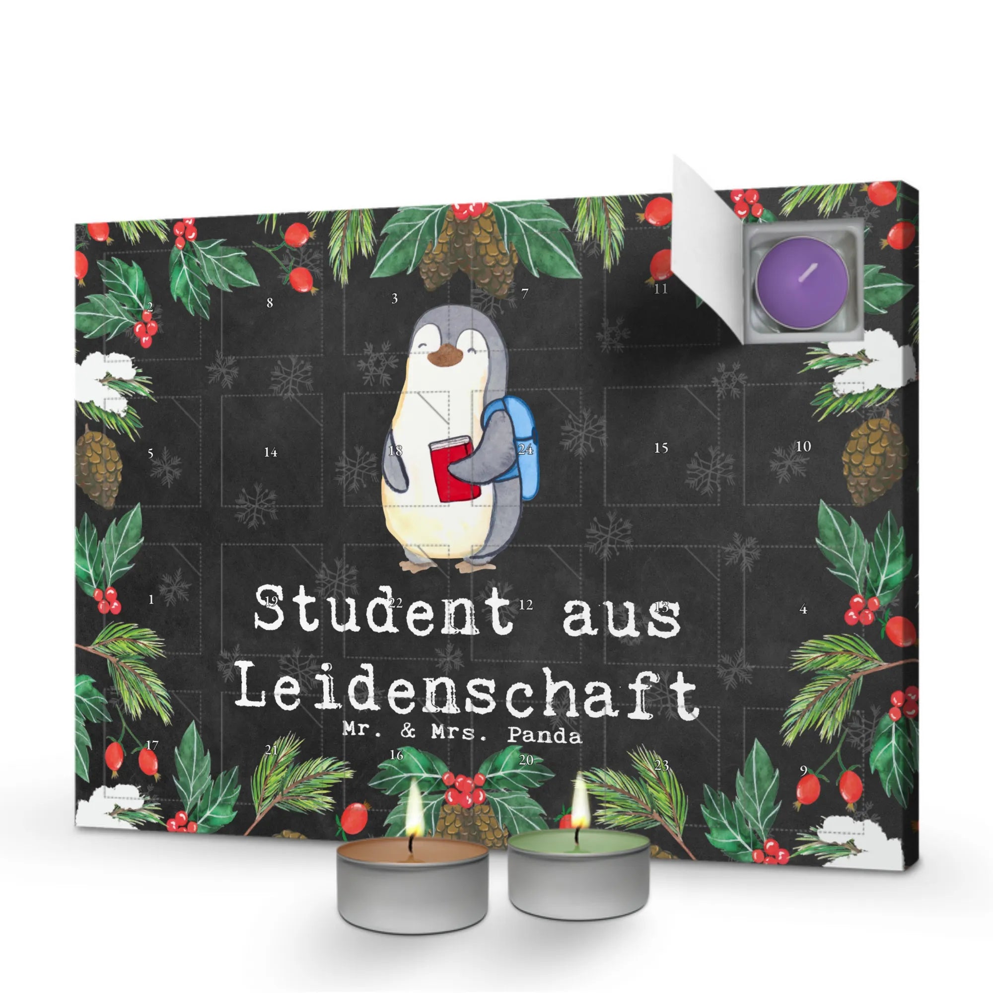 Der Adventskalender ist mit einem liebevoll gezeichneten Motiv von Mrs. Panda gestaltet: Ein süßer Pinguin mit einem Rucksack, der zeigt, dass Bildung und Leidenschaft Hand in Hand gehen. Egal ob für den Freund, die Freundin, Kollegen oder auch zur eigenen Freude – dieser Kalender ist das perfekte Geschenk zum Studienbeginn, als Dankeschön für eine Unterstützung oder als nette Geste zur Weihnachtszeit.