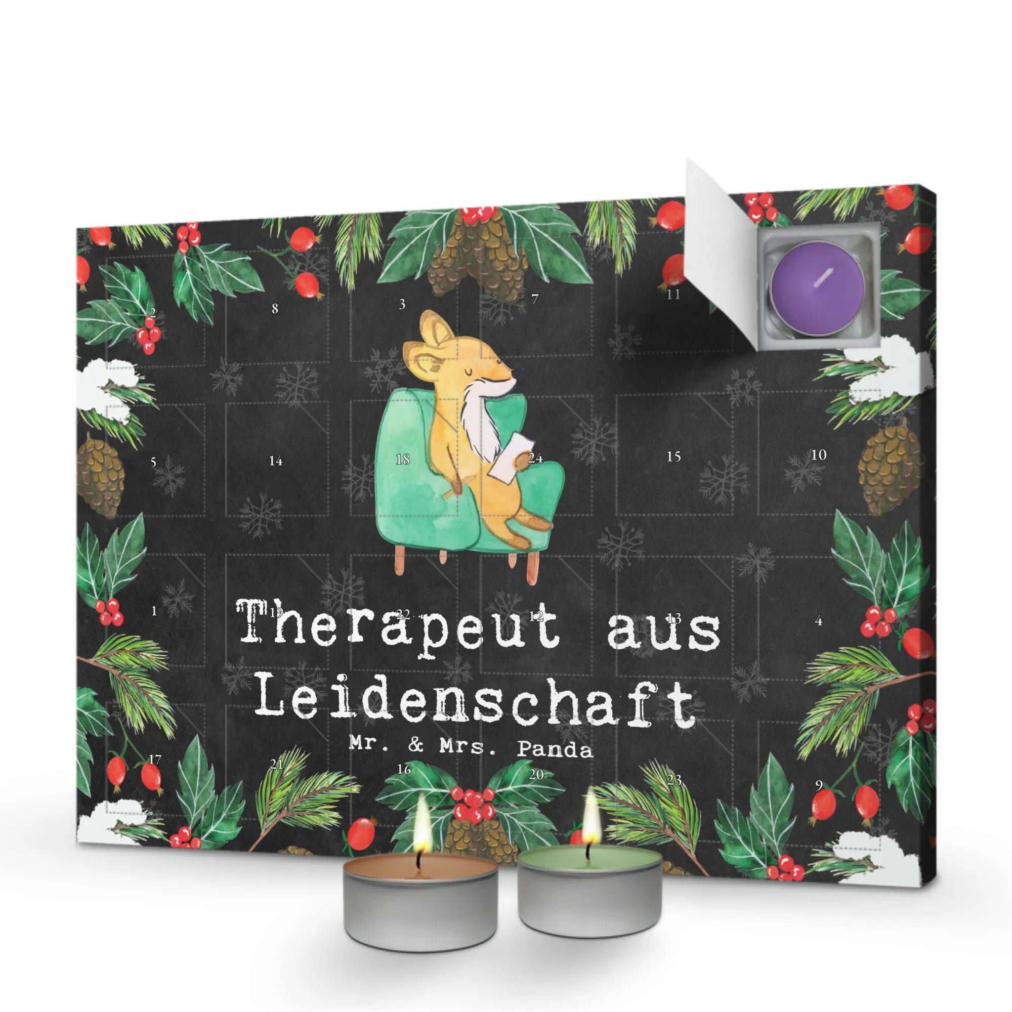 Der Duftkerzen Adventskalender "Therapeut aus Leidenschaft" von Mr. & Mrs. Panda ist das perfekte Geschenk für alle Therapeuten und Therapeutinnen! 🎁 Dieser wunderschöne Adventskalender hilft nicht nur dabei, die Vorfreude auf Weihnachten zu steigern, sondern bringt auch jeden Tag einen neuen, weihnachtlichen Duft in Dein Zuhause. Mit sechs verschiedenen Düften – Vanille, Lavendel, Grüner Tee, Apfel-Zimt, Granatapfel und Oud Wood – wird jeder Tag zu einem besonderen Erlebnis.