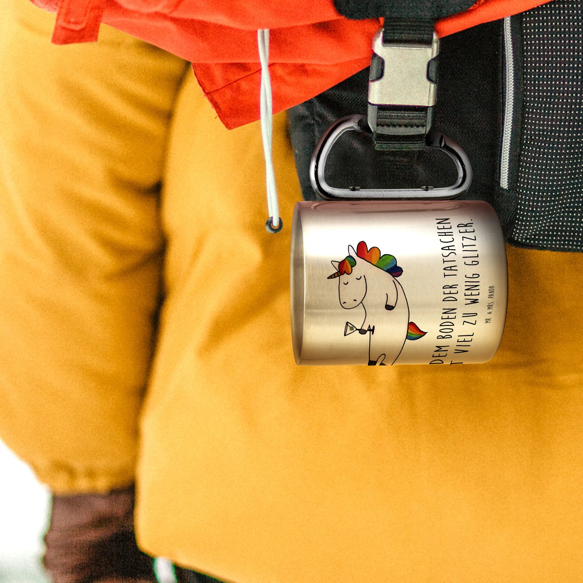 Entdecke unseren zauberhaften Edelstahlbecher "Einhorn Cocktail" aus der Einhorn-Kollektion von Mr. & Mrs. Panda! Perfekt für alle Einhorn-Fans und für besondere Anlässe, bringt er Spaß und Glitzer in jedes Getränk. Ob bei einem gemütlichen Campingausflug, einem aufregenden Festival oder einer fröhlichen Feier mit Freunden – dieser Becher ist immer mit dabei und sorgt für Freude bei jedem Schluck. Der Edelstahlbecher hat ein lustiges Motiv eines Einhorns, das zufrieden einen Cocktail in der Hand hält, und trägt den Spruch: "Auf dem Boden der Tatsachen liegt viel zu wenig Glitzer."