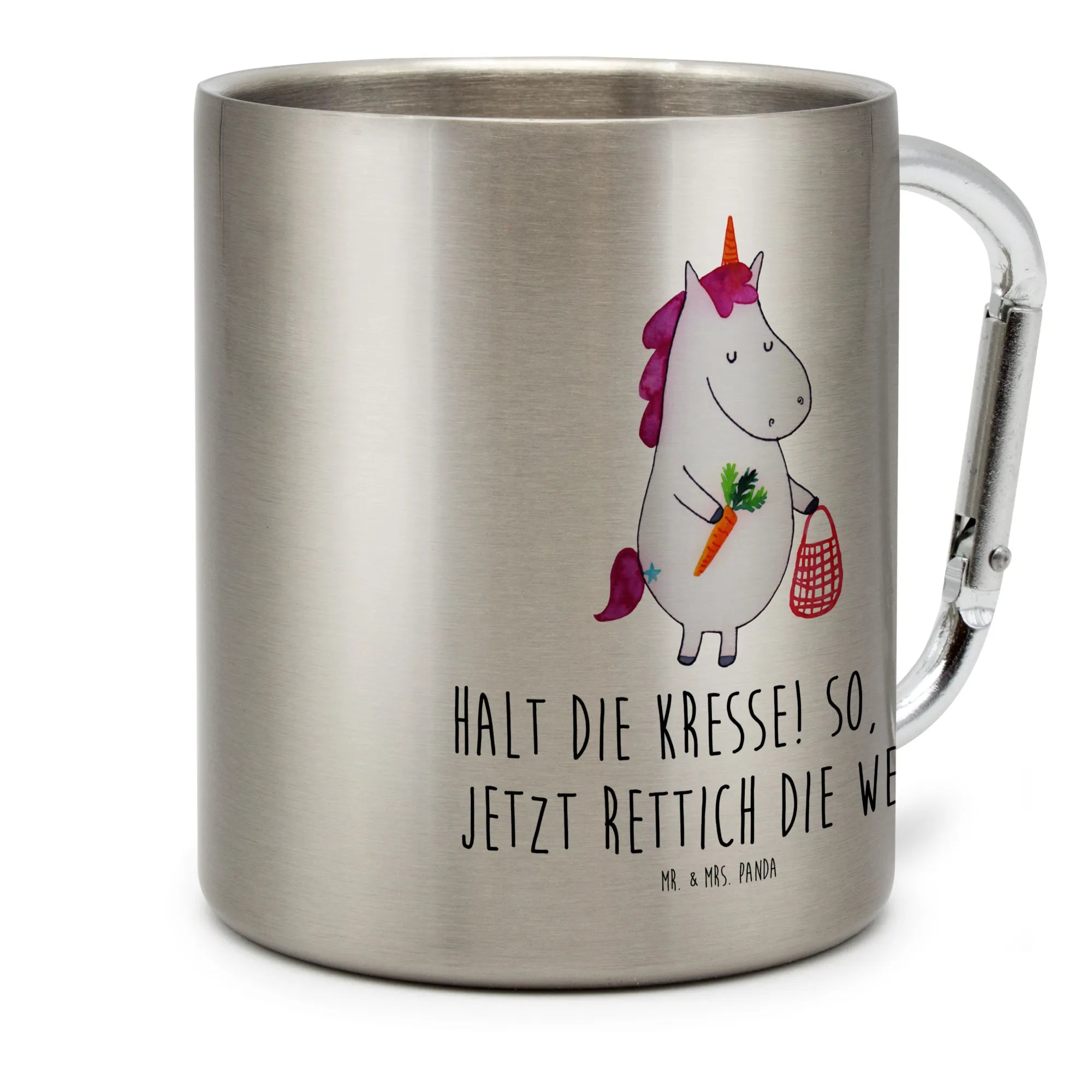 Das Design des Bechers zeigt ein niedliches Einhorn, das voller Begeisterung Gemüse vom Einkaufen mitgebracht hat, verziert mit dem spritzigen Spruch "Halt die Kresse! So, und jetzt Rettich die Welt!". Dieses einzigartige Motiv macht deinen Edelstahlbecher nicht nur zu einem praktischen Begleiter, sondern auch zu einem wahren Hingucker und Gesprächsanlass bei jedem Outdoor-Event.