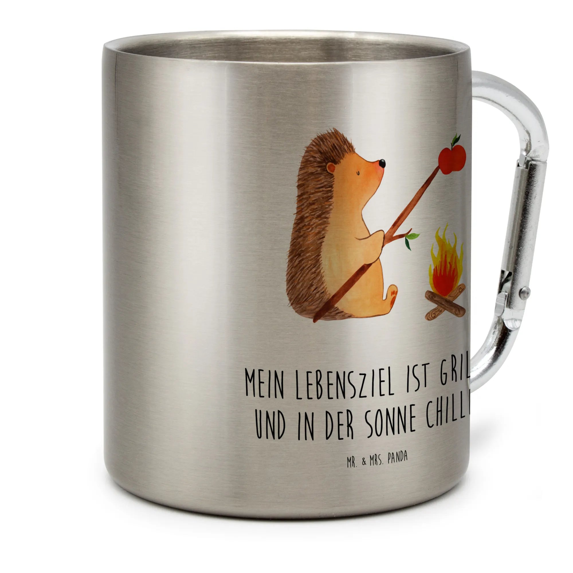Du bist ein Outdoor-Fan und liebst die Natur? Dann ist der Edelstahlbecher mit dem süßen Motiv "Igel grillt" aus der Small World Kollektion von Mr. & Mrs. Panda genau das richtige für dich! Diese wunderschöne und robuste Tasse ist nicht nur ein echter Blickfang, sondern auch unglaublich praktisch. Der Igel, der fröhlich über einem Lagerfeuer einen köstlichen Apfel grillt, bringt gute Laune und erinnert dich an all die gelungenen Grillabende in der Natur. Mit dem Spruch "Mein Lebensziel ist grillen und in der Sonne chillen" sorgt diese Tasse dafür, dass du immer an deine schönsten Erinnerungen denkst.
