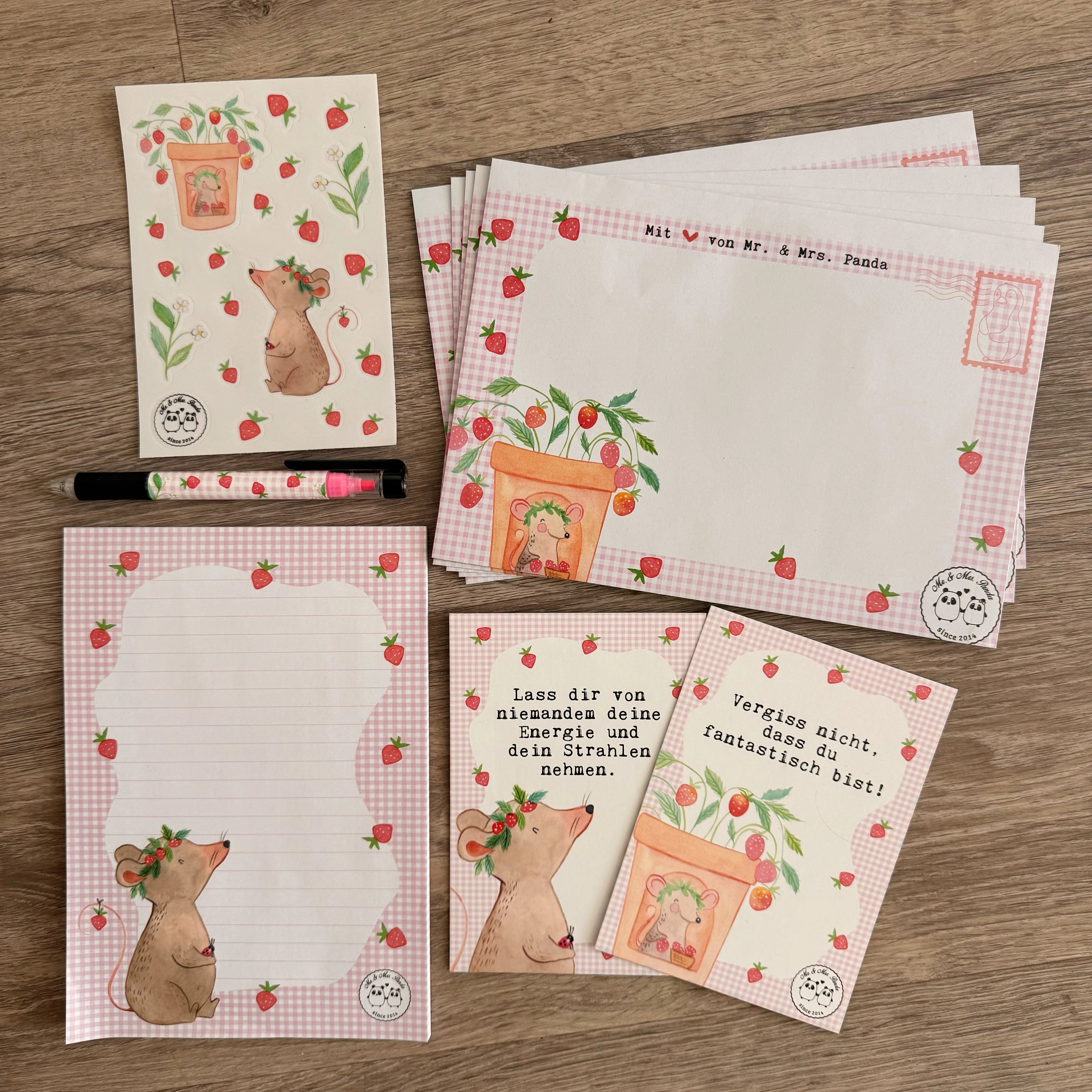 - eine Notizblock mit unserer süßen Erdbeermaus :strawberry: - 5 Briefumschläge, die eigentlich zu schön sind, um sie zu verschicken. Und sie sind größer als normale Briefumschläge. Da passen also auch g1esammelte Lieblingsstücke wie Federn rein