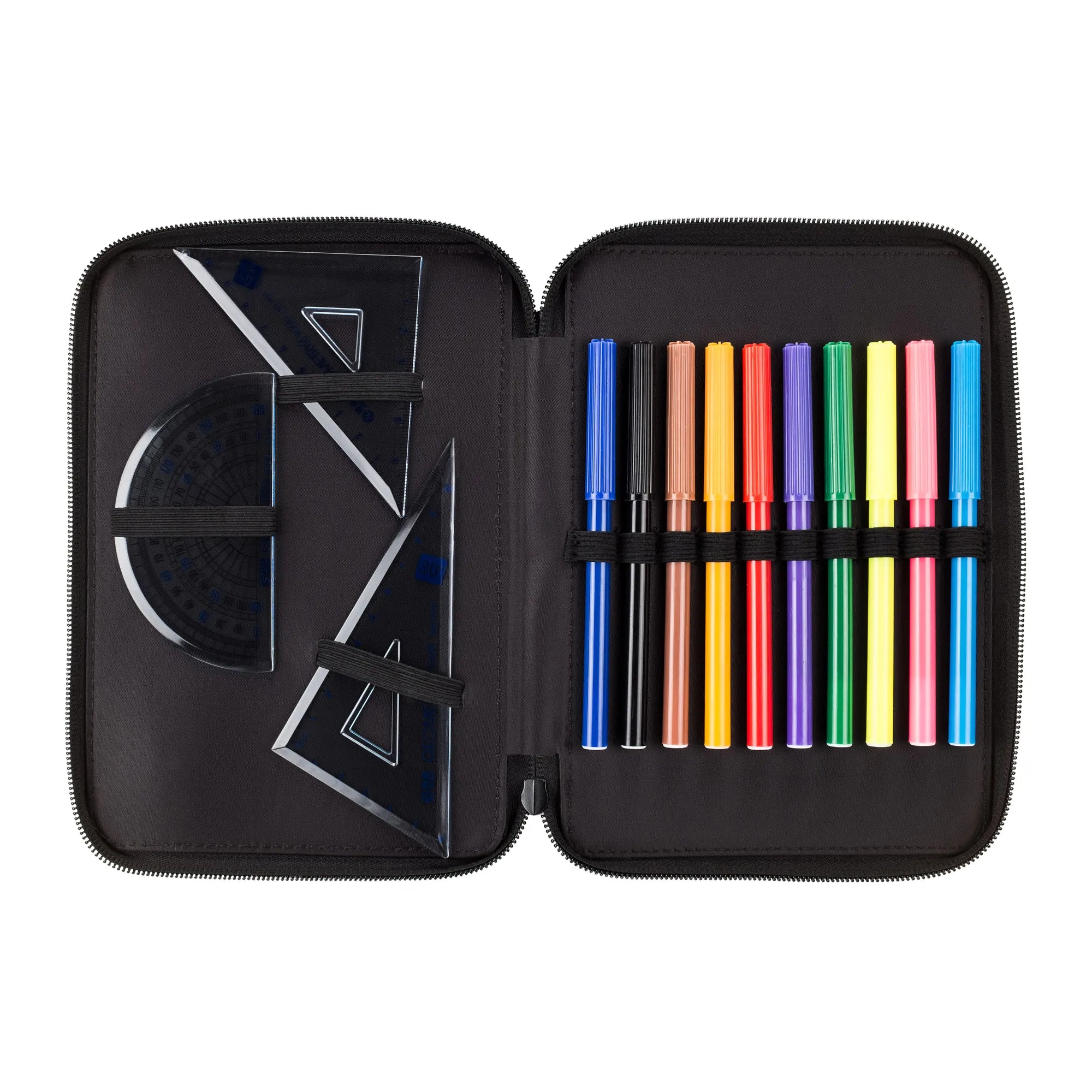 Die Federmappe ist komplett ausgestattet und enthält nicht nur Platz für all deine Buntstifte, Filzstifte und Bleistifte, sondern bringt auch einen Radiergummi, einen Spitzer und ein Lineal mit! Somit hast du alles, was du für den Unterricht brauchst, griffbereit und ordentlich verstaut.