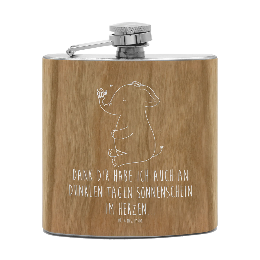 Entdecke den perfekten Flachmann von Mr. & Mrs. Panda mit dem zauberhaften Motiv von Elefant und Biene! Dieser hochwertige Flachmann aus Edelstahl ist nicht nur funktional, sondern auch ein echter Hingucker. Mit einem Füllvolumen von 150 ml ist er ideal für alle, die gerne unterwegs sind, ob beim Wandern, beim Picknick oder einfach beim Feiern mit Freunden. Die edle Edelstahl-Oberfläche ist mit einem wunderschönen Holzlaminat ummantelt, das diesem Flachmann eine ganz besondere Note verleiht.